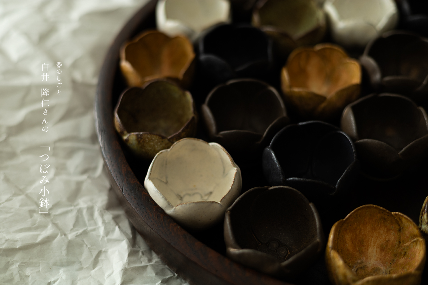 2024年に開催いたしました「晩酌の器展」では、日常のひとときを大切にするための酒器に焦点を当てました。今回の企画展「酒と肴の器」では、その晩酌の時間を、もう一歩深く。よりシンプルにお酒と肴の関係性に焦点を絞りました。