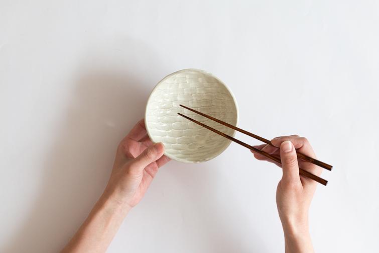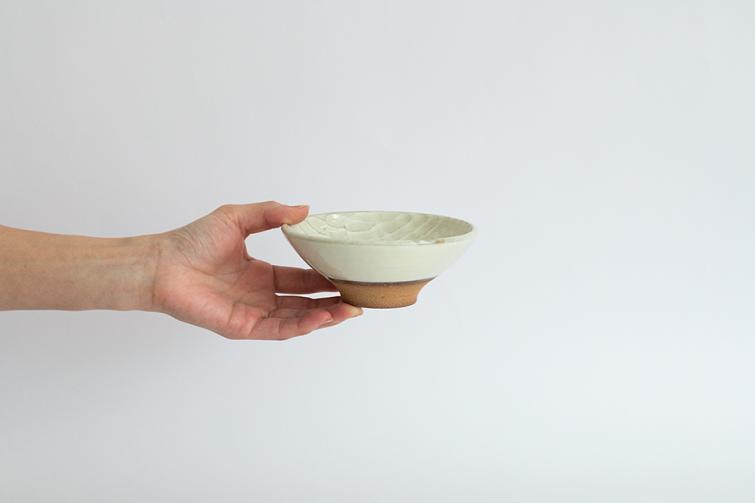 木彫を思わせるようなしのぎを内側に施した小鉢です。横から見える高台の素地の色とのバランスも美しい作品です。