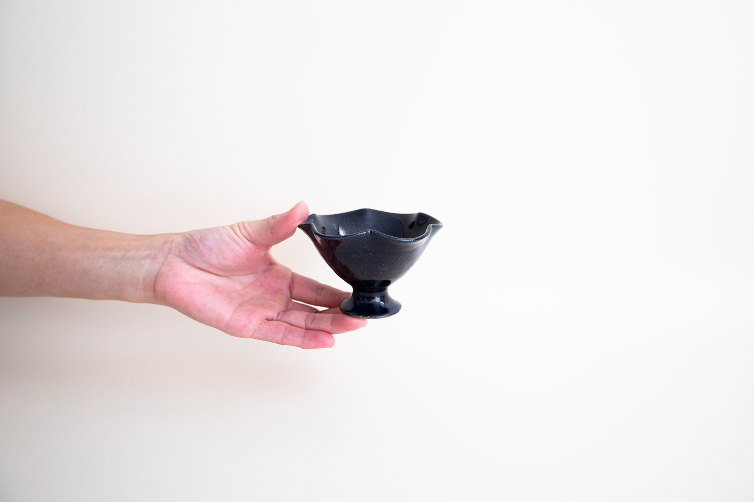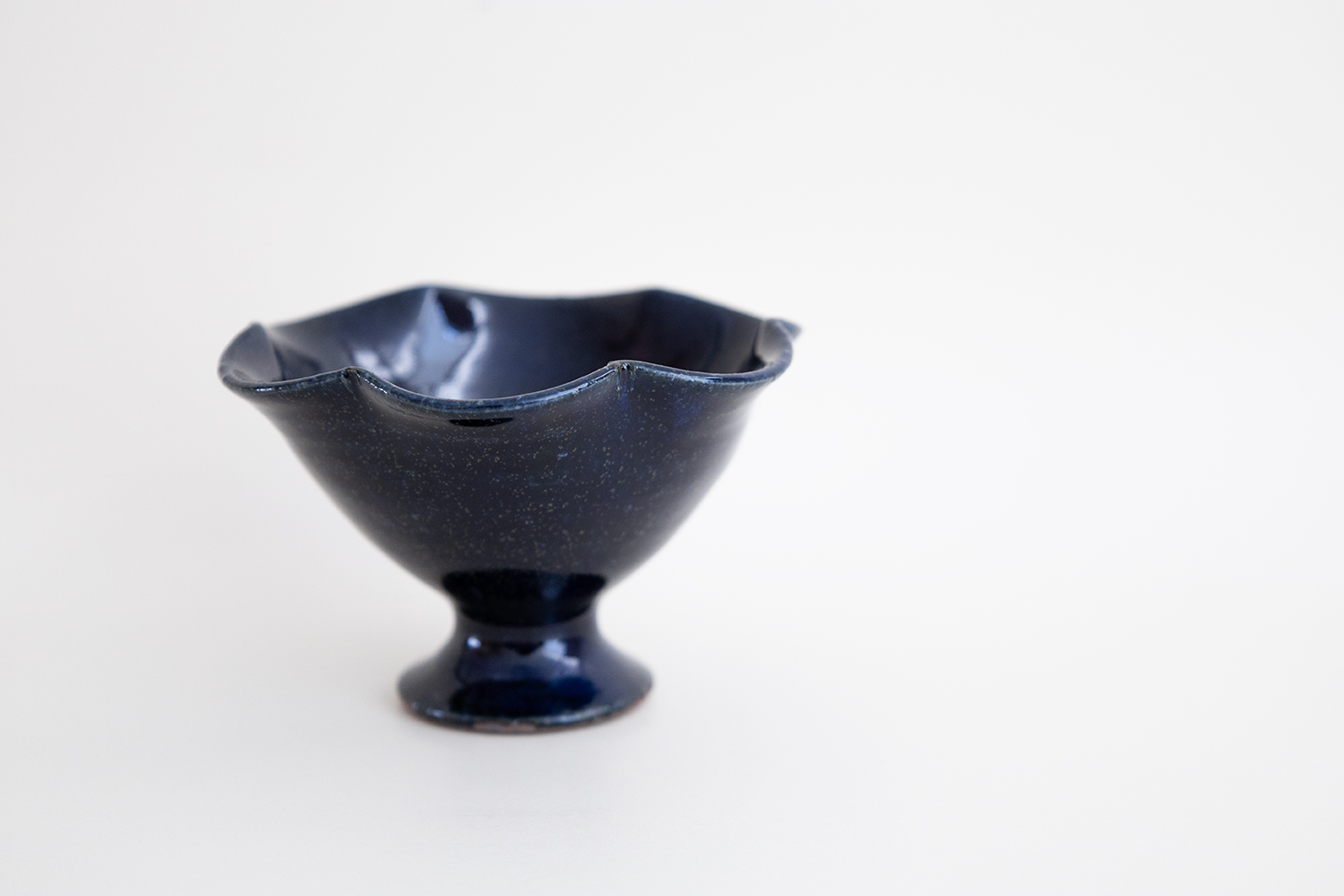 高台付きの輪花豆鉢です。豆鉢としてはもちろん、ヨーグルトや冷たいデザートにもピッタリです。高さがあるのでプレートの上にものせてお使いいただけます。深い瑠璃色は自然光では青っぽく、室内では濃紺に写ります。