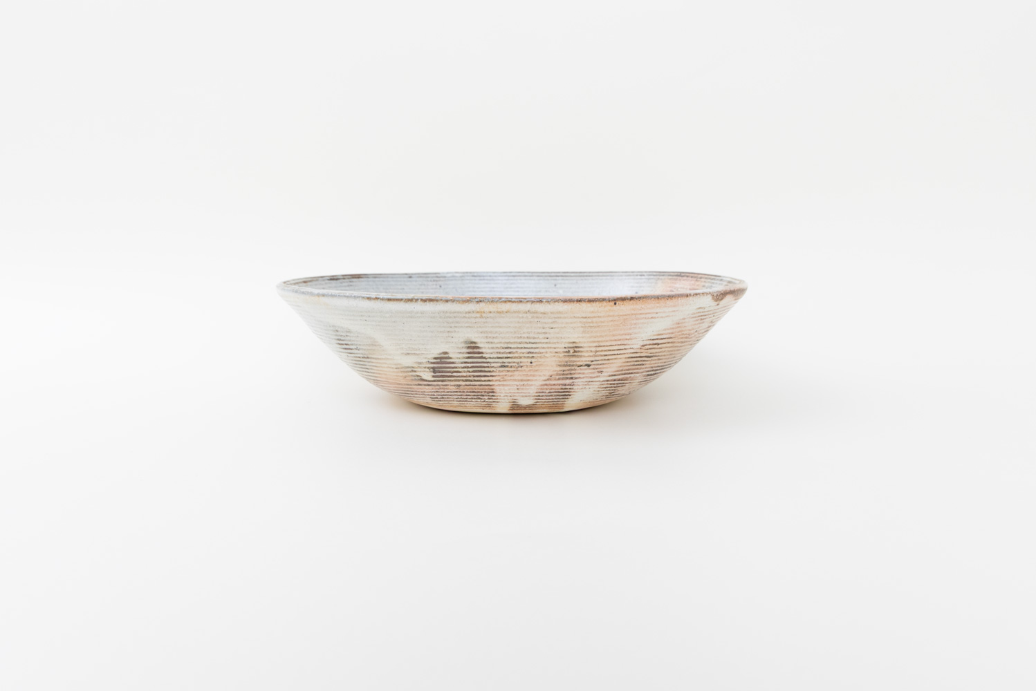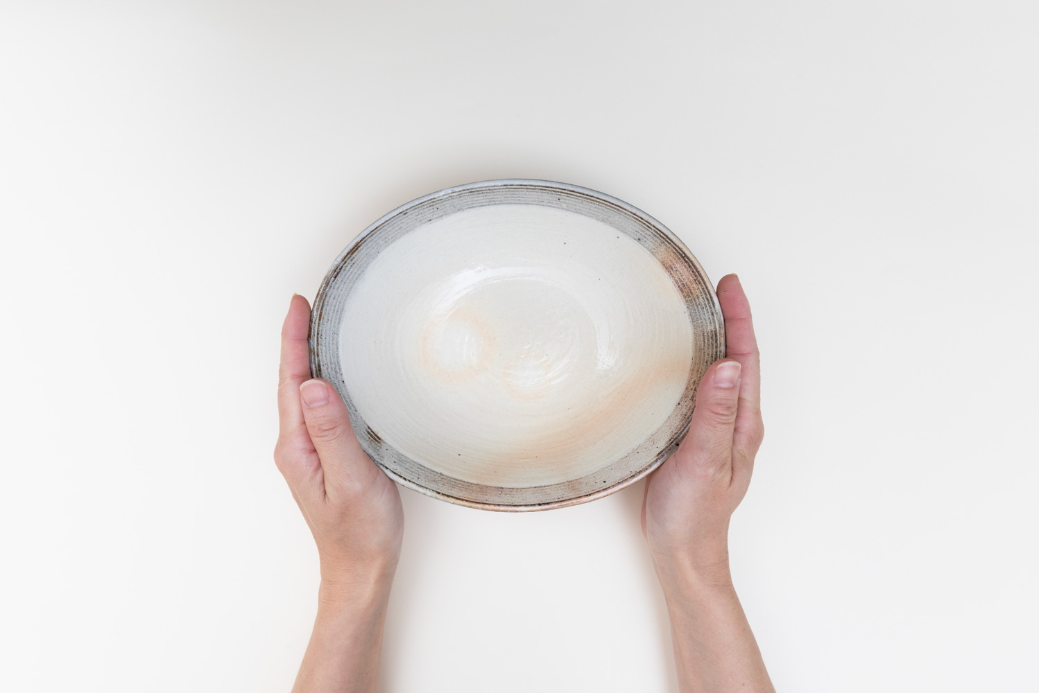 縁には荒々しく刻まれた横彫が力強いアクセントとなった楕円の深鉢です。横彫のラインはデザインのアクセント以外にも滑りにくく持ちやすい利点もあります。煮物、サラダ、炒め物、パスタ、汁気のある料理など何にでも使える万能さが魅力です。