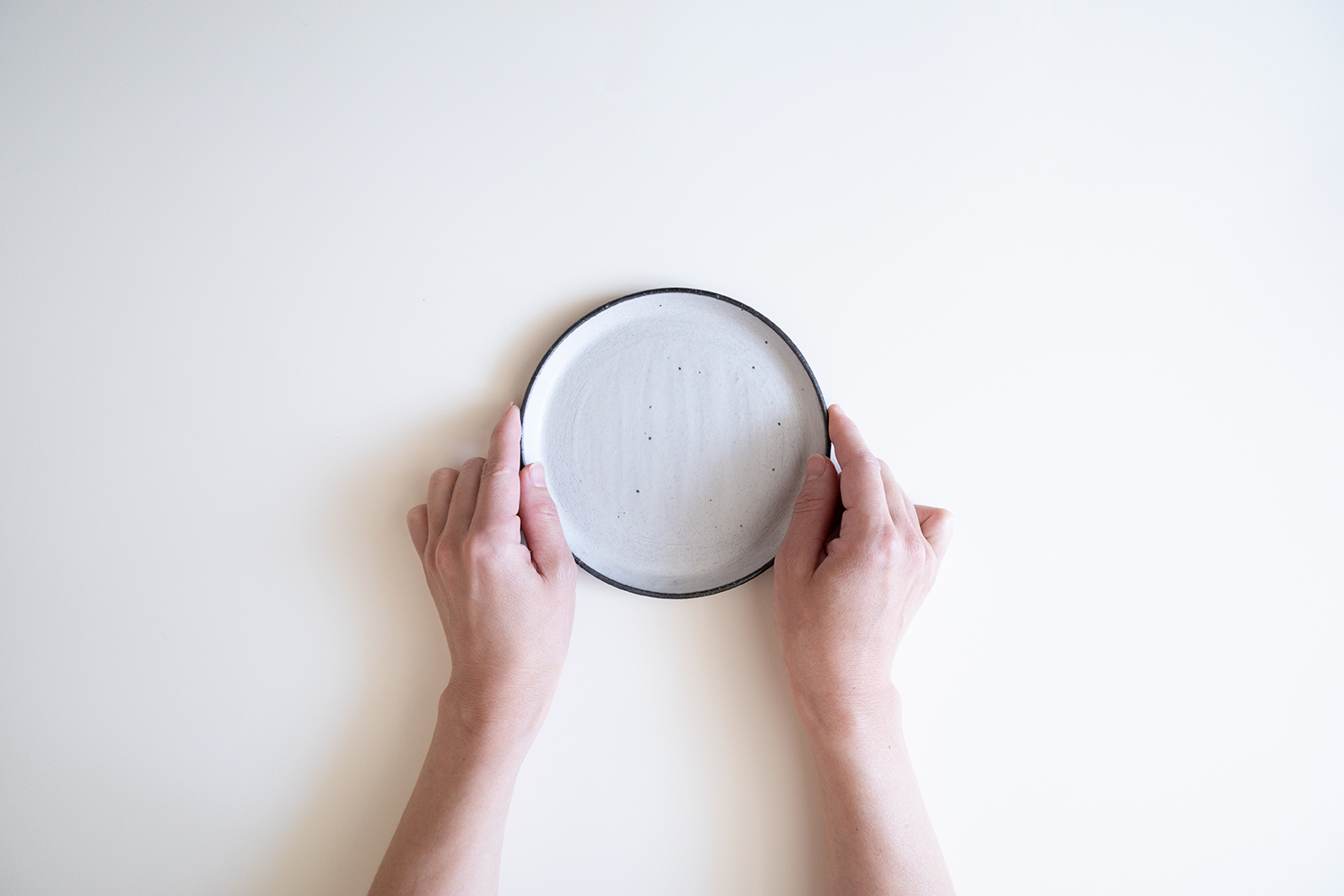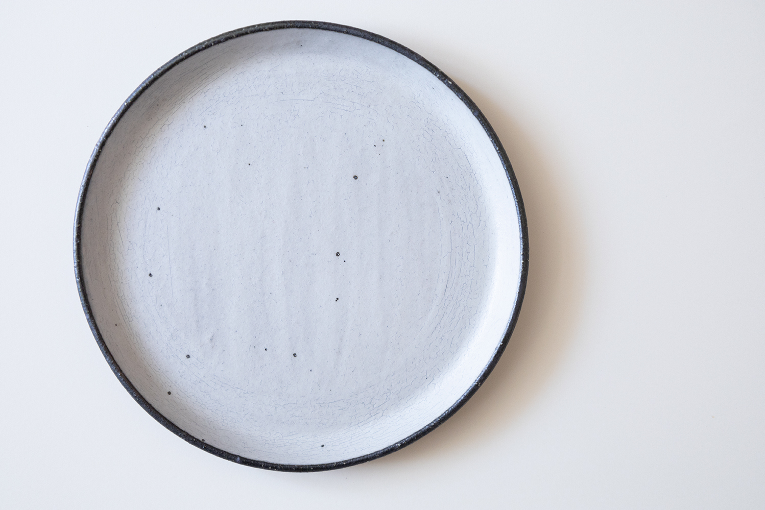 シンプルなフラットタイプのお皿です。刷毛目と鉄点のシックな表情は和洋どちらにもよく似合います。見た目以上に軽く扱いやすいのもポイントです。