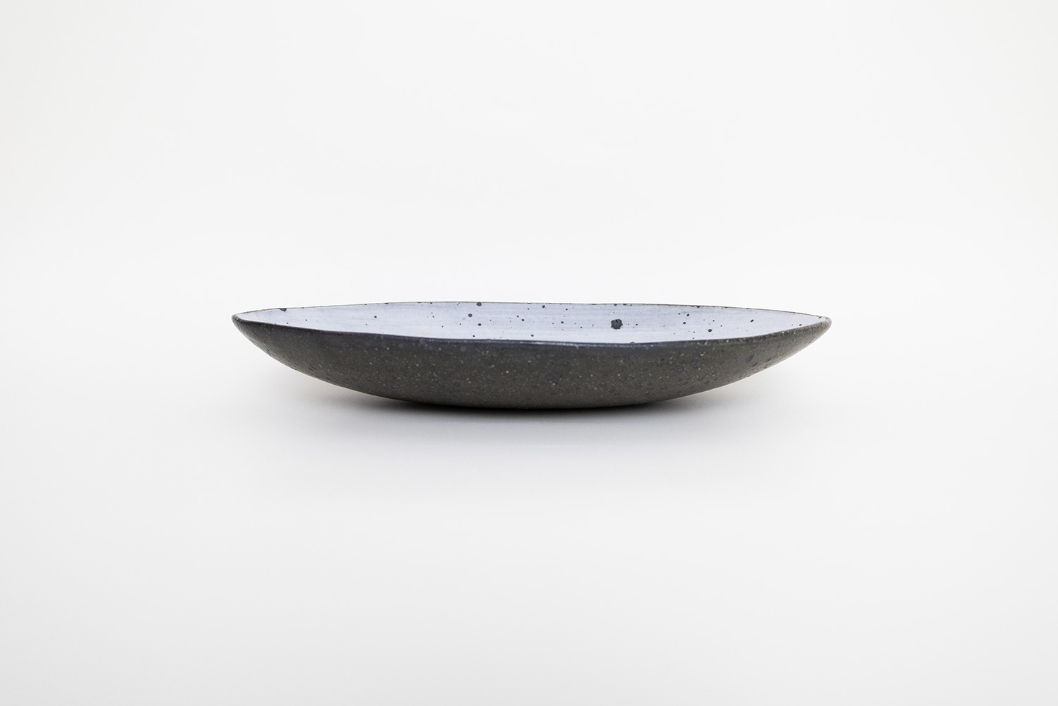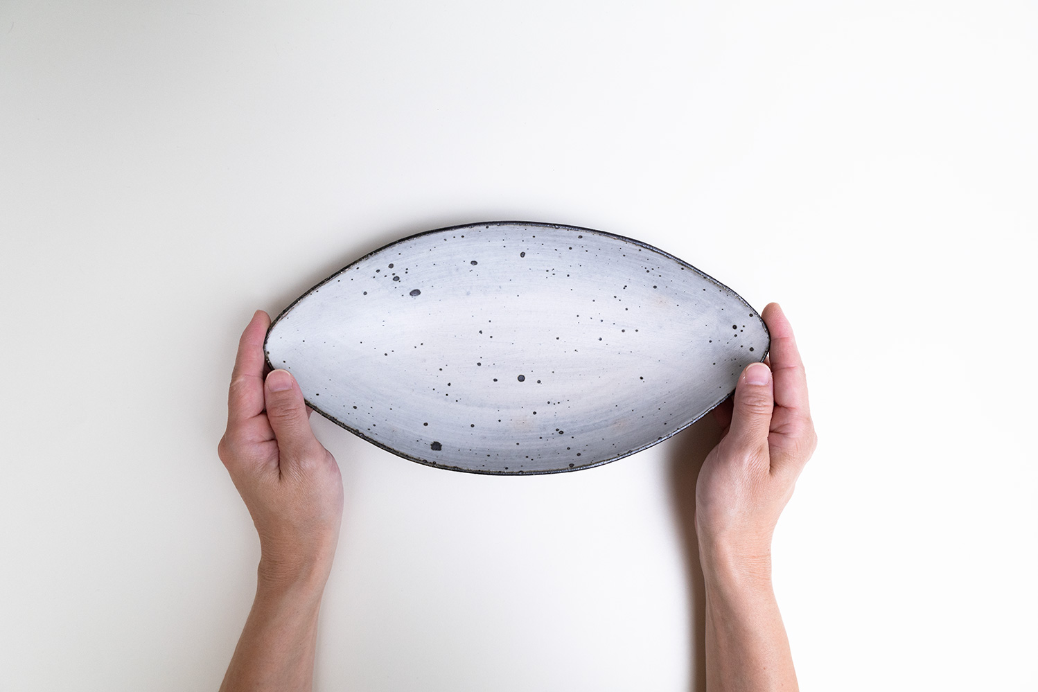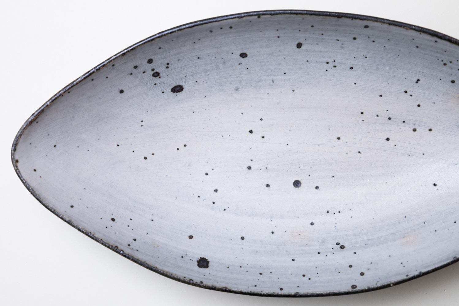 アーモンドのような形の器です。刷毛目と鉄点のシックな表情は和洋どちらにもよく似合います。適度な深さもあり、パスタや麺物、カレー皿としてもお使いいただけます。