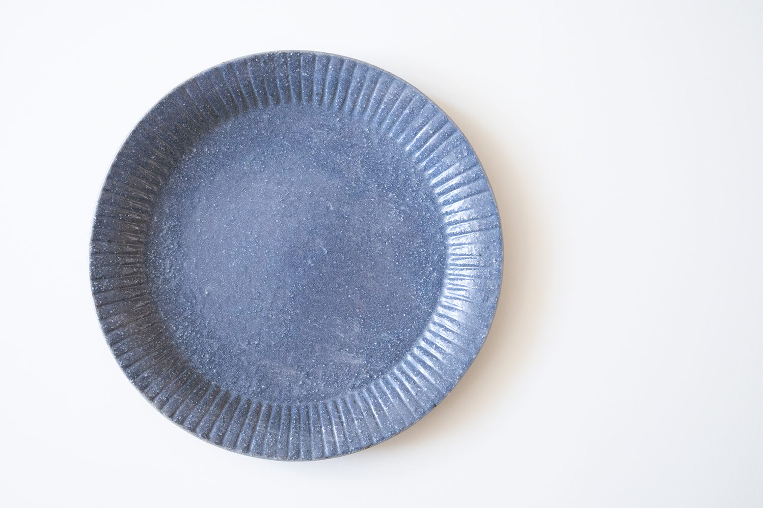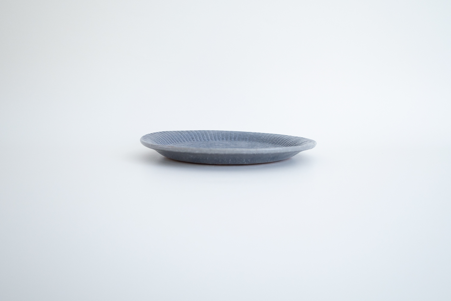 グレー釉のラッフルプレートのMサイズです。我が家でも毎日パン皿として活躍しているサイズです。用途に合わせてお選び頂けるS・M・Lの3種類をご用意いたしております。