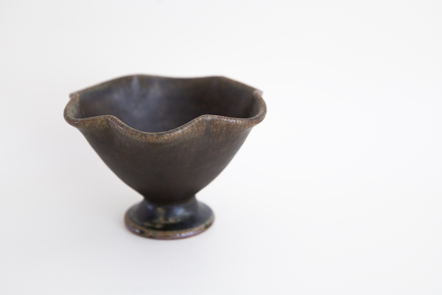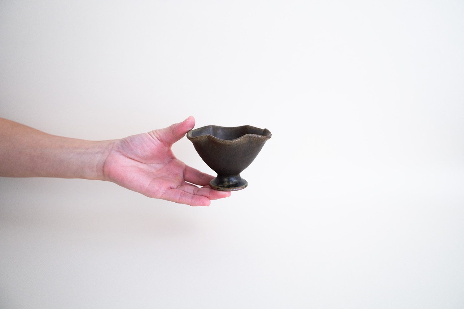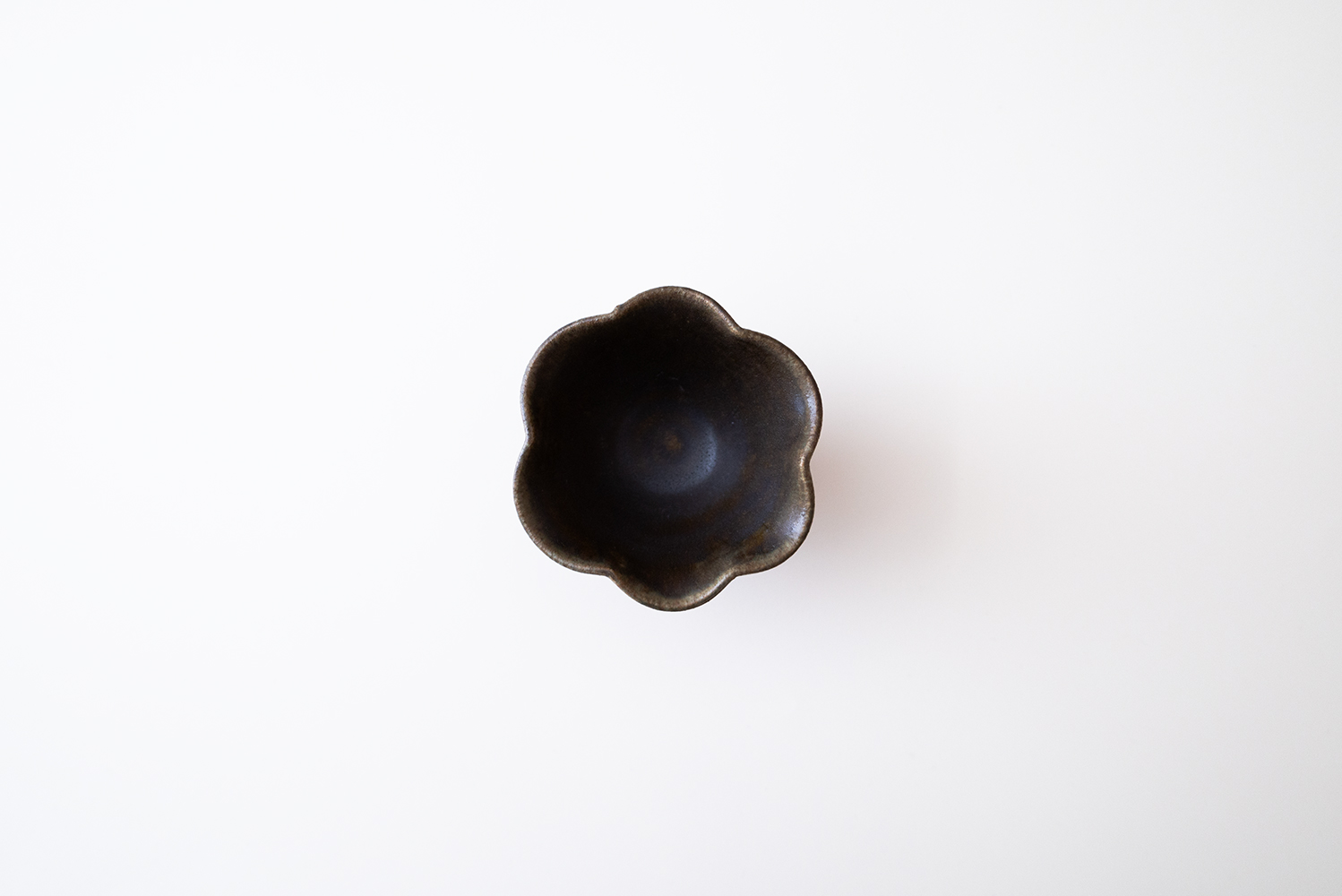 高台付きの輪花豆鉢です。豆鉢としてはもちろん、ヨーグルトや冷たいデザートにもピッタリです。高さがあるのでプレートの上にものせてお使いいただけます。錆釉の器は、深く濃い茶色と所々見られる淡い茶色の濃淡が印象的で、土物らしい味と趣を感じることができます。濃いめのお色は、盛り付けたお料理をグッと引き締めて見せてくれます。