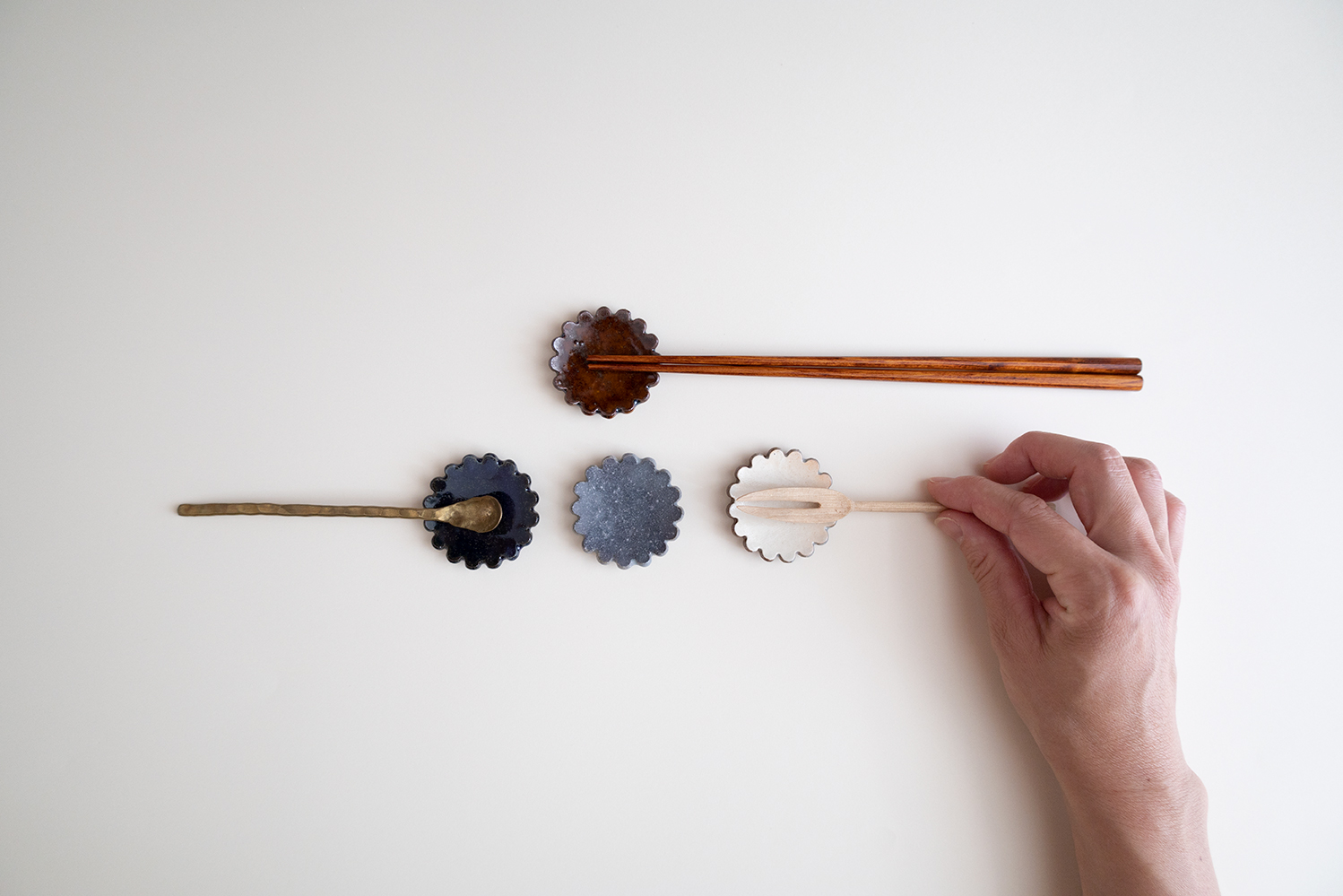 お花の形が可愛らしい箸置きです。箸置きやスプーン・フォークレスト、などにもお使いいただけます。