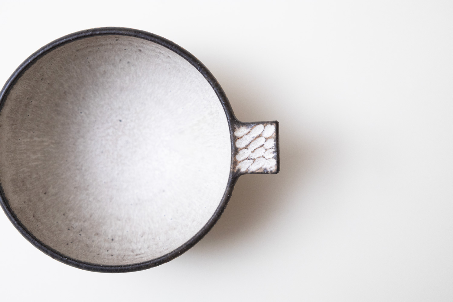 耳付のウツワってかわいいですね。こちらの作品にはさらに持ち手にしのぎが入っています。内側の釉薬の表情もとても魅力的です。シンプルな形なのでサラダボウルやグラノーラカップなどにもお使いいただけます。