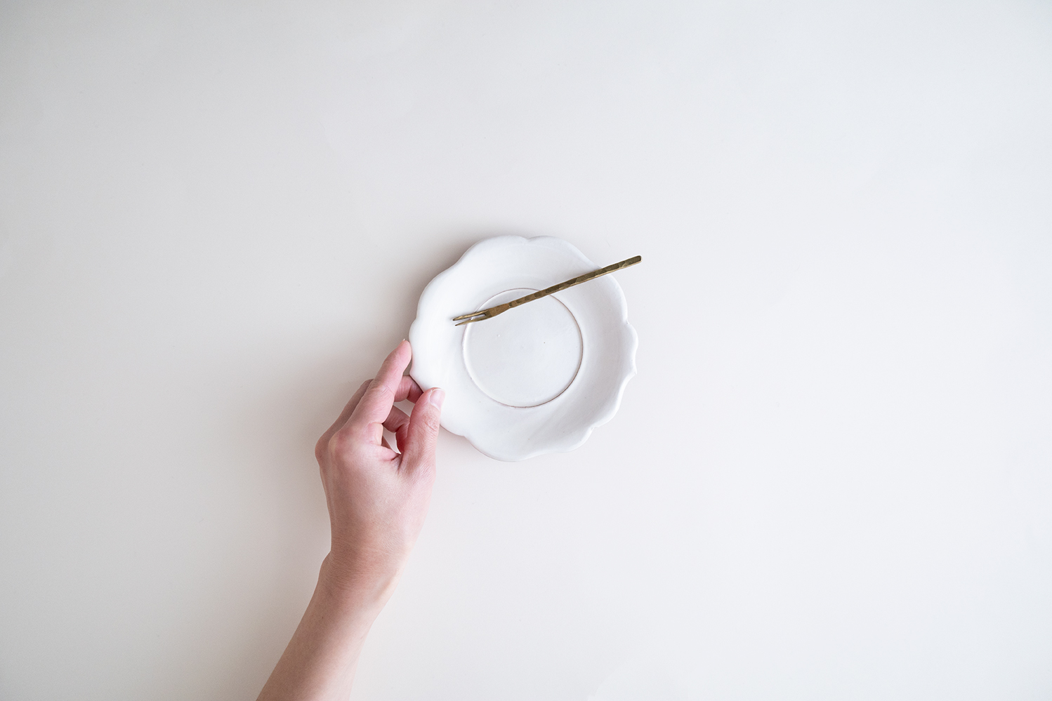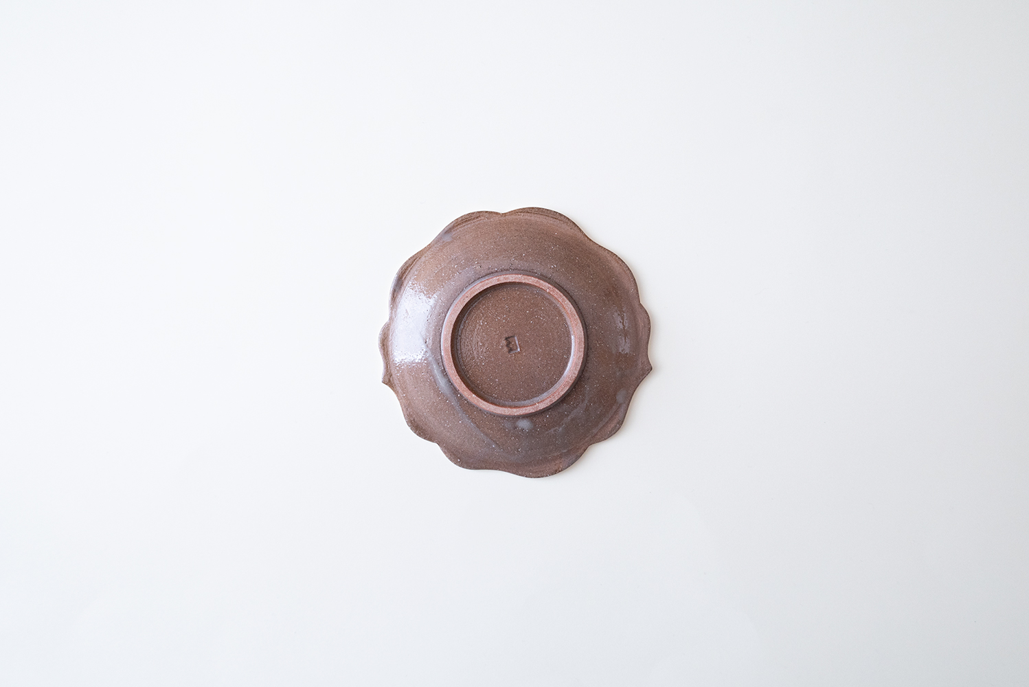 ふんわりとした柔らかな形の輪花のお皿です。2箇所ある尖りが柔らかすぎず、落ち着きある佇まいを感じさせます。
