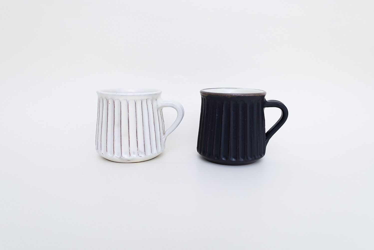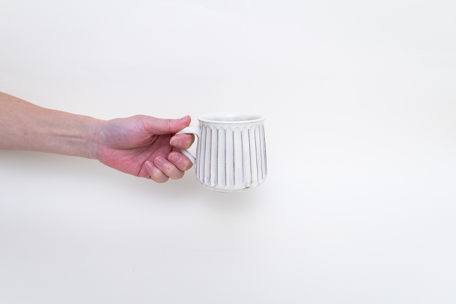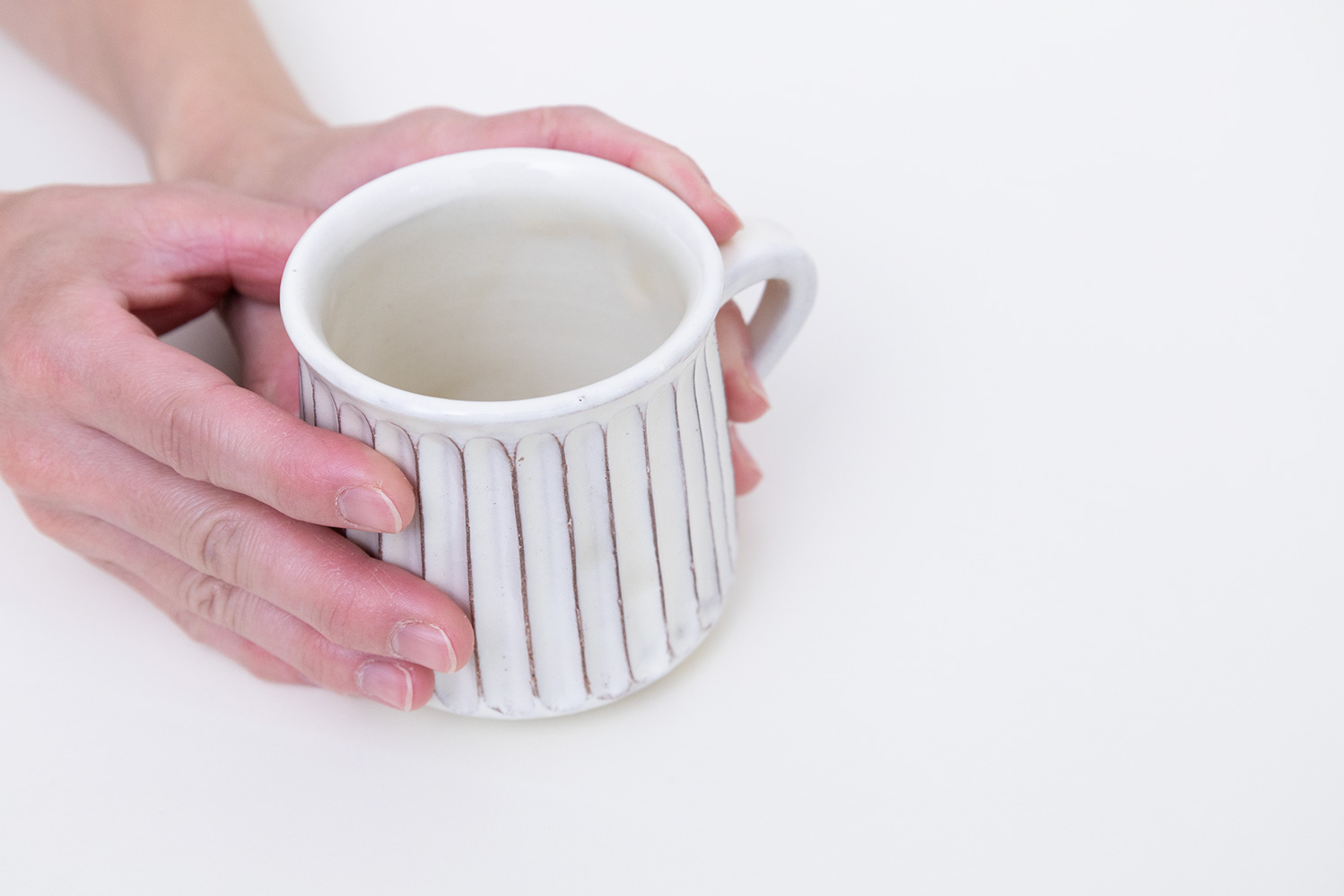 台形型の安定感のあるマグカップです。こういう形のマグカップはどっしりとした感じのものが多いのですが、こちらのフレアマグはしのぎの効果でスッキリと軽やかな印象です。