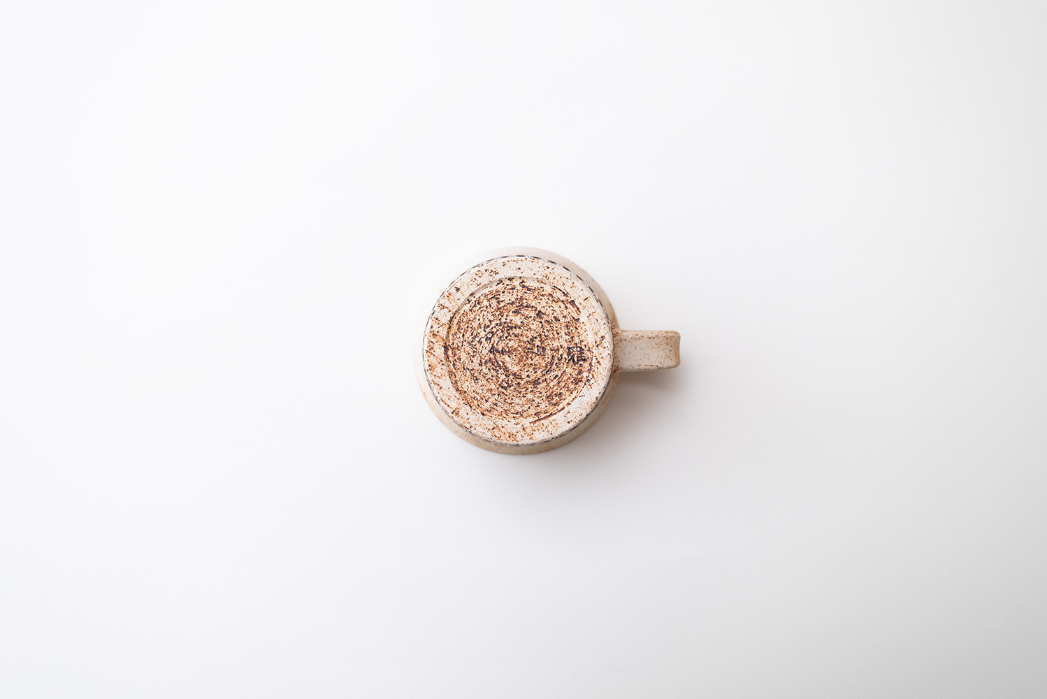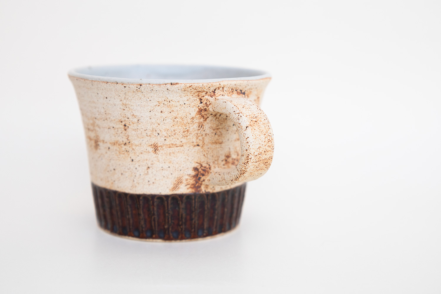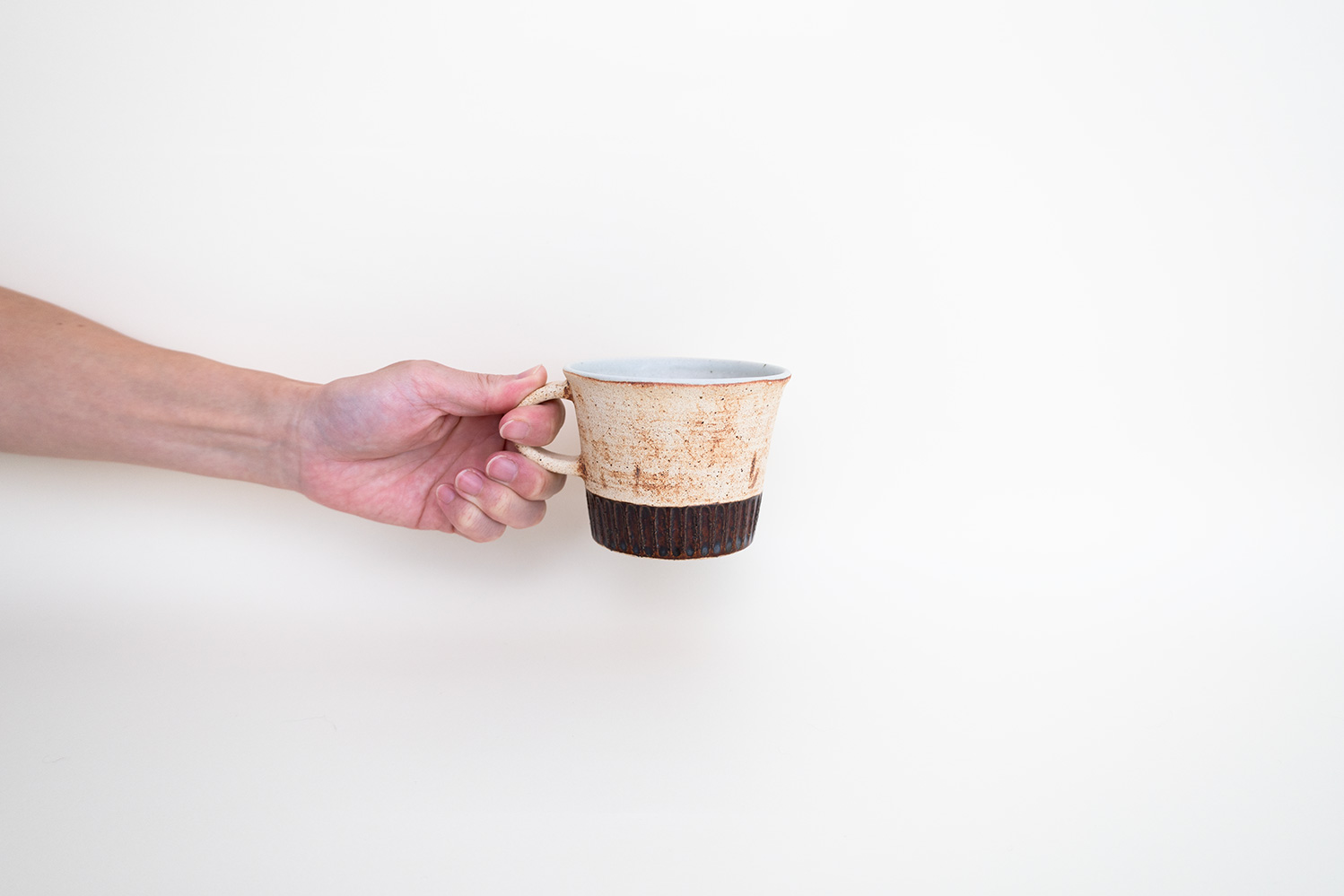 中川さんの代表的な作風のコルクと同じ素地に、しのぎと釉薬で色分けされた手の込んだマグカップです。