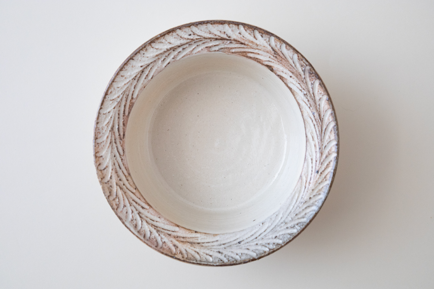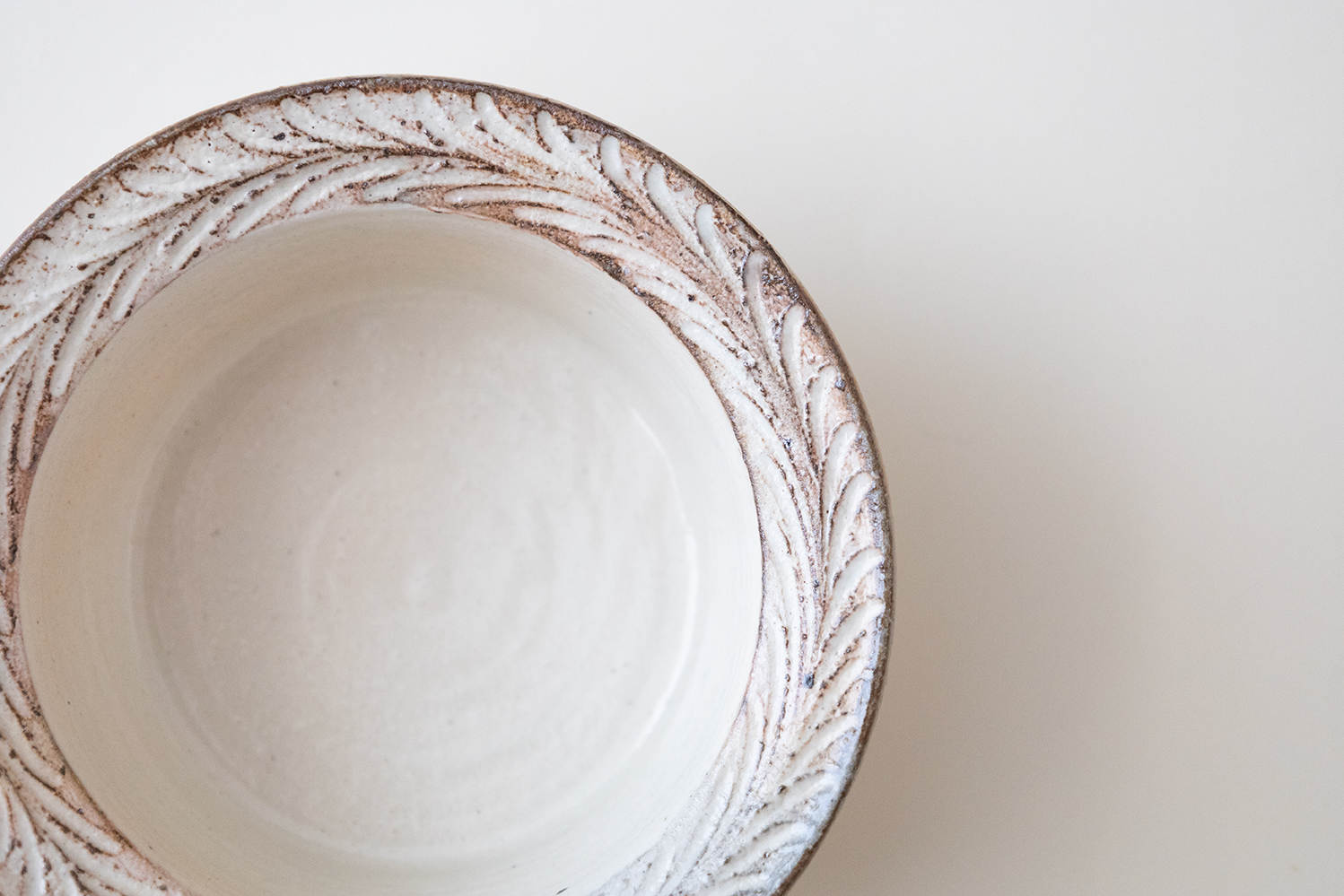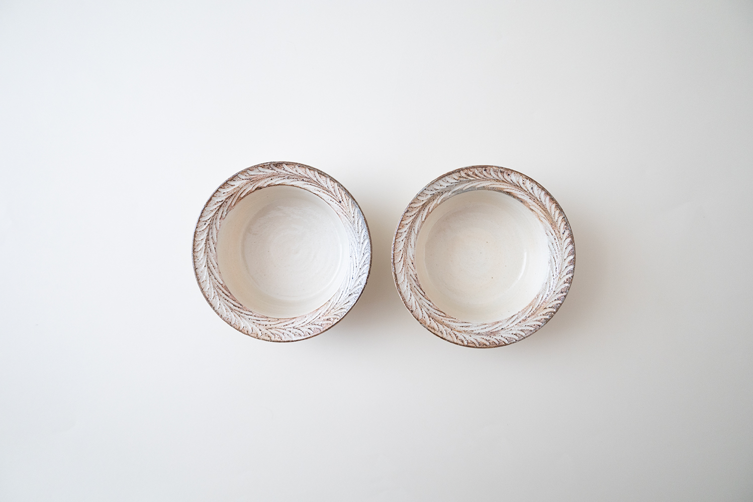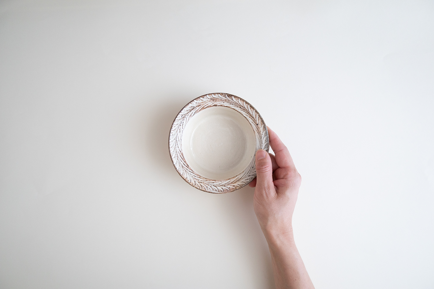 古谷さんの定番の渕荒粉引シリーズに新しくリーフしのぎのタイプが新登場です。しのぎ模様がとても良いアクセントになっています。
