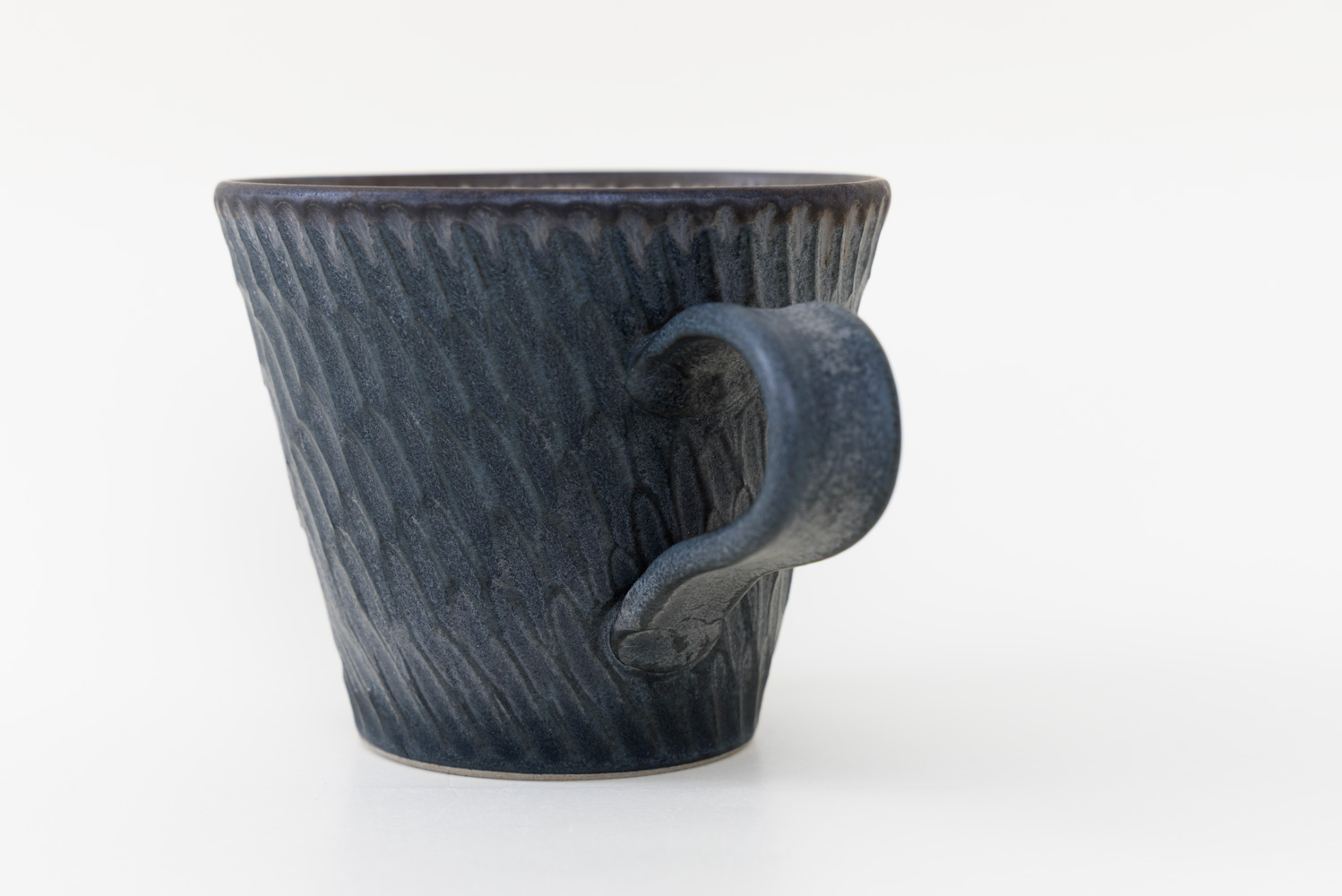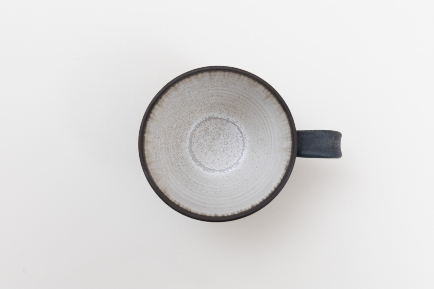 口元がすっと立ち上がる切立のフォルムは、端正で落ち着いた佇まい。飲み口の広がりが程よく、口当たりもよく仕上がっています。大きめのサイズ感で、たっぷりと入る容量。コーヒーやカフェオレ、ミルクティーなど、日常の一杯をゆったりと楽しめます。