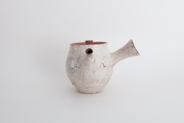 ざらりとした釉薬から見える素地の表情や飛び回るように描かれた線模様からはどこか懐かしさを感じさせます。全体のバランスとフォルムがとても可愛く、愛着ある急須です。