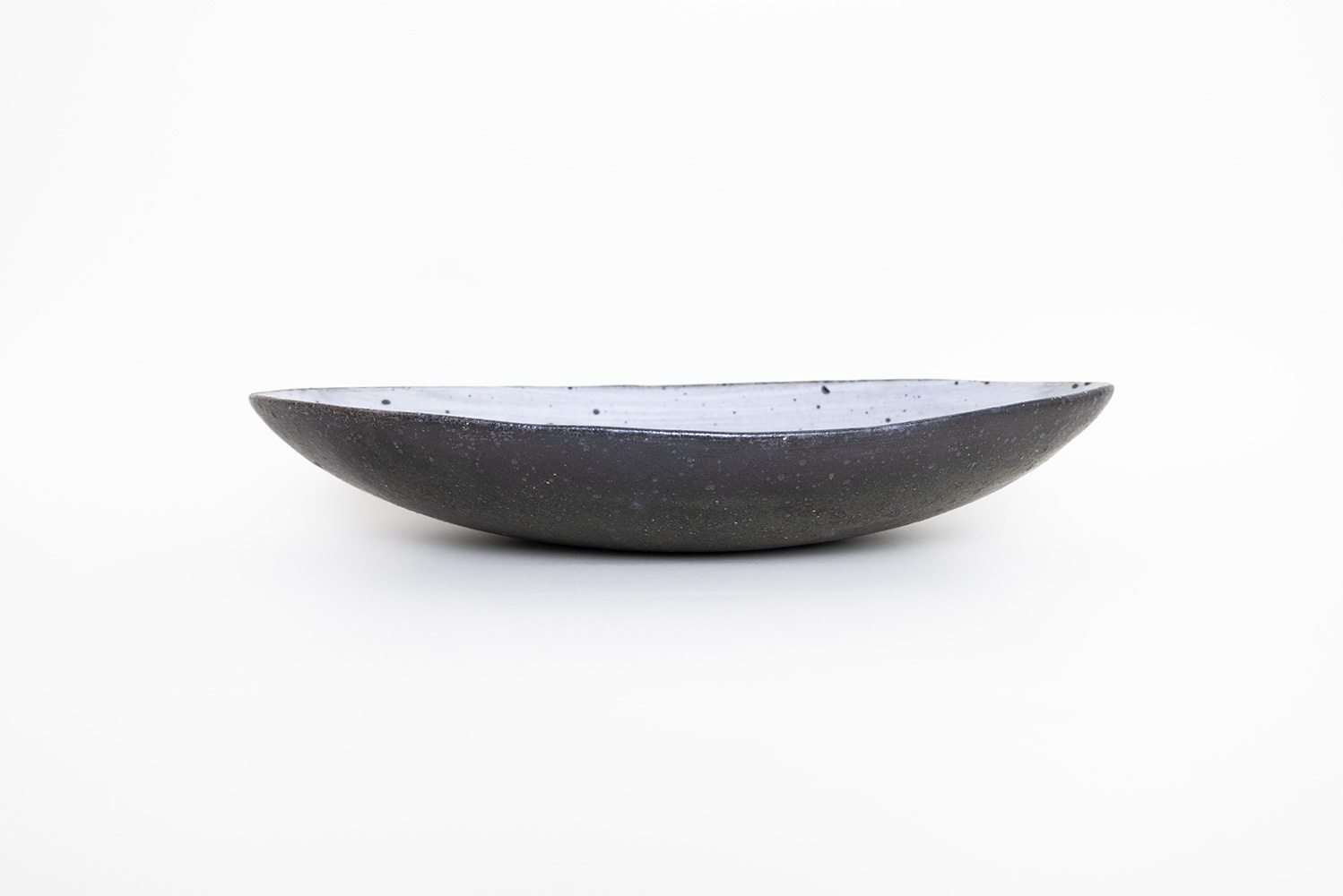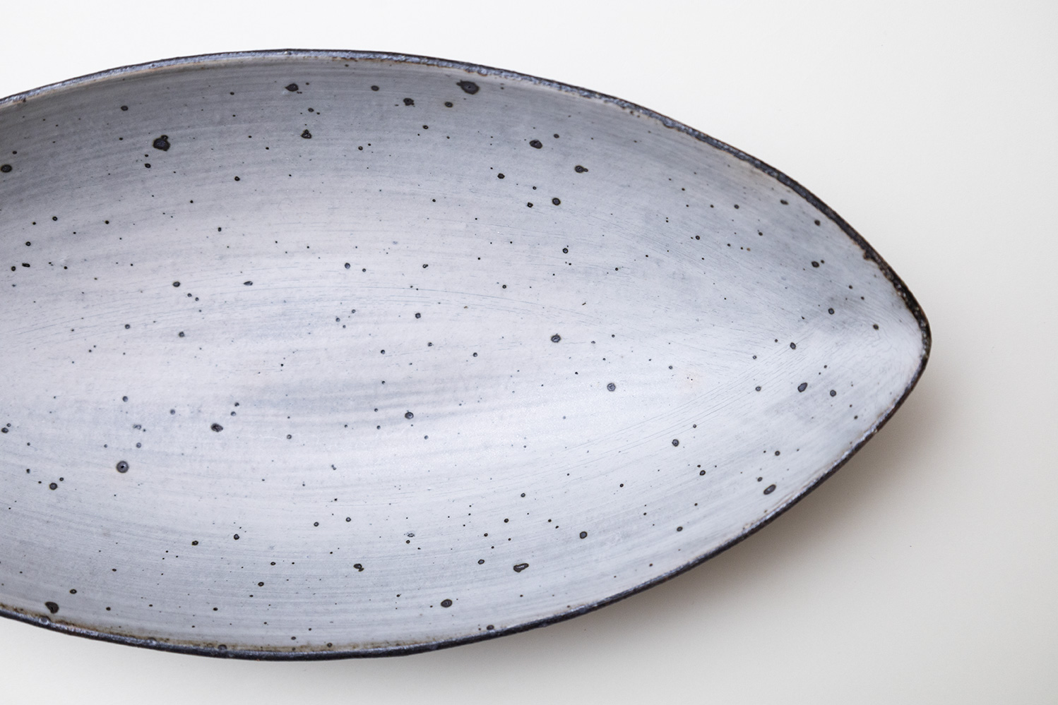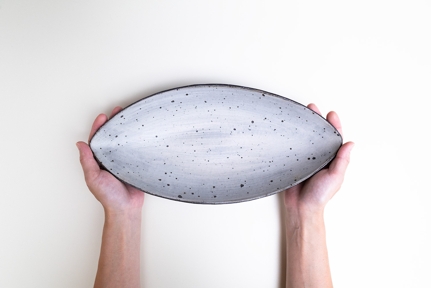 アーモンドのような形の器です。刷毛目と鉄点のシックな表情は和洋どちらにもよく似合います。しっかりと高さがあり、パスタや麺物、カレー皿はもちろん、盛り鉢としてもお使いいただけます。