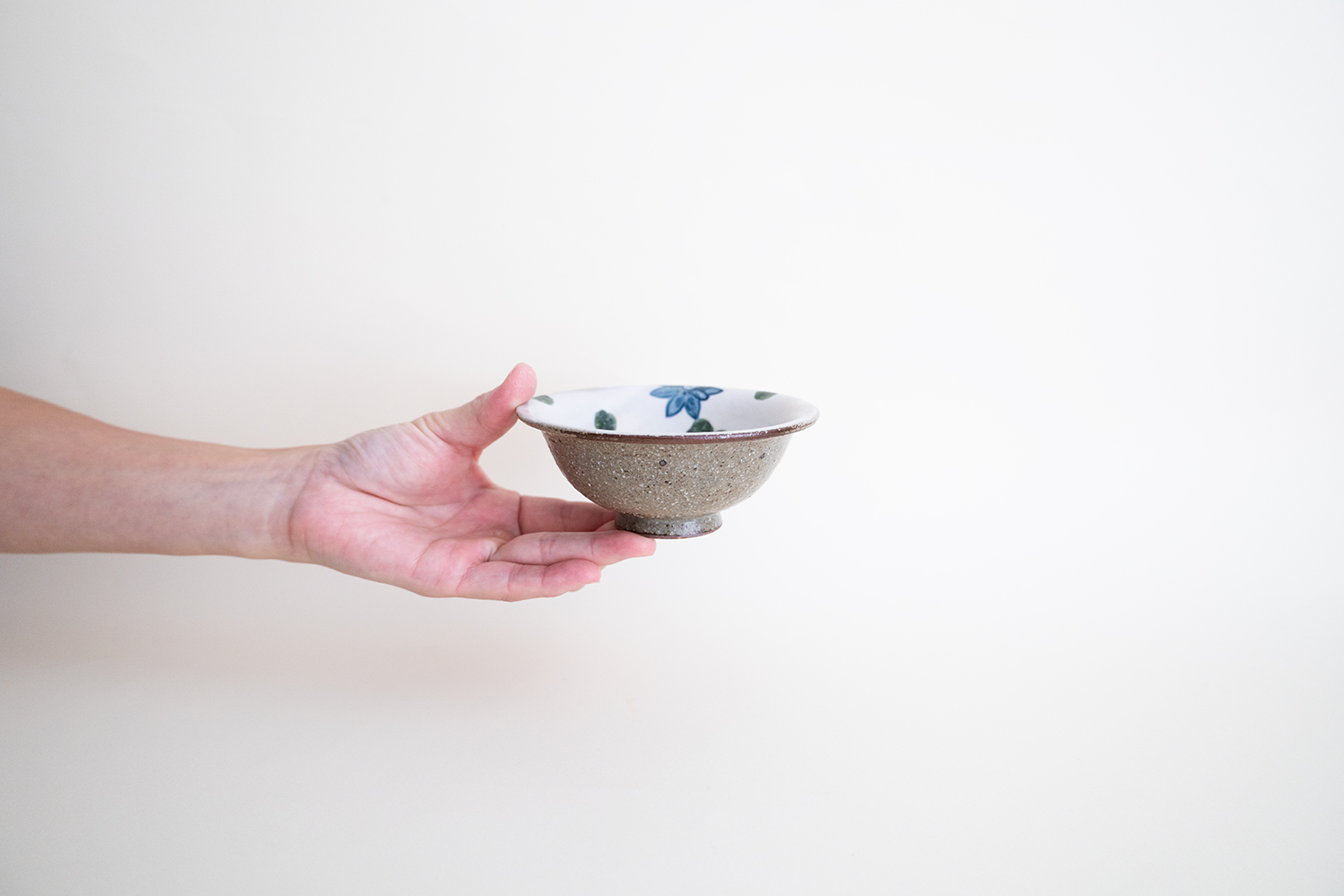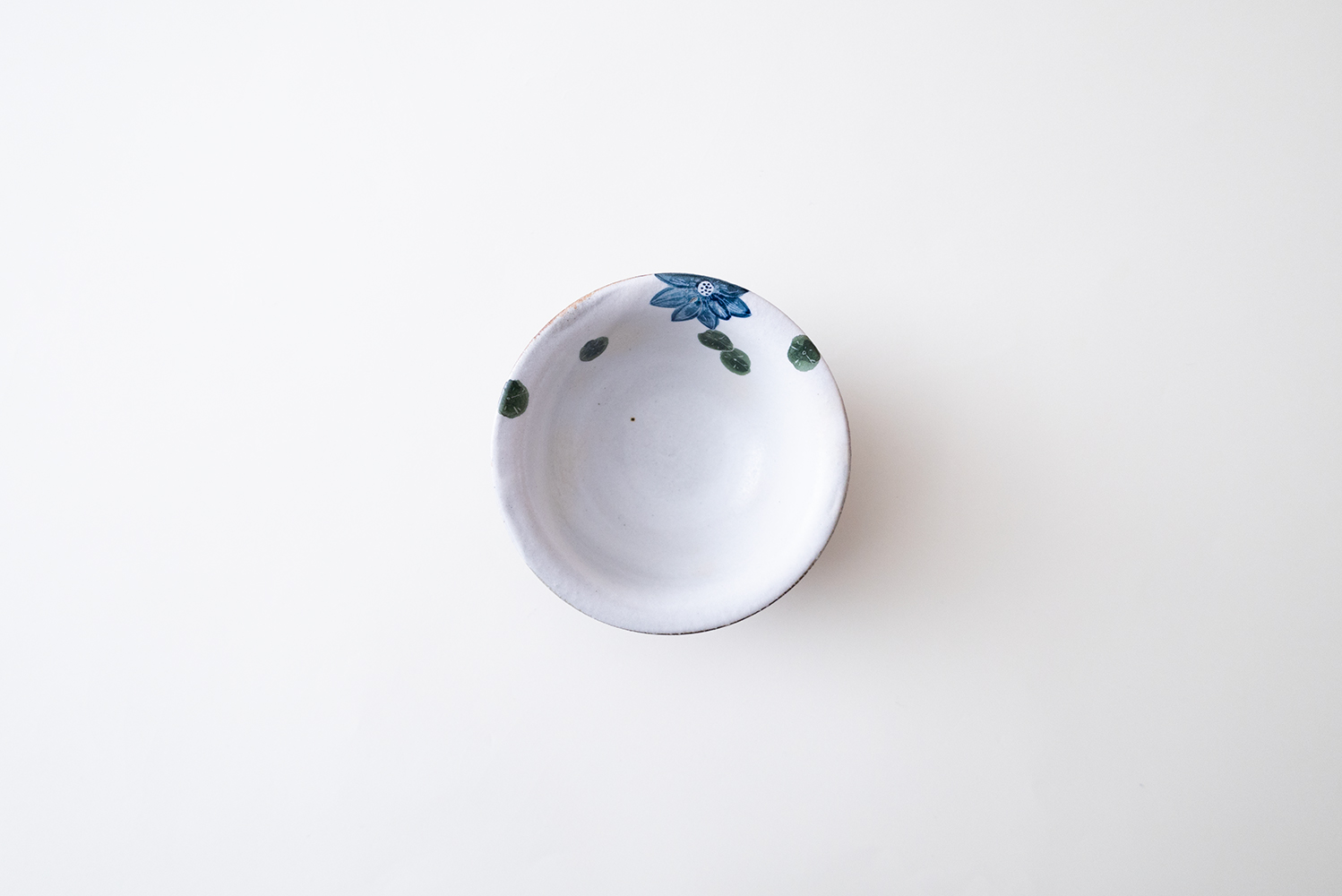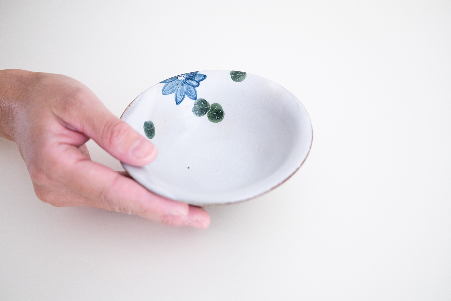 水面に浮かぶ水草が描かれた少し浅い目の飯碗です。ご飯をふんわりと綺麗に盛り付けられます。