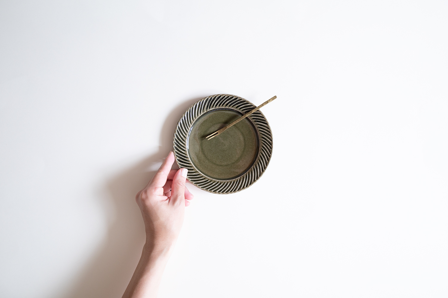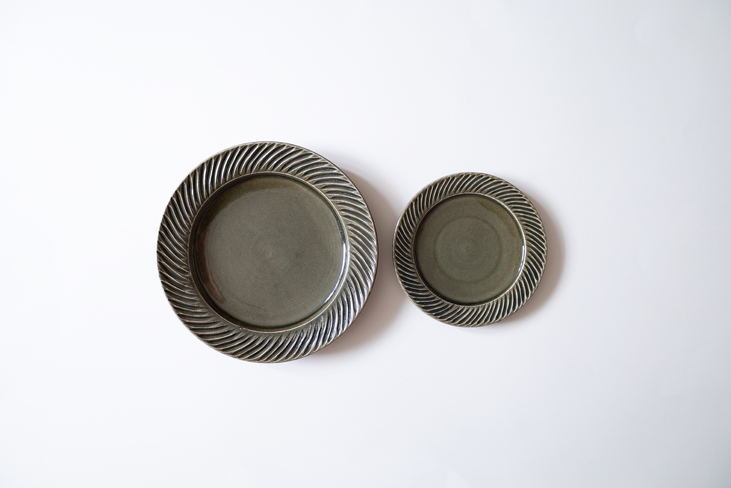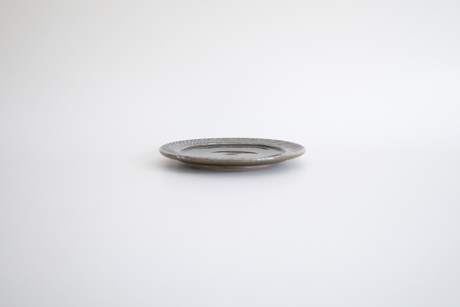 内側の縁に動きのあるしのぎが施された5寸のリム皿です。しのぎひとつひとつは1枚の葉のような躍動感も感じられます。飴色とも相性の良い落ち着いた緑色もとても綺麗です。取り皿としてや小さなお菓子を載せてもかわいいです。