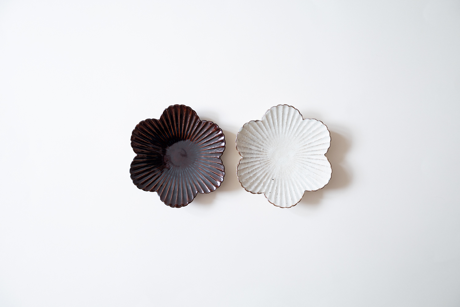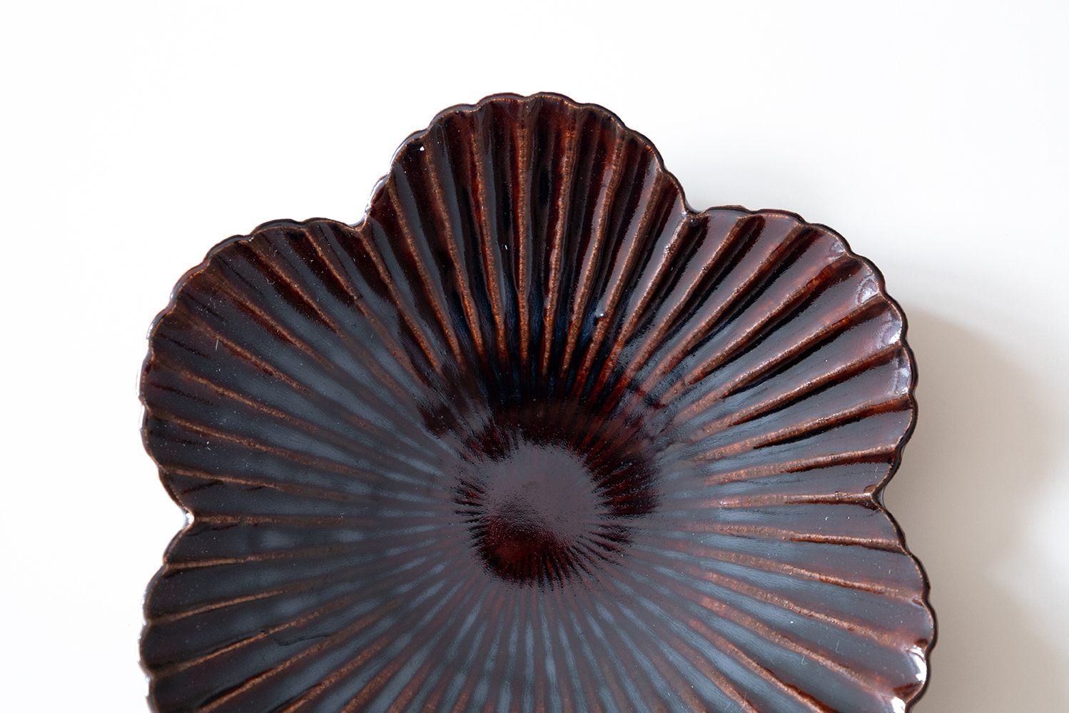 つやがあり深みのある濃い赤褐色が特徴的な宇田さんの飴釉。しのぎが入ることでより一層上品な雰囲気に仕上がっています。