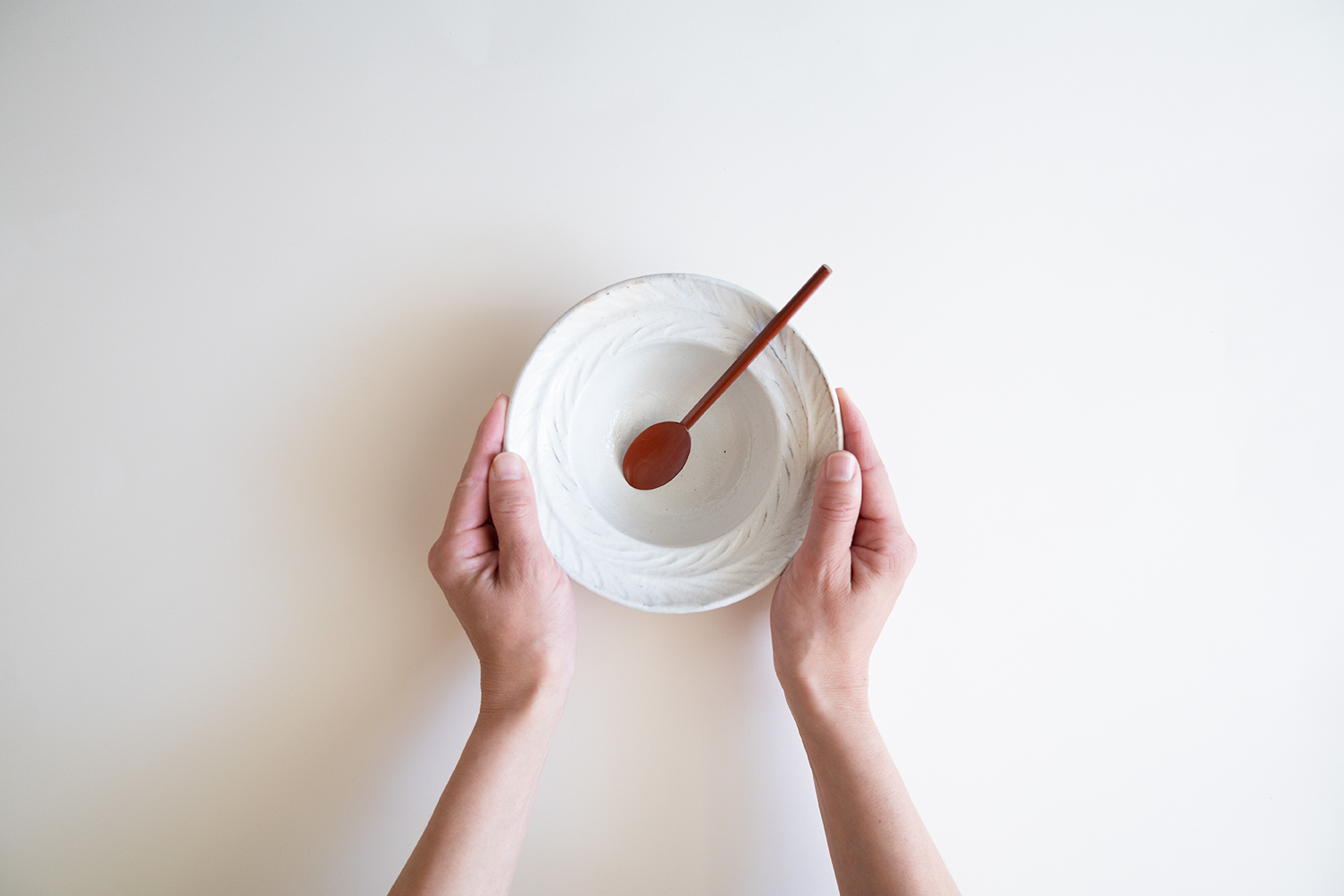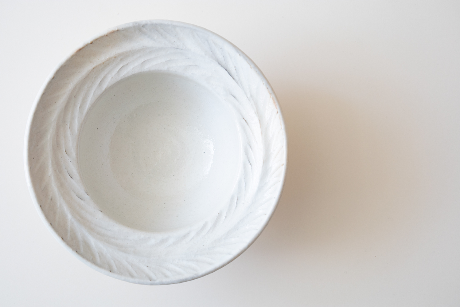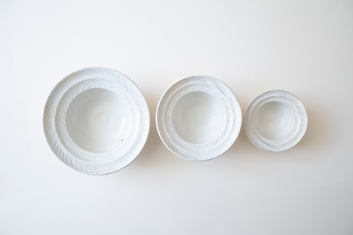 リムの部分に葉のようなしのぎが施されています。粉引の化粧から浮き出たしのぎは、優しい印象と上品さを感じさせます。グラノーラやサラダボウル、煮物など幅広くお使いいただけます。重なりも良く収納も便利です。