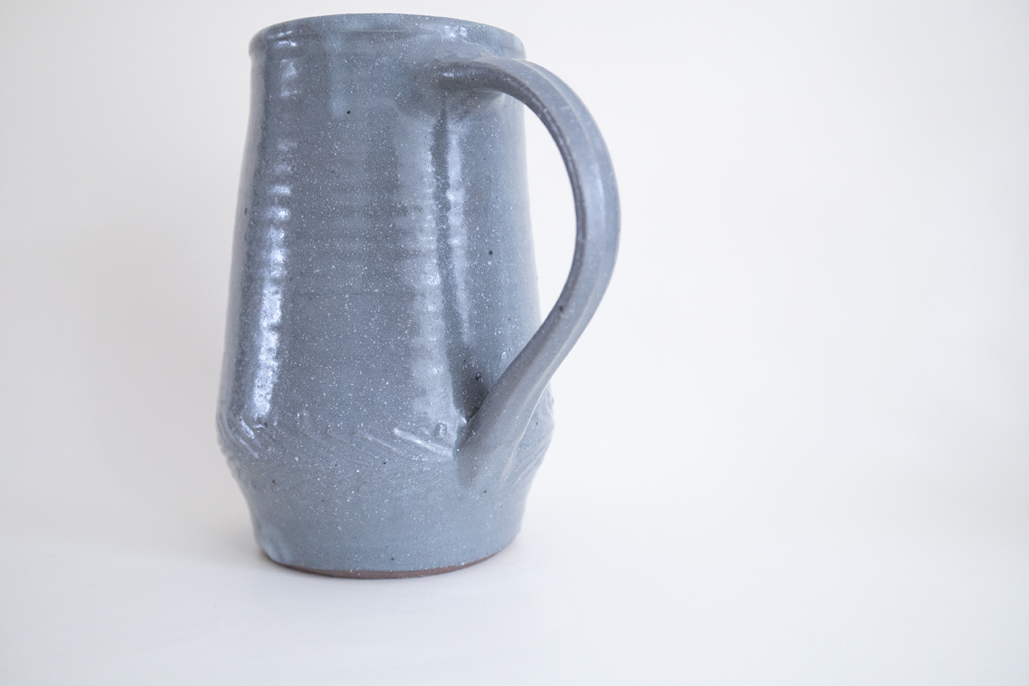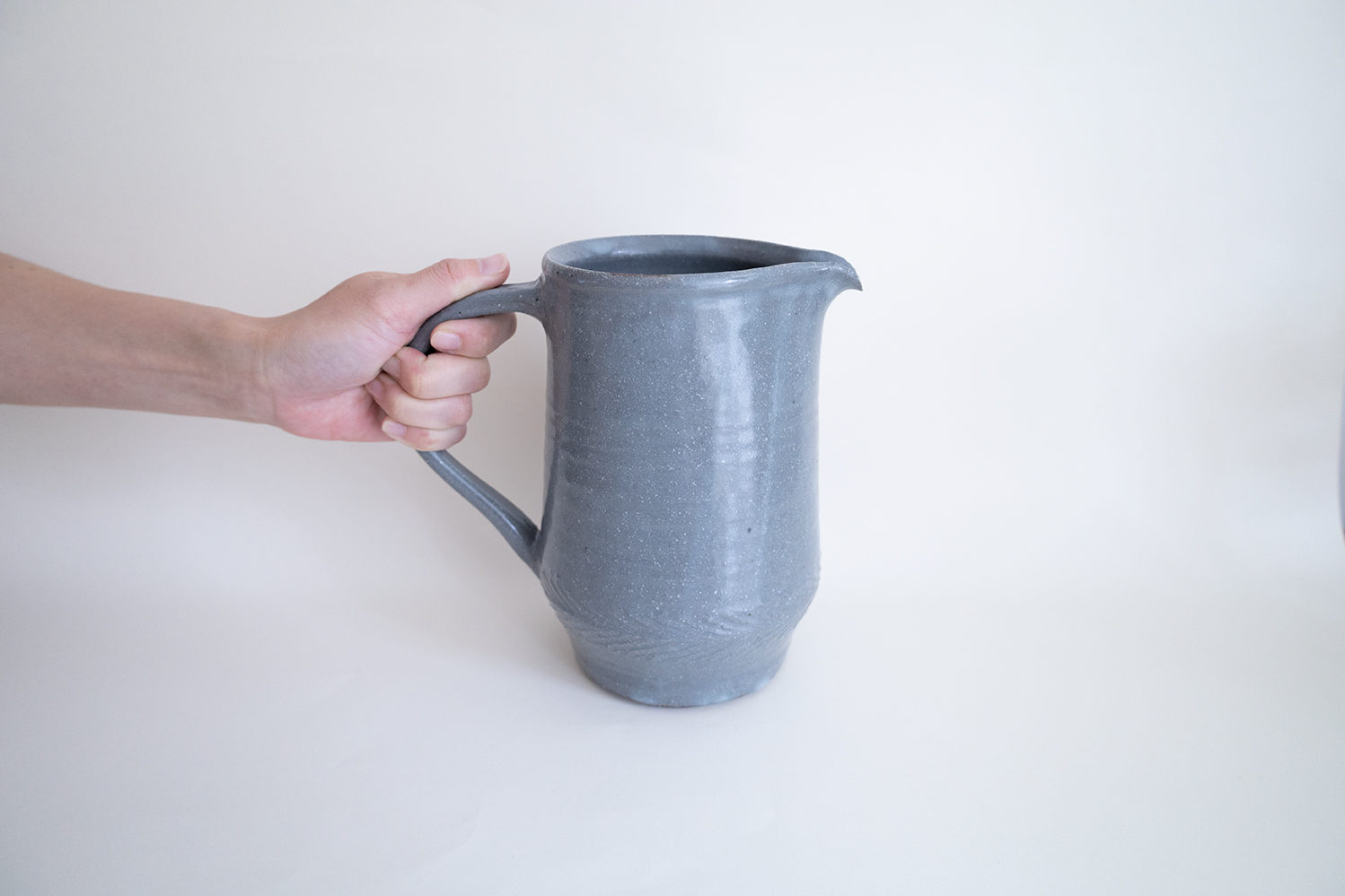 さりげなく施されたリーフのしのぎとグレーの色味が上品なピッチャーです。暖かみのある陶器ならではの土味は、生花はもちろん、ドライフラワーを飾っても素敵です。ボリュームたっぷりの植物を生けて楽しむことができるサイズです。