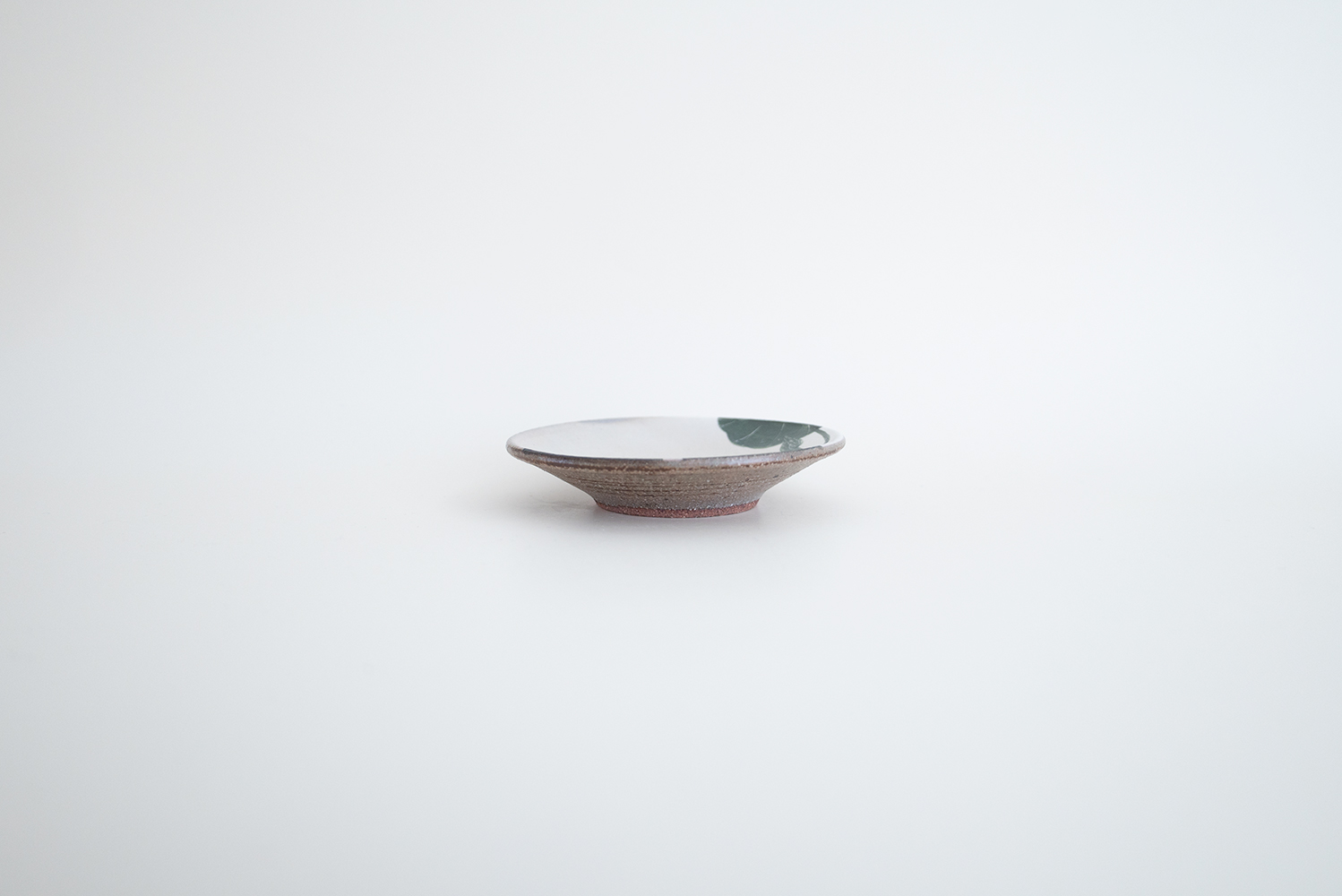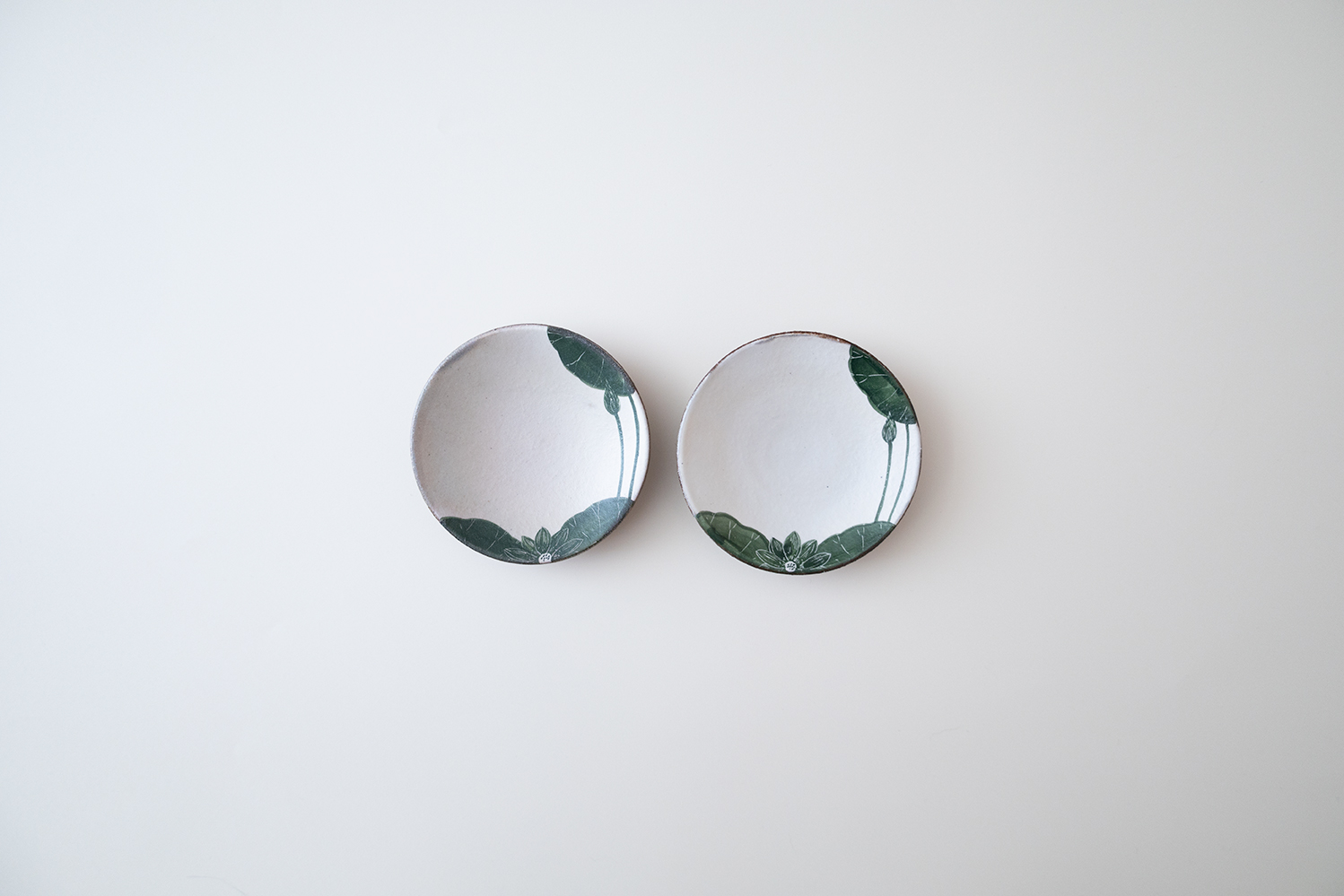 水彩画のような筆のタッチと繊細な掻き落としによる線画で鮮やかな緑のハスの葉が縁に描かれています。緑ハス・黒ハス・青ハスの3種類のお色がございます。
