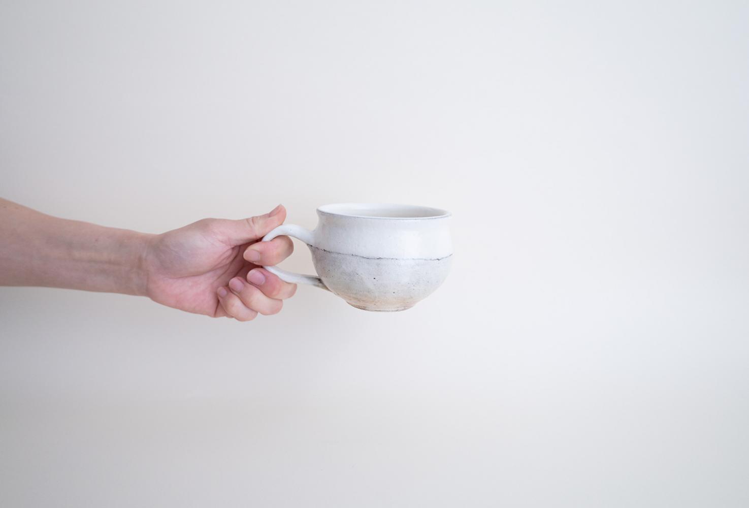 丸いぽてっとしたフォルムがかわいらしいスープカップです。表面の下から優しく素朴な土味が見え隠れする深みのある白地に、やさしいタッチのラインが入っています。