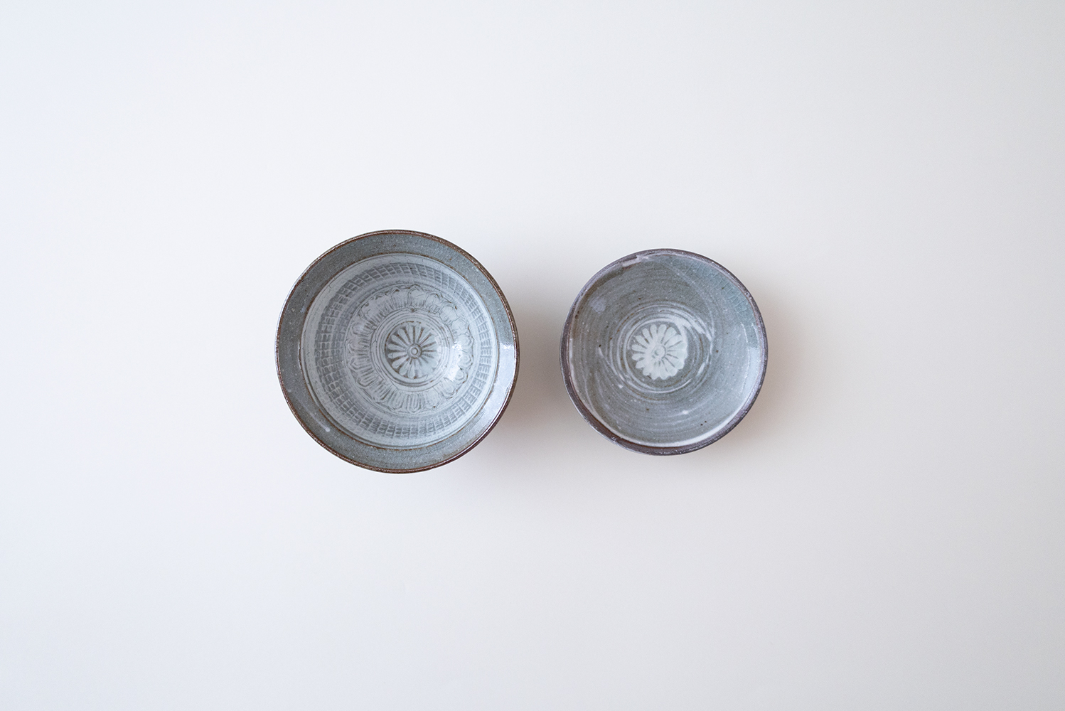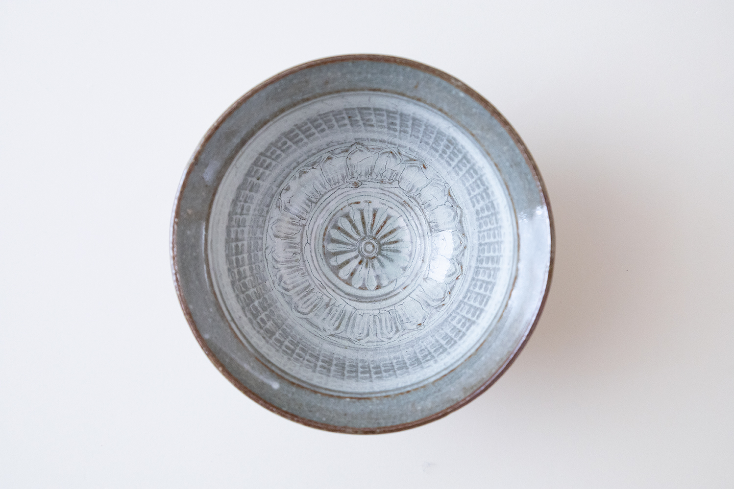 白土の象嵌模様が特徴的な三島。無数の円と蓮弁文、中心の菊花がバランスよく施されたうつわです。