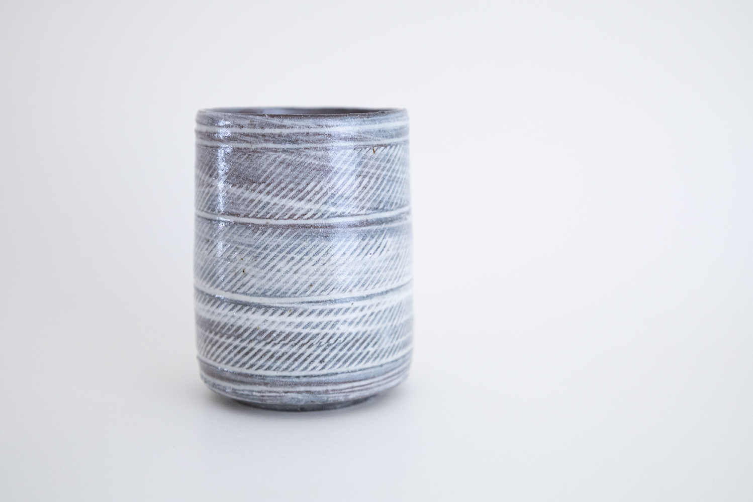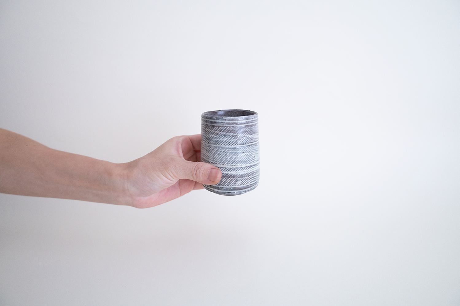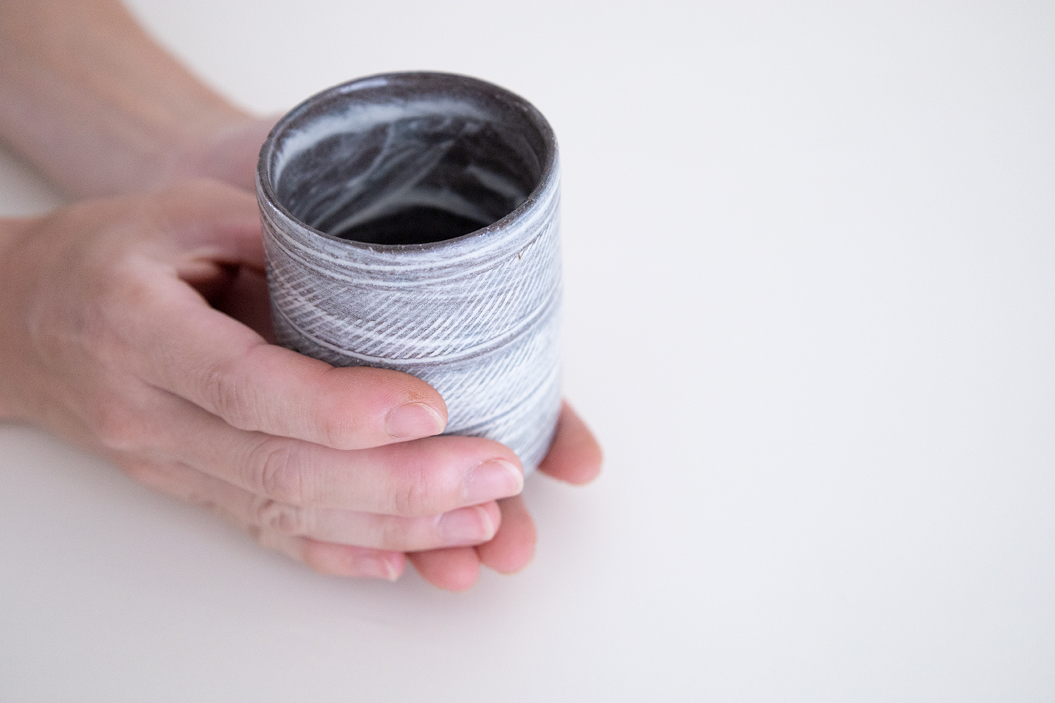 茶系ベースの生地が化粧土から覗く風合い豊かなお湯呑です。一つ一つ丁寧に印を施した手触りをお茶とともにお楽しみください。