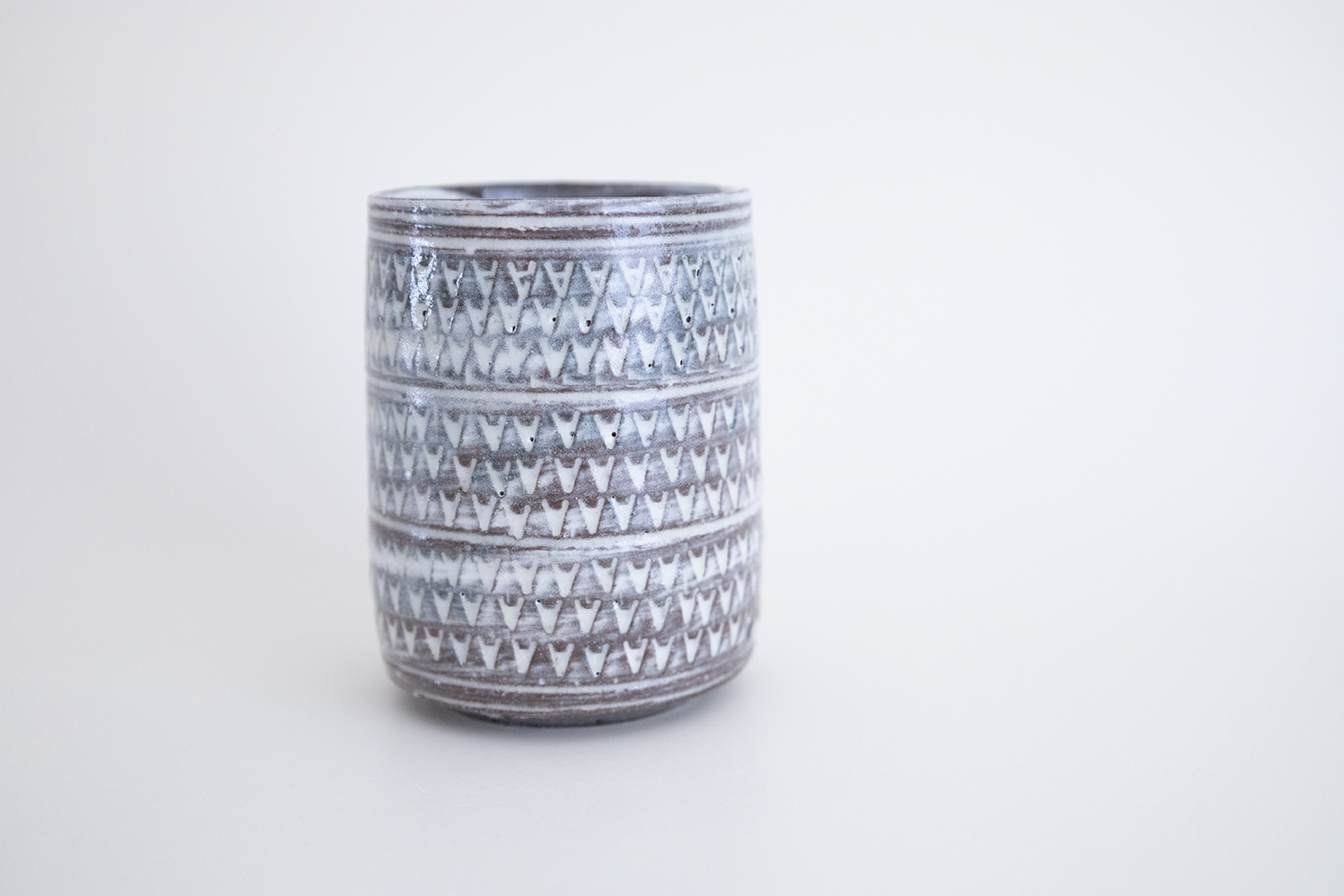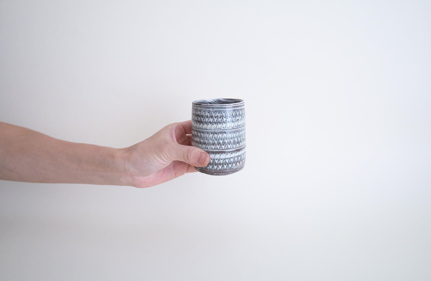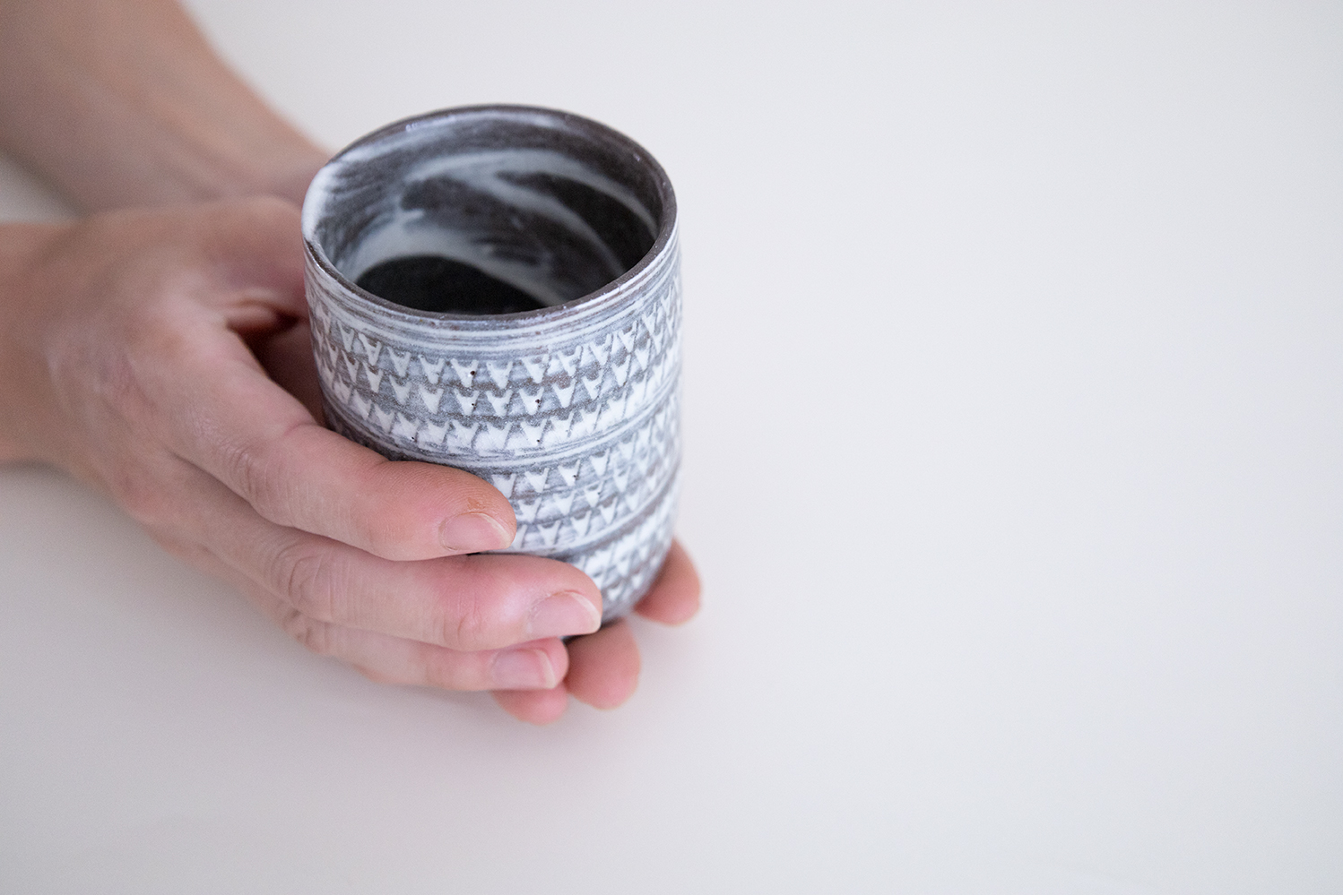 茶系ベースの生地が化粧土から覗く風合い豊かなお湯呑です。一つ一つ丁寧に印を施した手触りをお茶とともにお楽しみください。