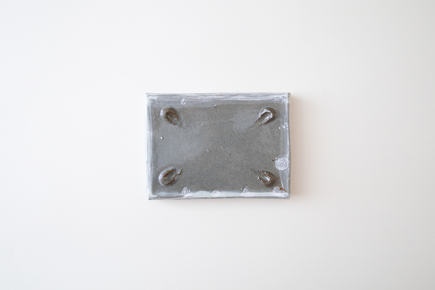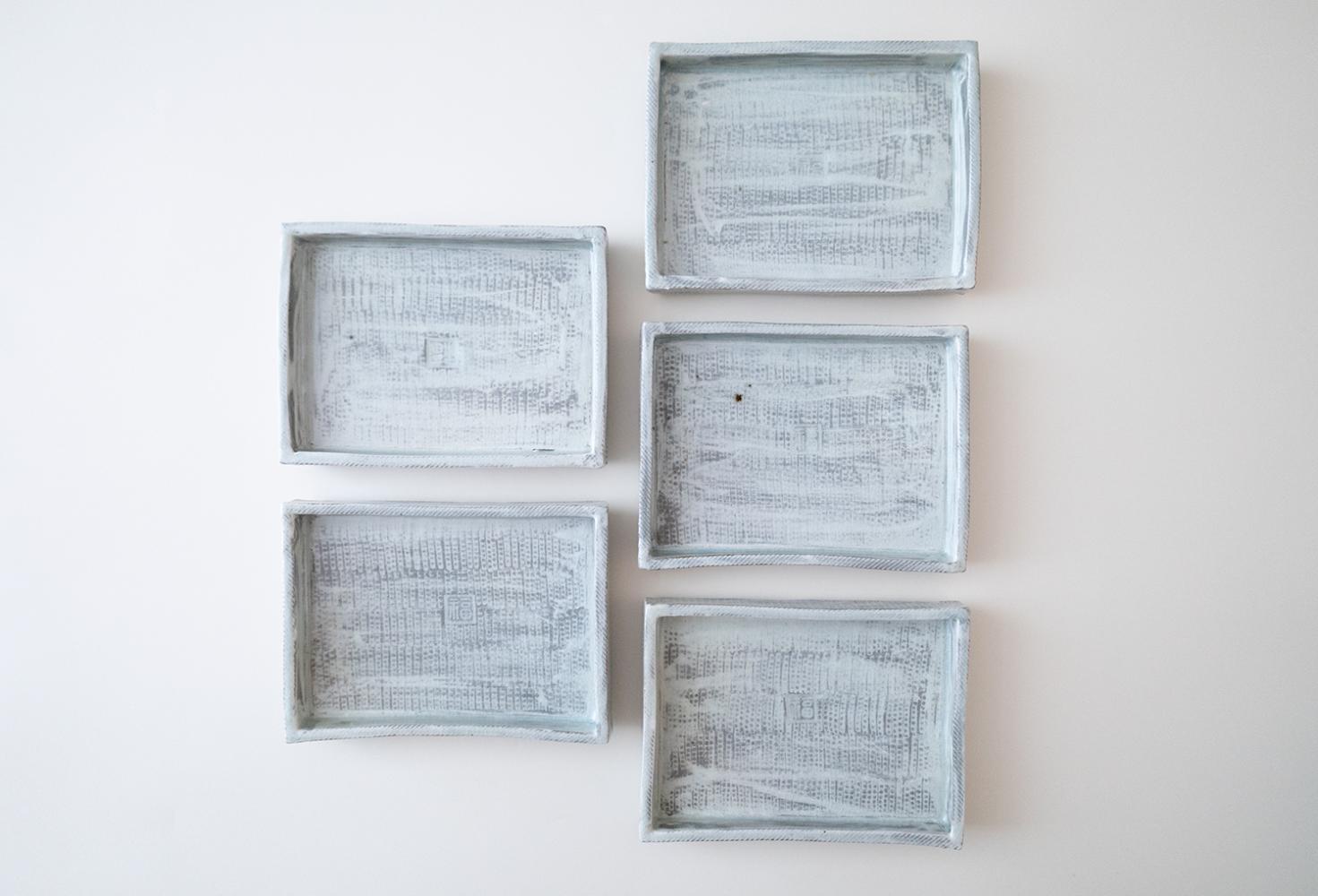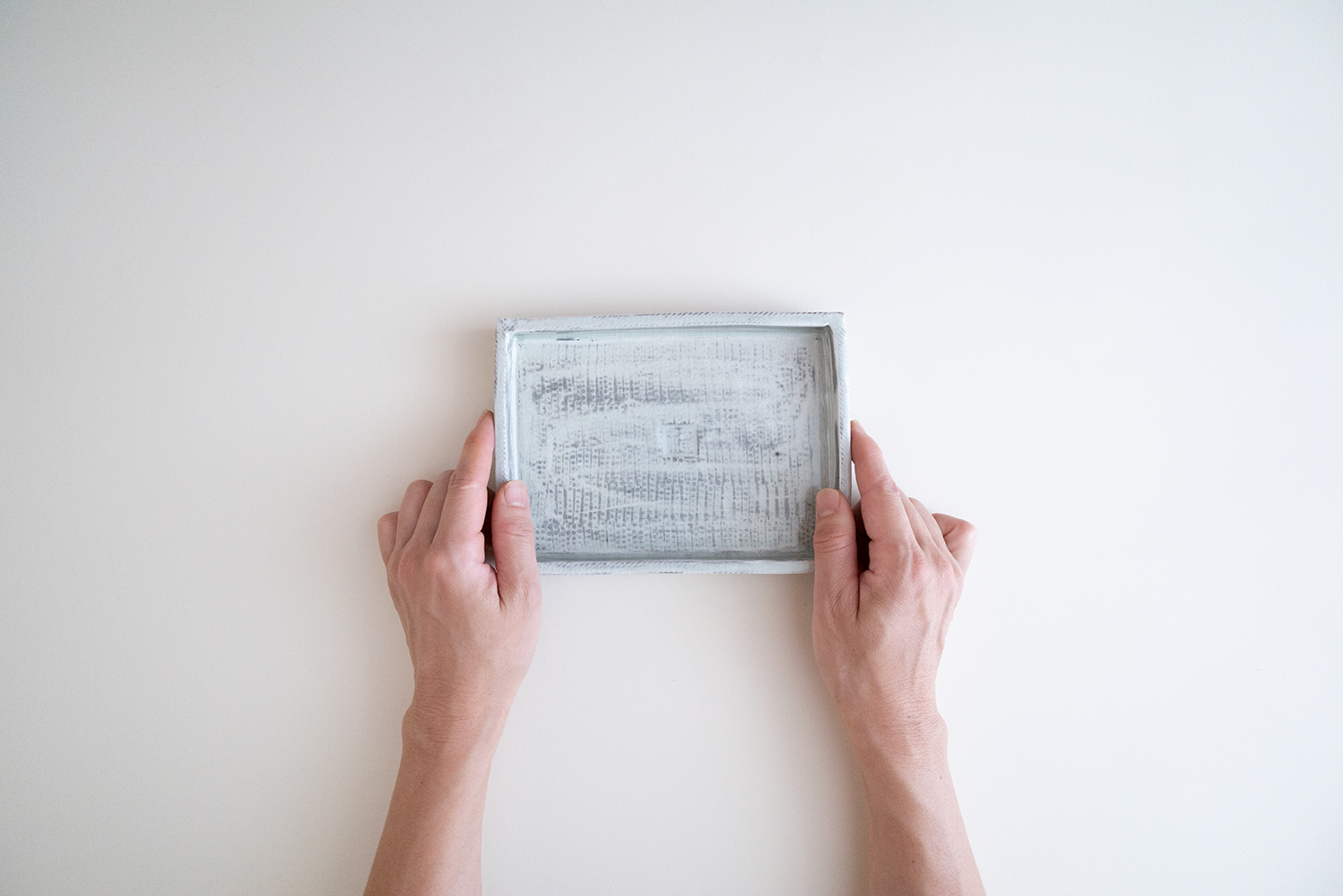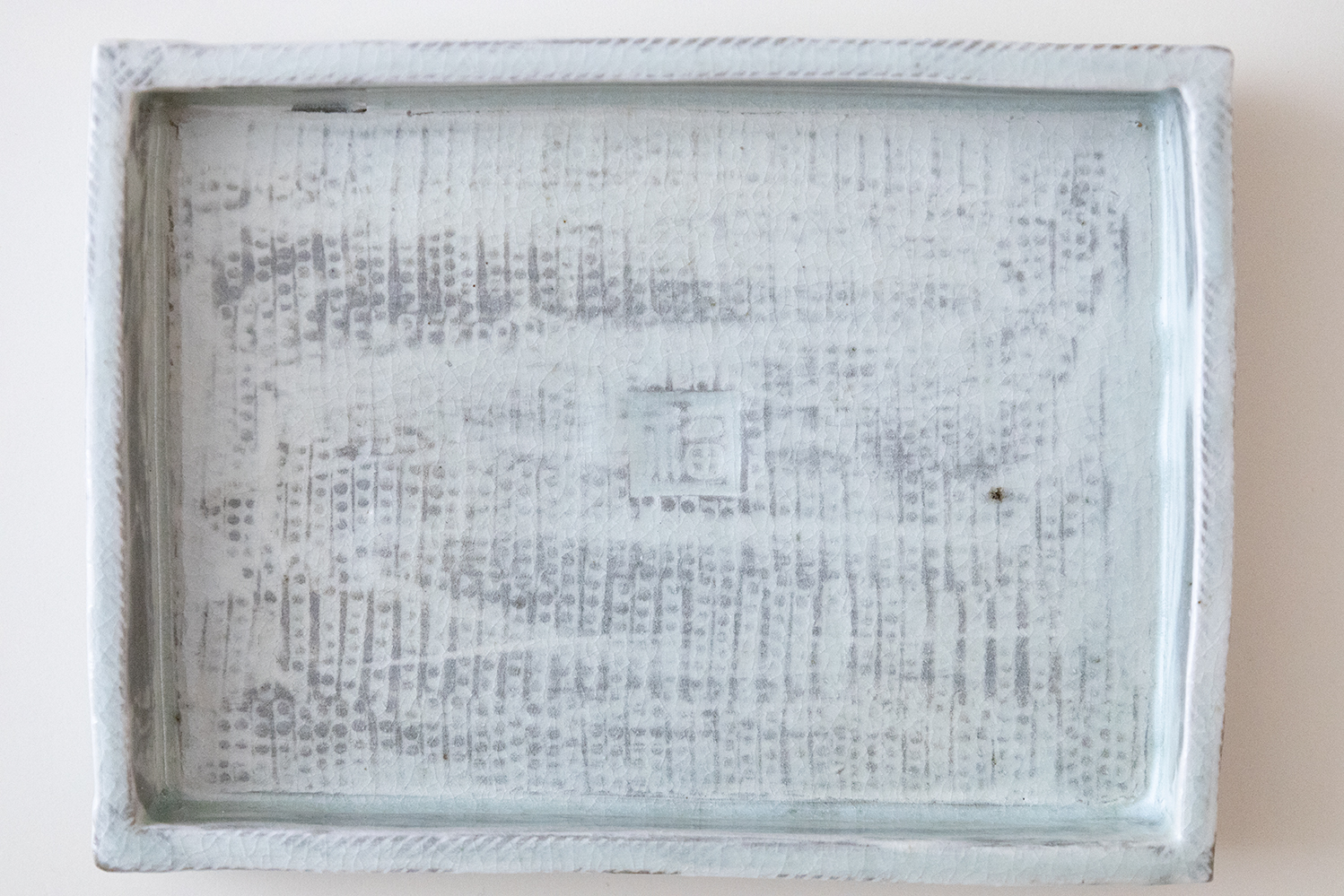 ほぼ全ての面を印で埋め尽くされており、中心には「福」の印が押されています。淡い水色の刷毛目から見え隠れする三島模様は非常に表情豊かで趣深い味わいを感じることができます。