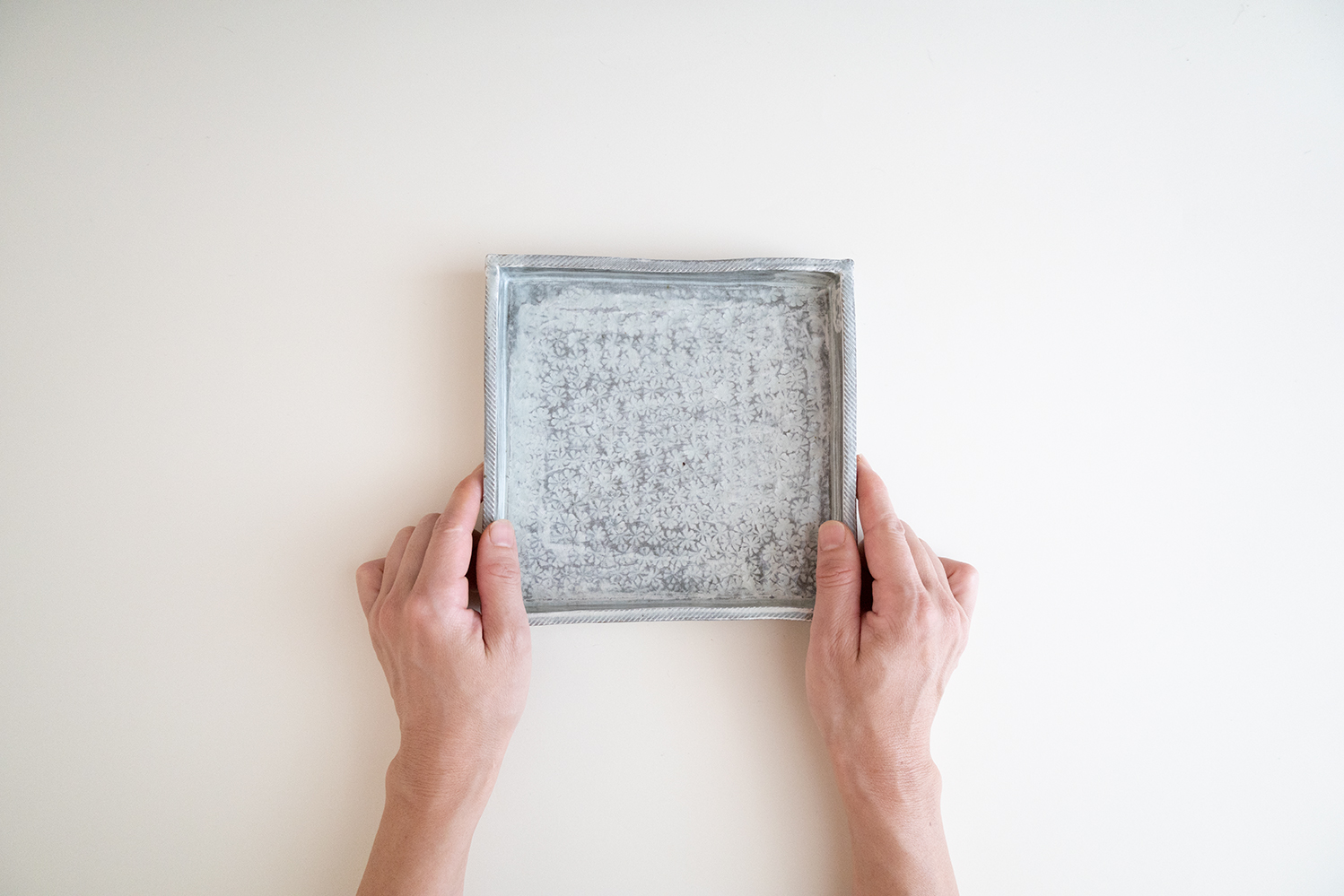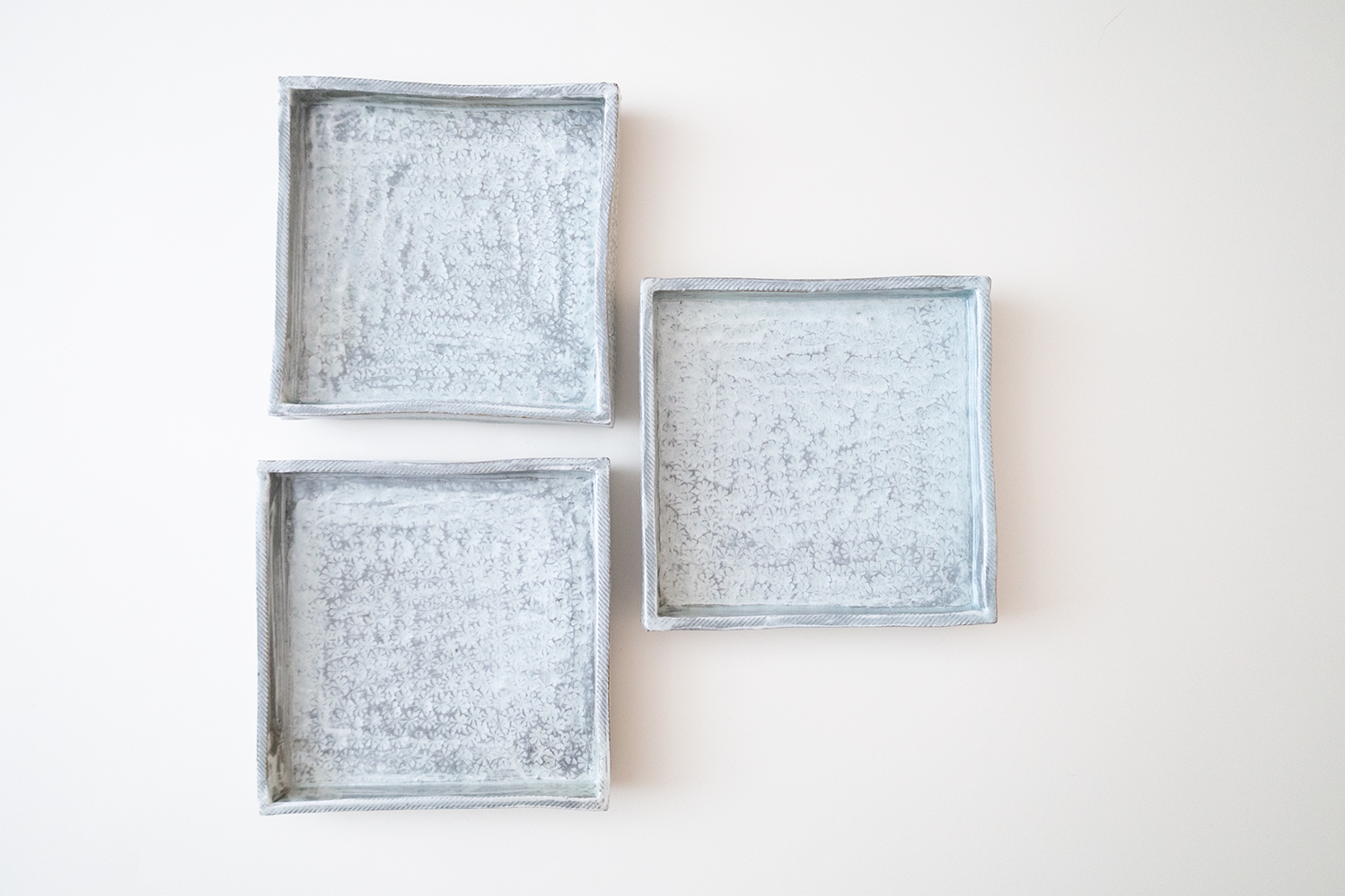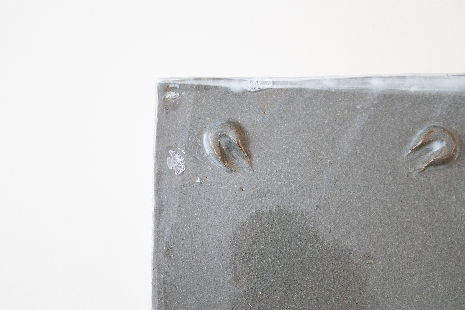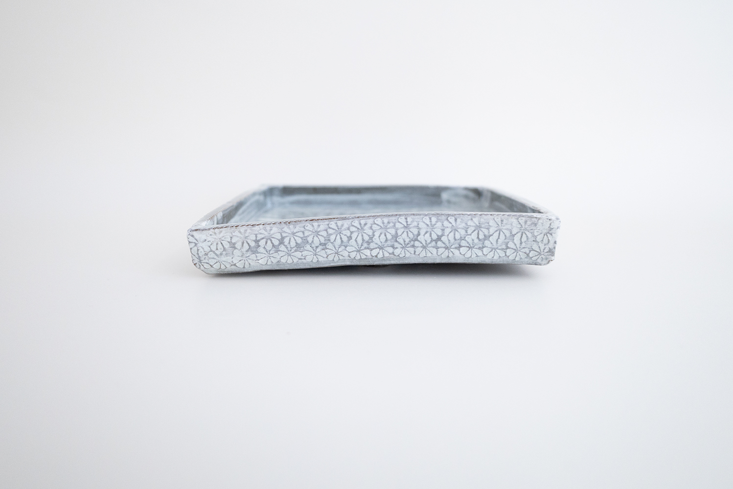 ほぼ全ての面を印で埋め尽くされています。淡い水色の刷毛目から見え隠れする三島模様は非常に表情豊かで趣深い味わいを感じることができます。