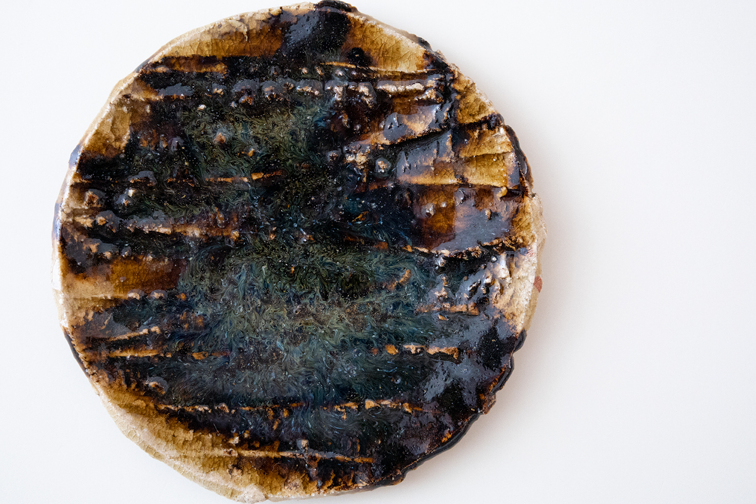 深い褐色の釉薬が複雑に溶けて混ざり合い揺らめく色彩を作っています。小さいながらも印象に強く残る作品です。