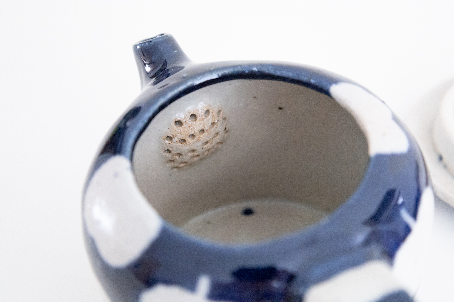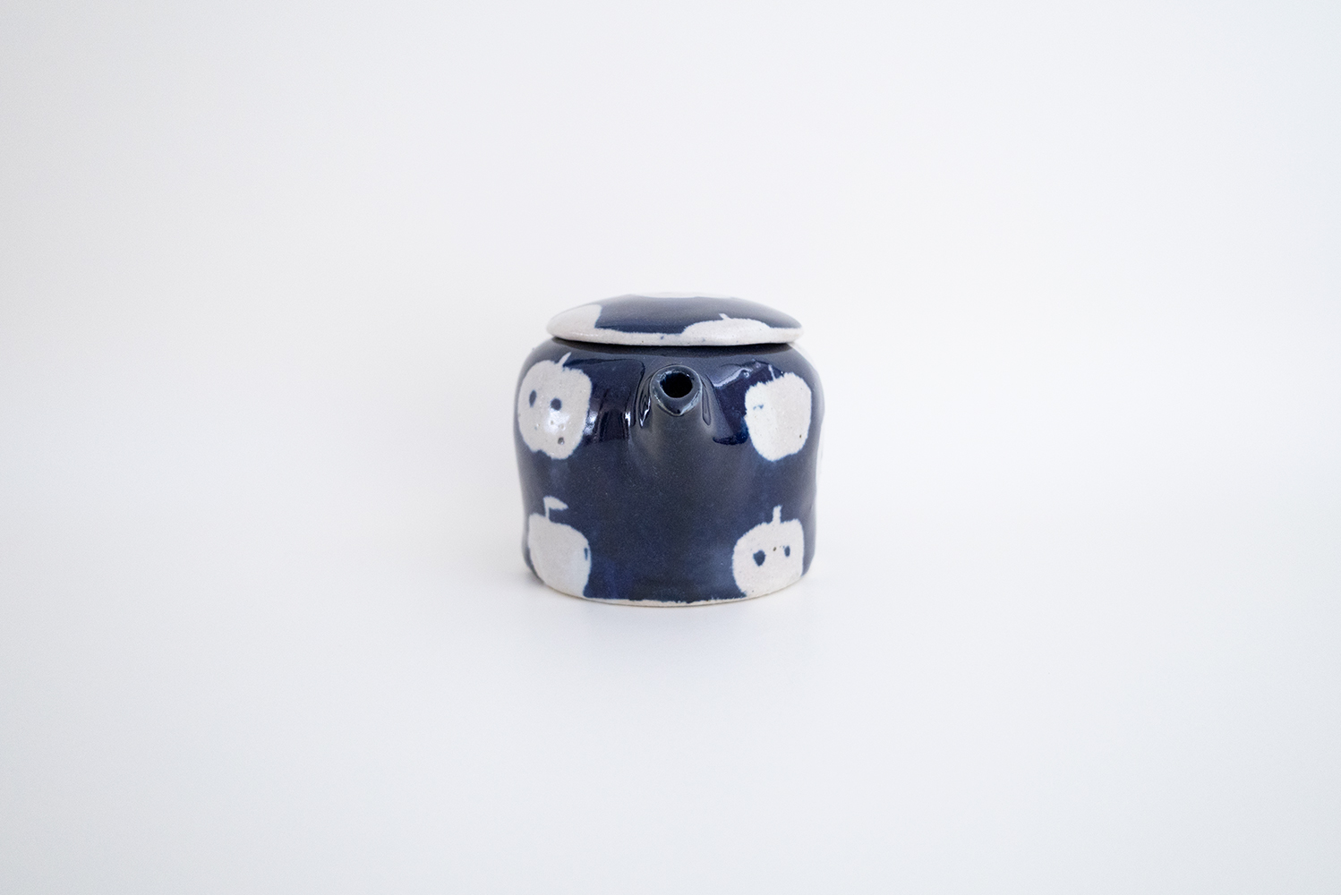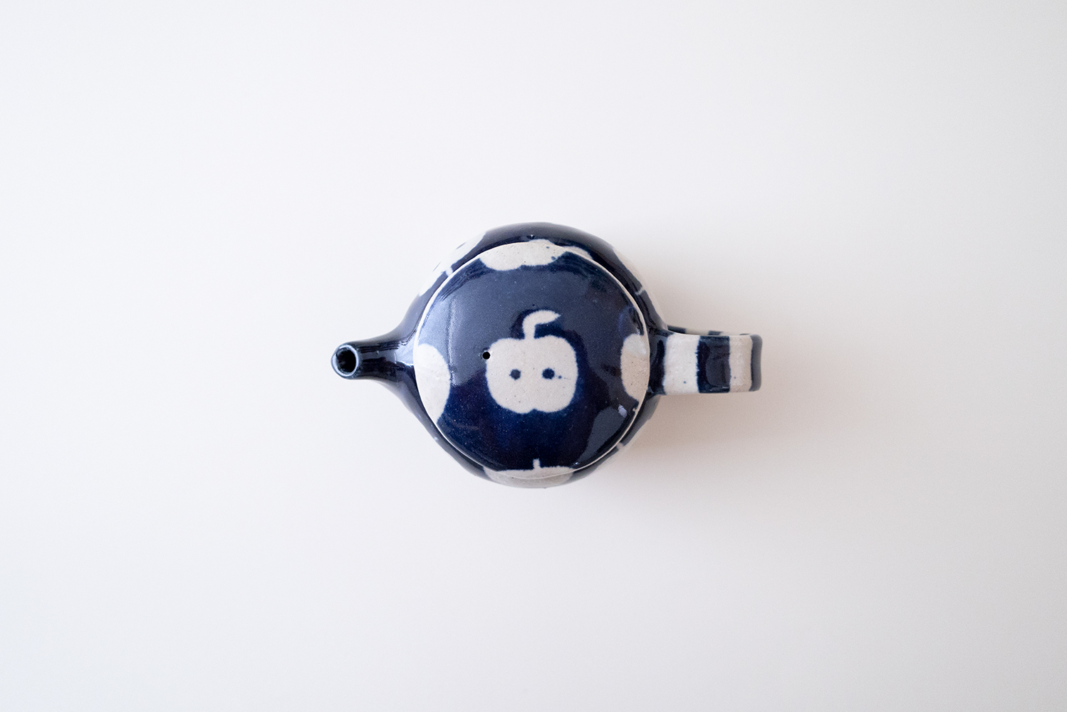 半分のリンゴ、丸々1このリンゴ。たくさんのリンゴがポット全体に描かれています。絵柄は模様の部分に釉薬がかからないように絵付けされています。