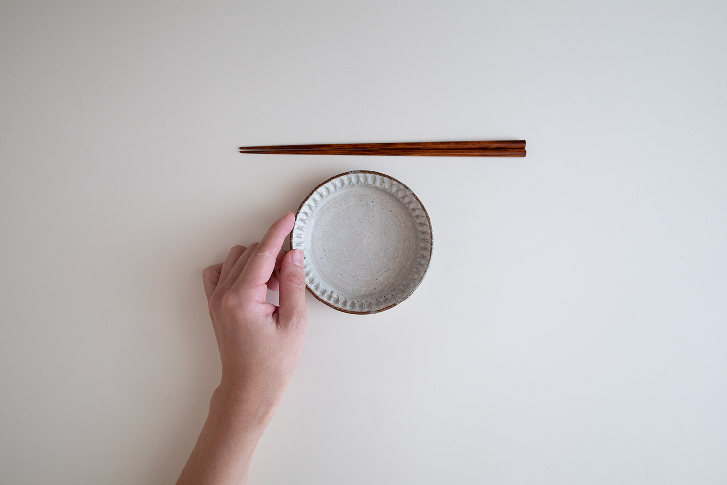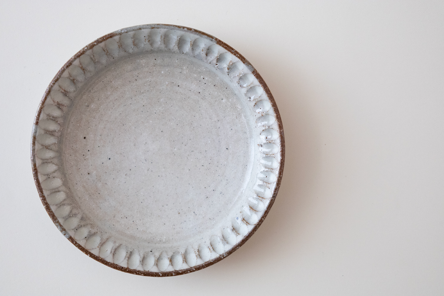素地の味を残した粉引の質感と、リム部分に施された小さな花弁のようなしのぎがほっこりと優しい印象を与えます。シンプルな形なのでどんなお料理とも相性が良く、重なりも良いのも嬉しいです。