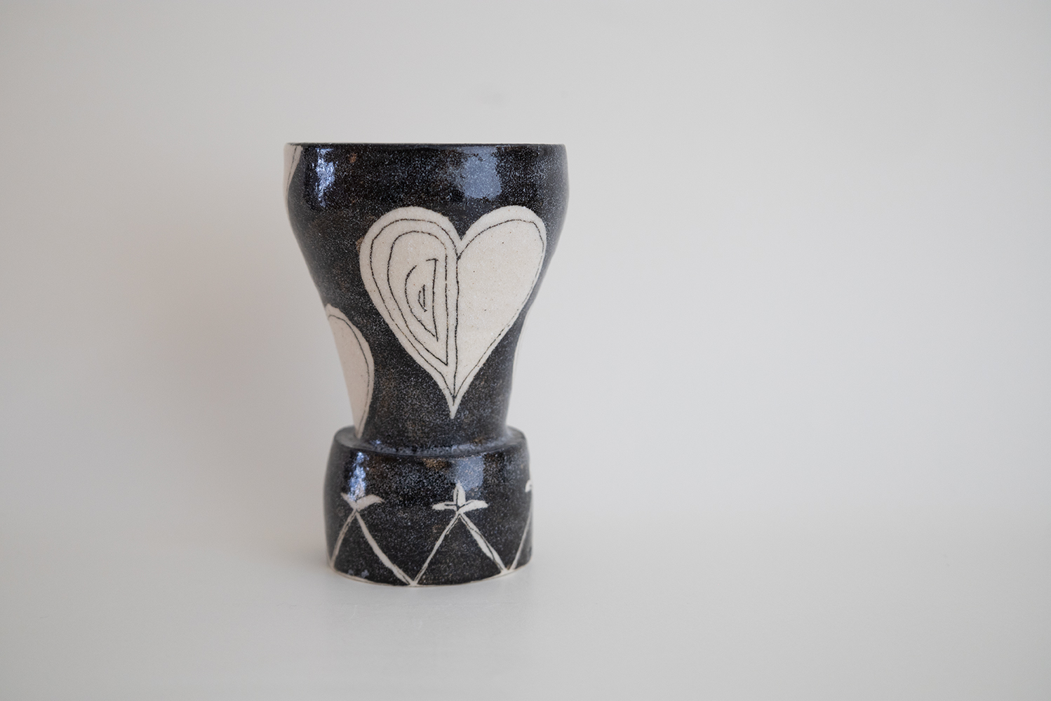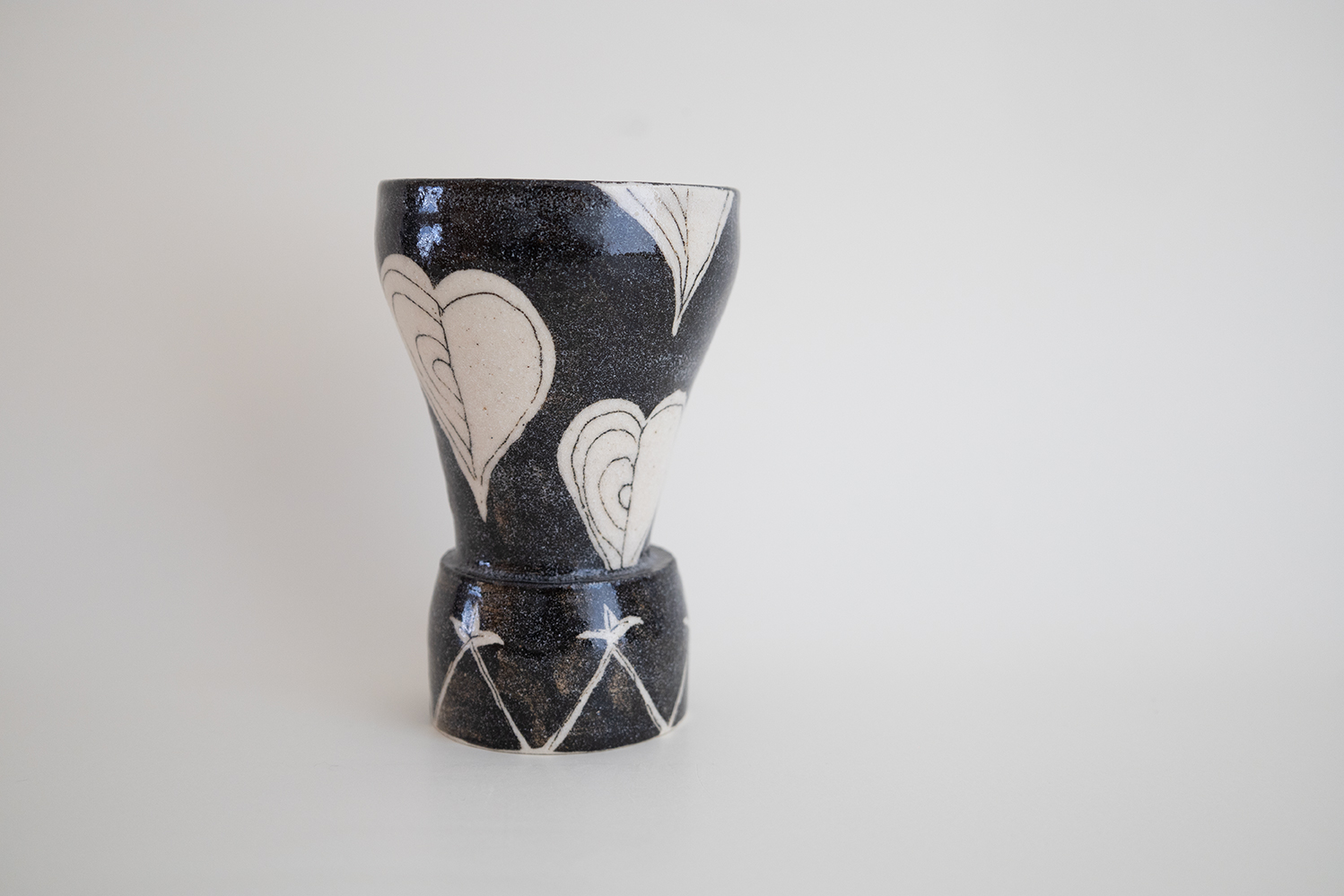 デザイン性の高い高台付きのカップです。一つずつ丁寧に描かれた模様はベースの白地を残して表現されています。今回の模様はインド更紗をイメージしています。表面に使われている透明釉は1980年代に採掘された材料でないと出来上がらない質感なのだそうです。