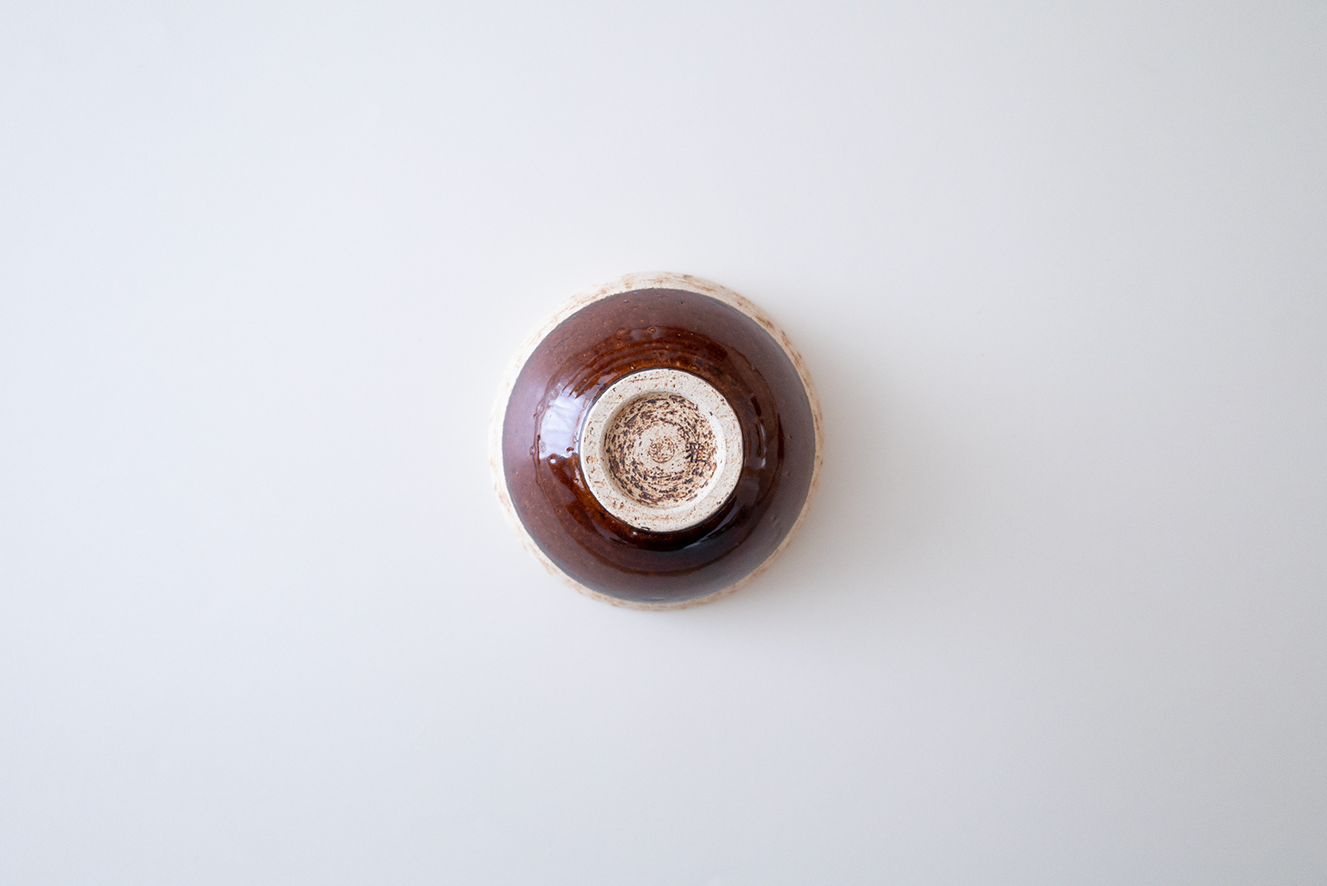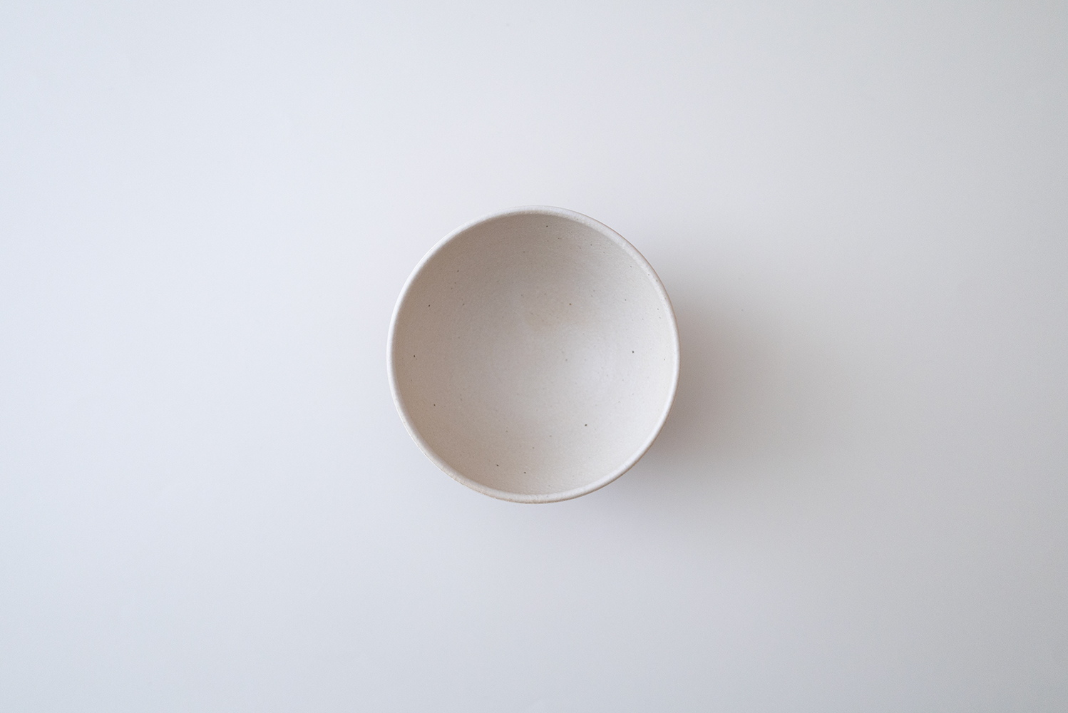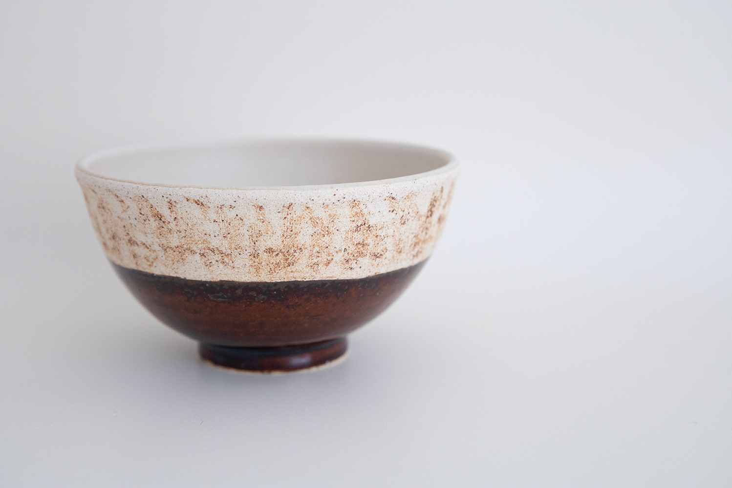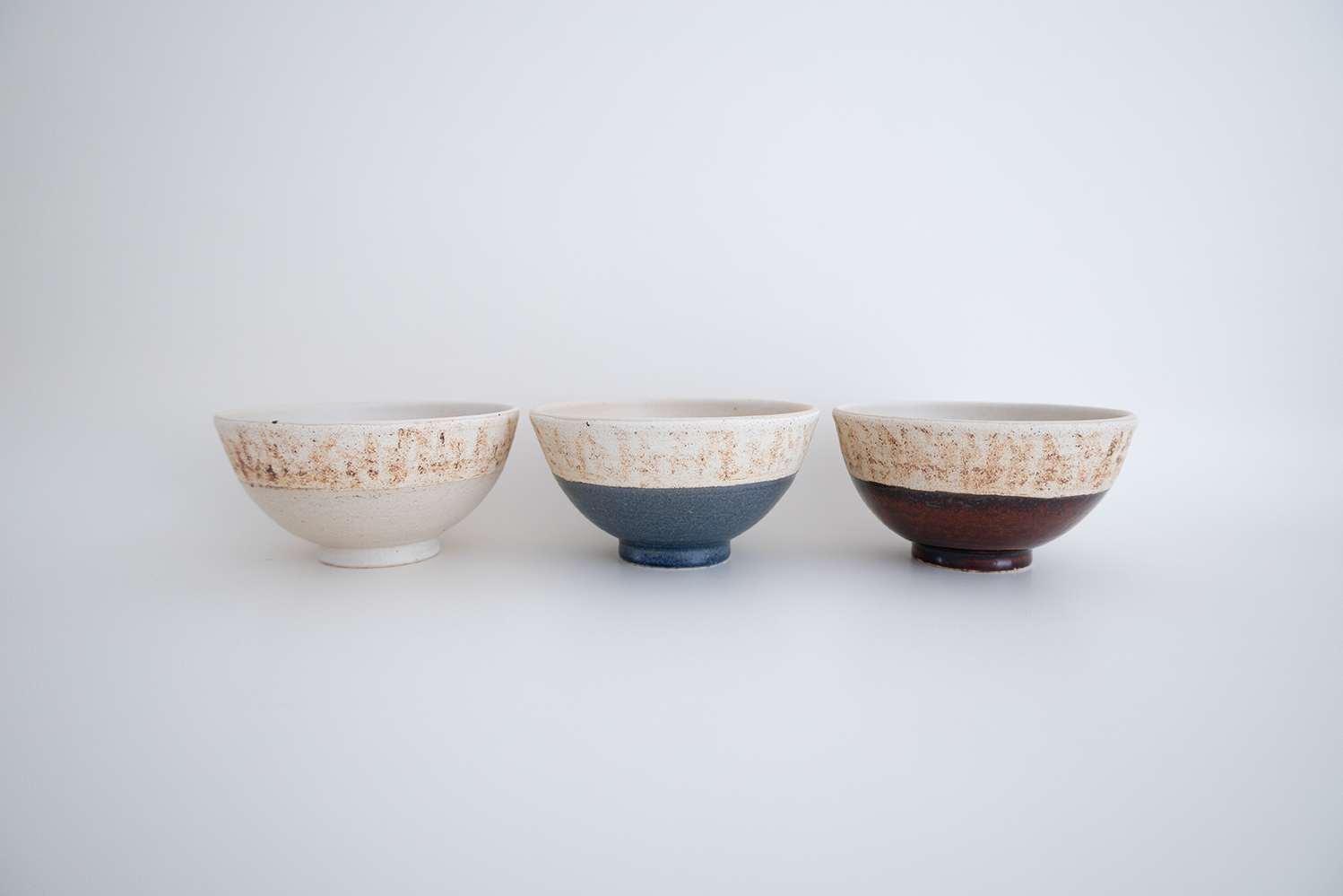 中川さんの代表的な作風のコルクシリーズと同じ素地で作られており、飯碗の下部が釉薬で色分けされ程よいアクセントになっています。青、白、茶色の3色があるので、ペアや家族で使っても素敵ですね。
