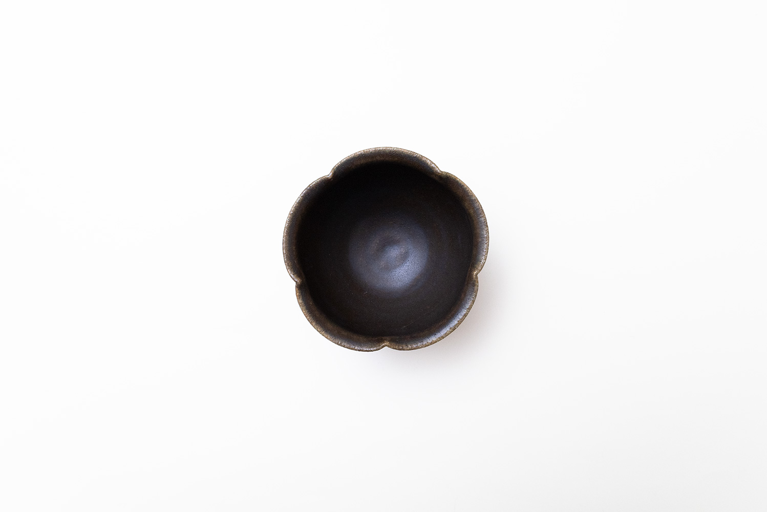 丸い形が可愛らしい輪花ボウルです。煮物を入れたりサラダボウルにしたり、和洋問わず活躍してくれそうです。錆釉の器は、深く濃い茶色と所々見られる淡い茶色の濃淡が印象的で、土物らしい味と趣を感じることができます。濃いめのお色は、盛り付けたお料理をグッと引き締めて見せてくれます。