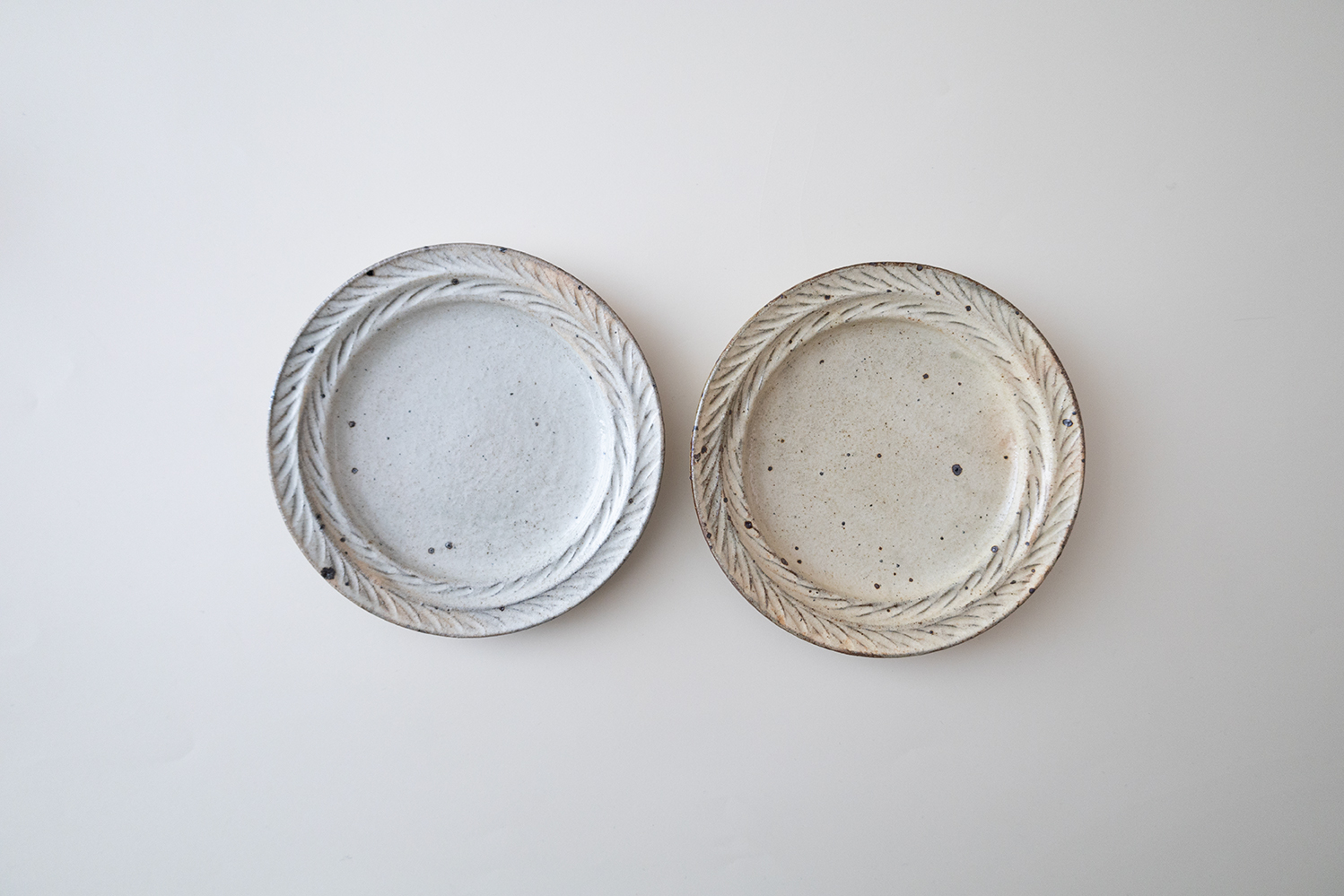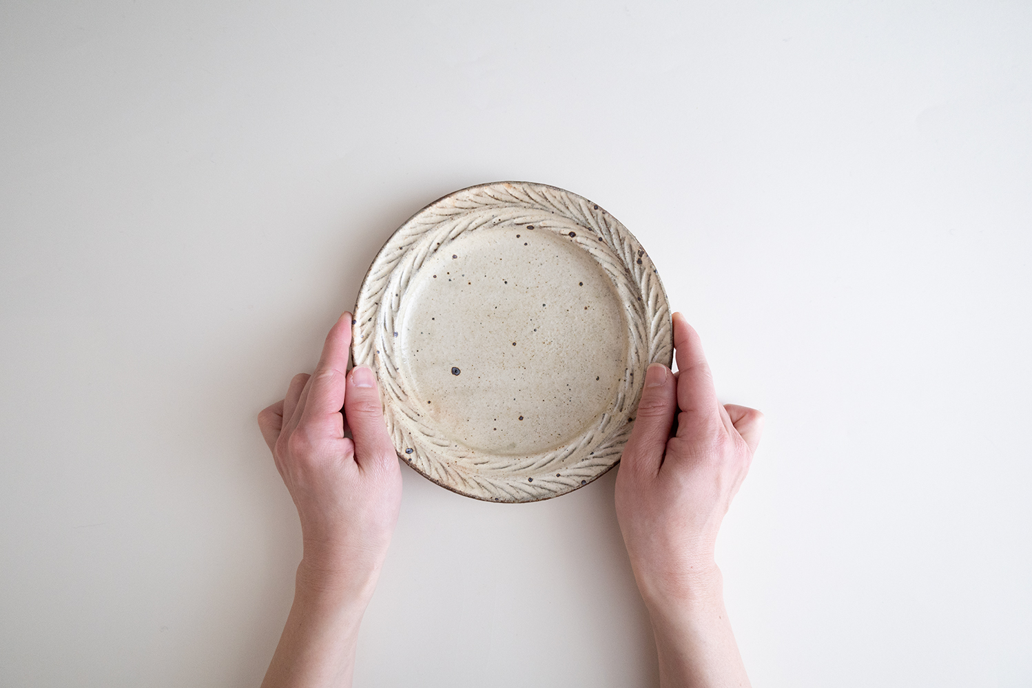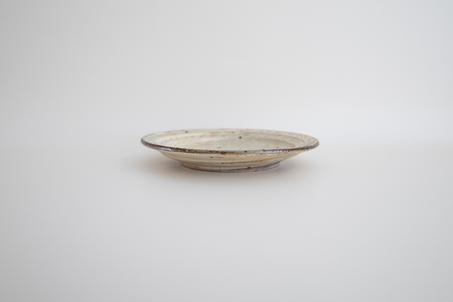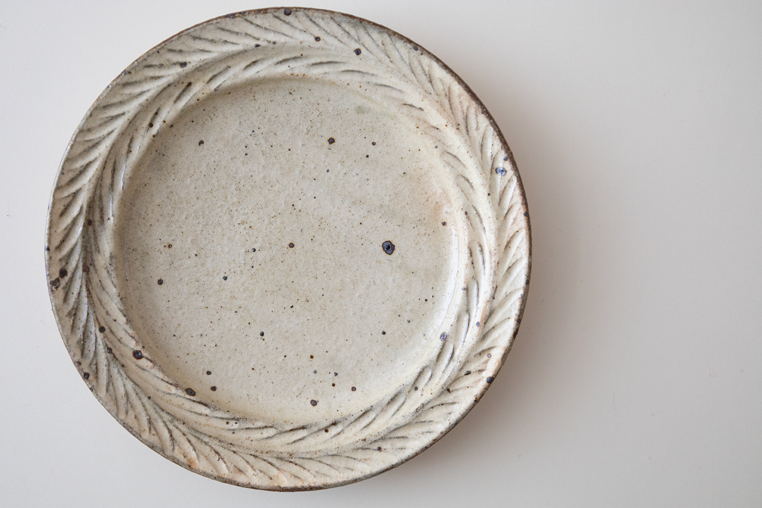 リムの縁に葉のようなしのぎが施されています。渋い色味は和洋問わずお料理との相性が抜群です。黄色味がかった趣のあるキナリは、黒い鉄分の斑点や釉薬が淡く緑色に変化している部分など、見どころがたっぷりと詰まった器に仕上がっています。粉引や錆釉の器との相性もとても良く、長く楽しんでいただけることと思います。
