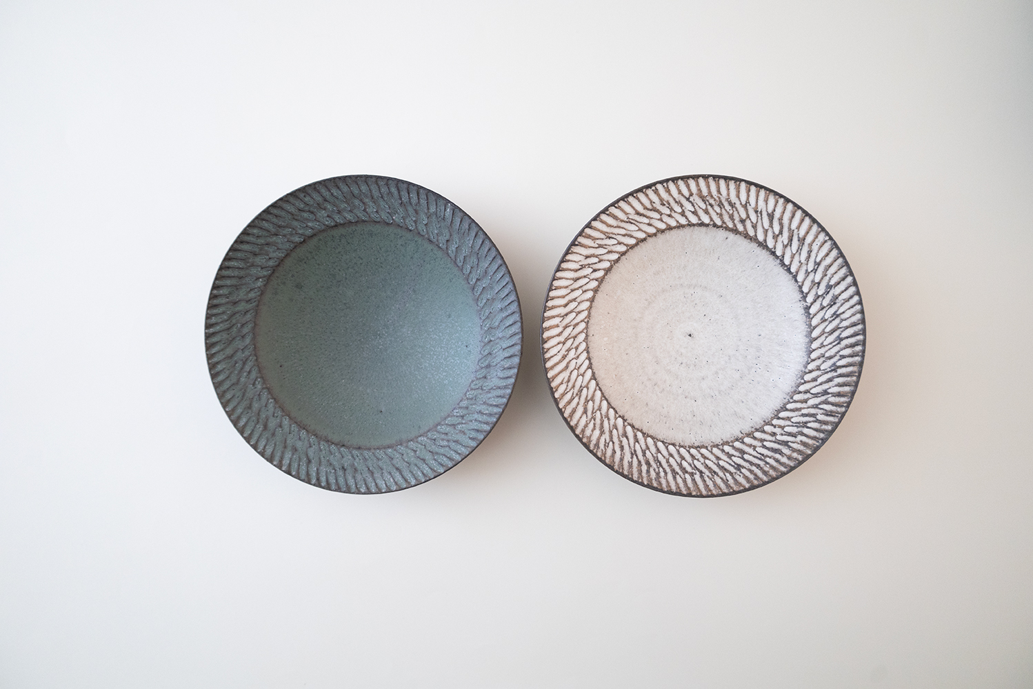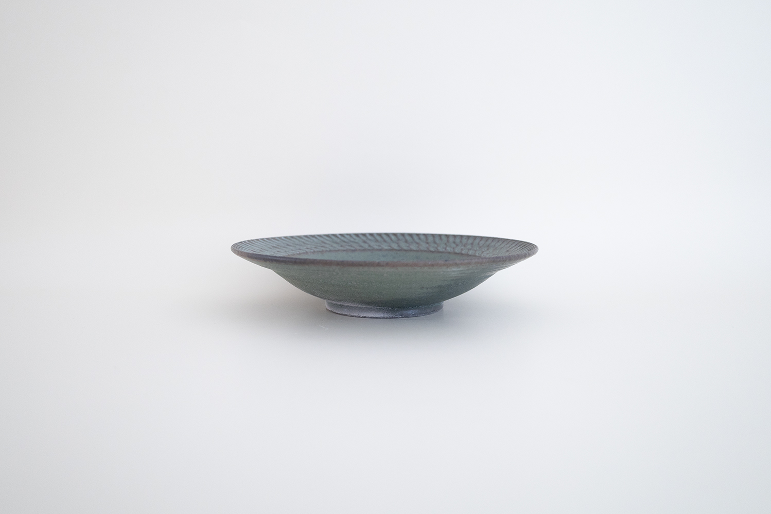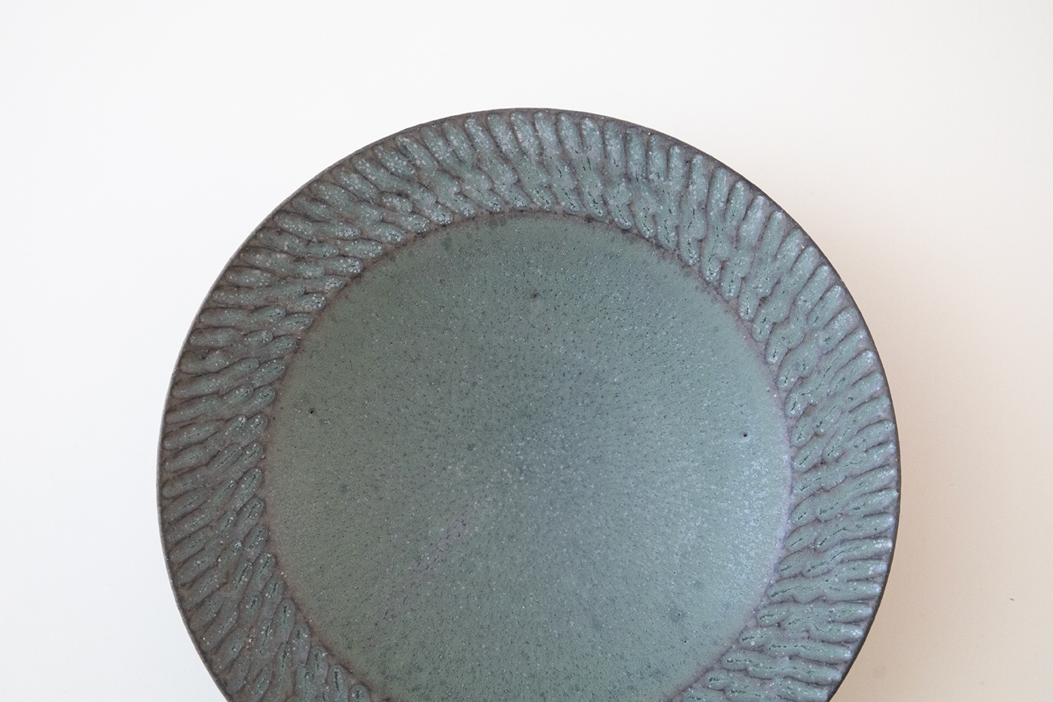 新色緑色のリム皿です。白色の釉薬の上に黒の釉薬を重ねてかけることで深い青銅のような豊かな表情の緑色が出来上がります。適度な深さがありプレートよりも浅鉢に近い形です。リムの部分の流れるようなしのぎ柄は美しく、正確な手仕事が伺えます。