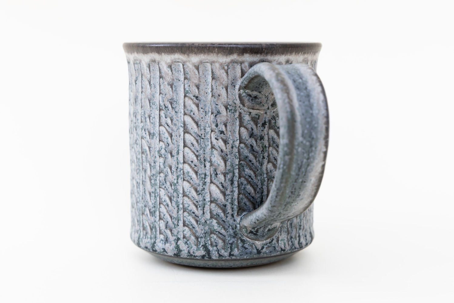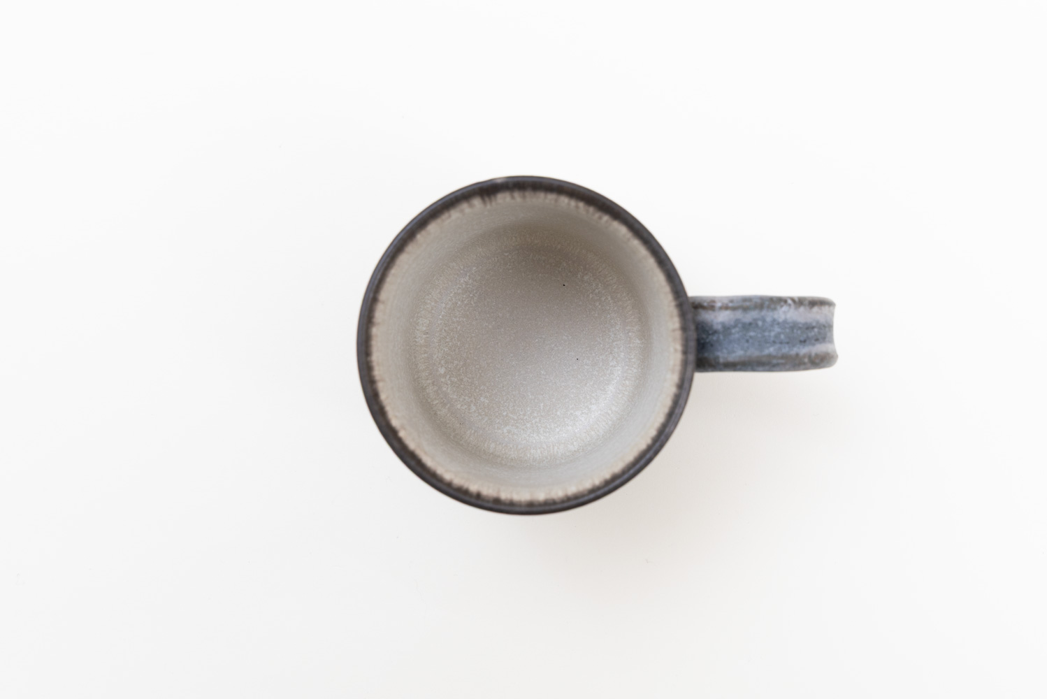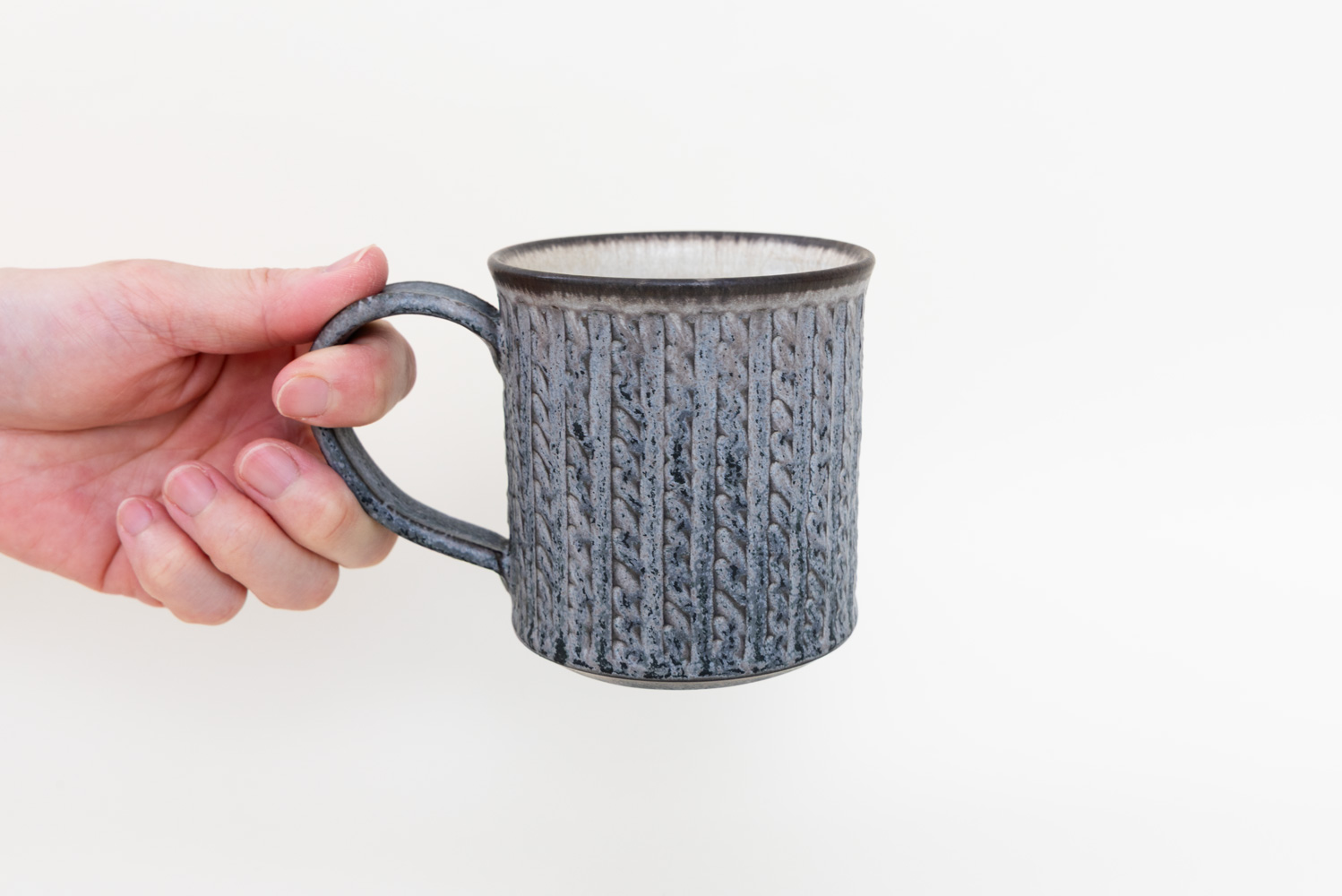 深みのある緑釉に、縄目のような鎬を重ねたマグカップ。彫りの陰影に釉薬が溜まり、複雑な表情を生み出しています。口元はやや立ち気味で、すっきりとした飲み口。コーヒーはもちろん、深煎りの一杯や濃いめのお茶にもよく合います。指をしっかり通せる持ち手で、安定感のある使い心地です。