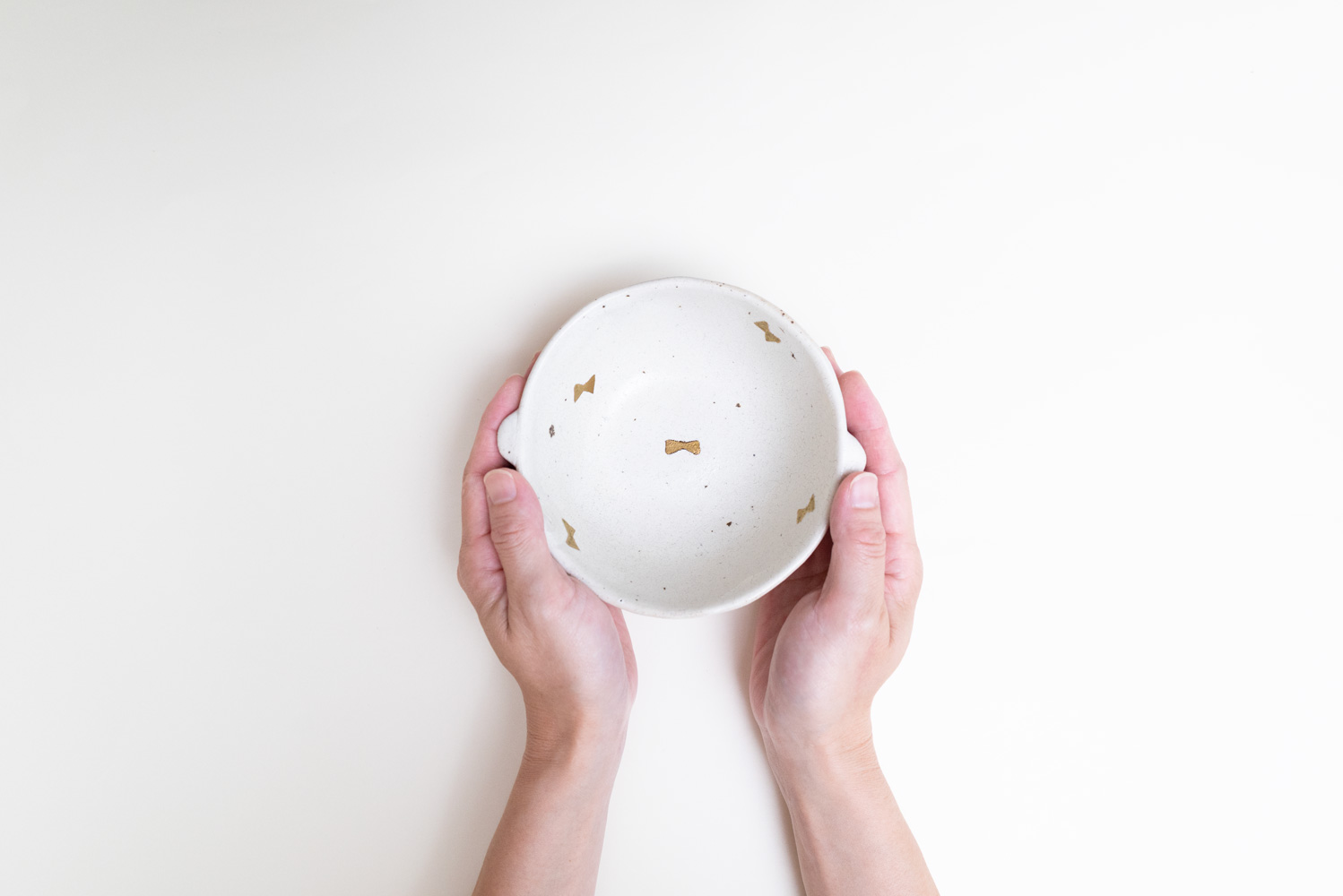 マットな質感の粉引に金彩の落ち着いた金色がよく似合います。小さな耳とリボン柄が可愛らしいボウルです。スープボウルはもちろん、サラダや煮物、小丼として使っても素敵です。