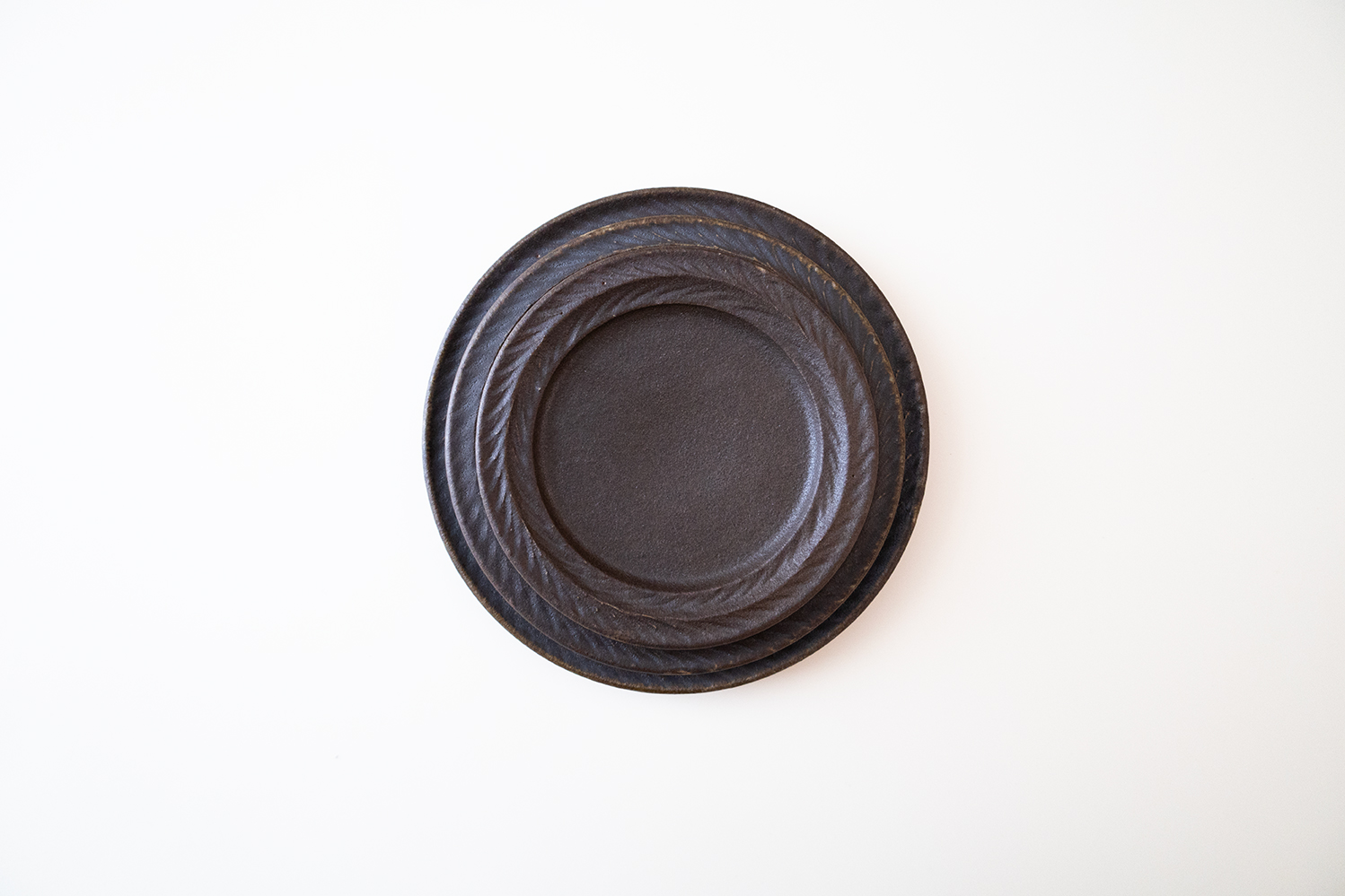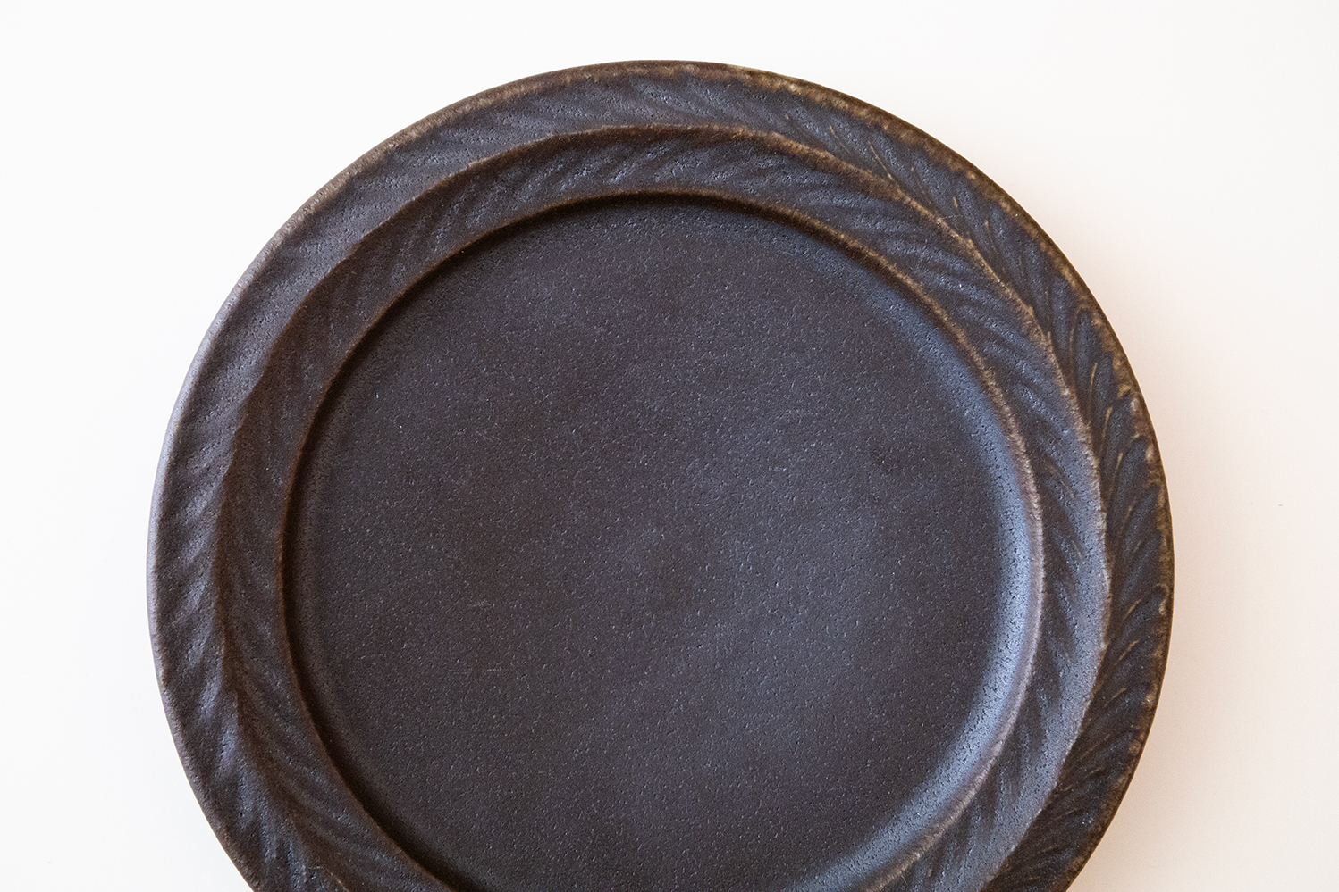 リムの縁に葉のようなしのぎが施されています。錆釉の器は、深く濃い茶色と所々見られる淡い茶色の濃淡が印象的で、土物らしい味と趣を感じることができます。濃いめのお色は、盛り付けたお料理をグッと引き締めて見せてくれます。
