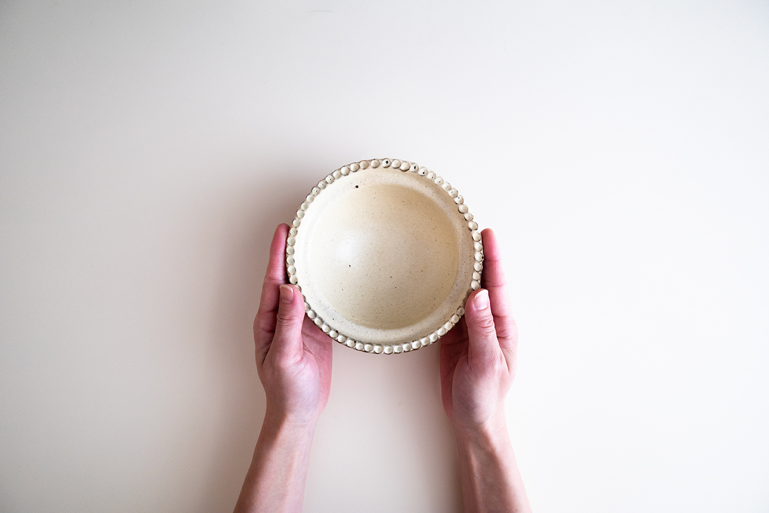 リムの部分に温かみのある模様が特徴的な器です。深さと大きさともに併せ持っており、サラダボウルや煮物など幅広くお使いいただけます。土らしい温かみを感じるほんのり淡い黄色は、甘すぎない雰囲気に纏めてくれるので、和食などの素朴なお料理にも良く似合います。