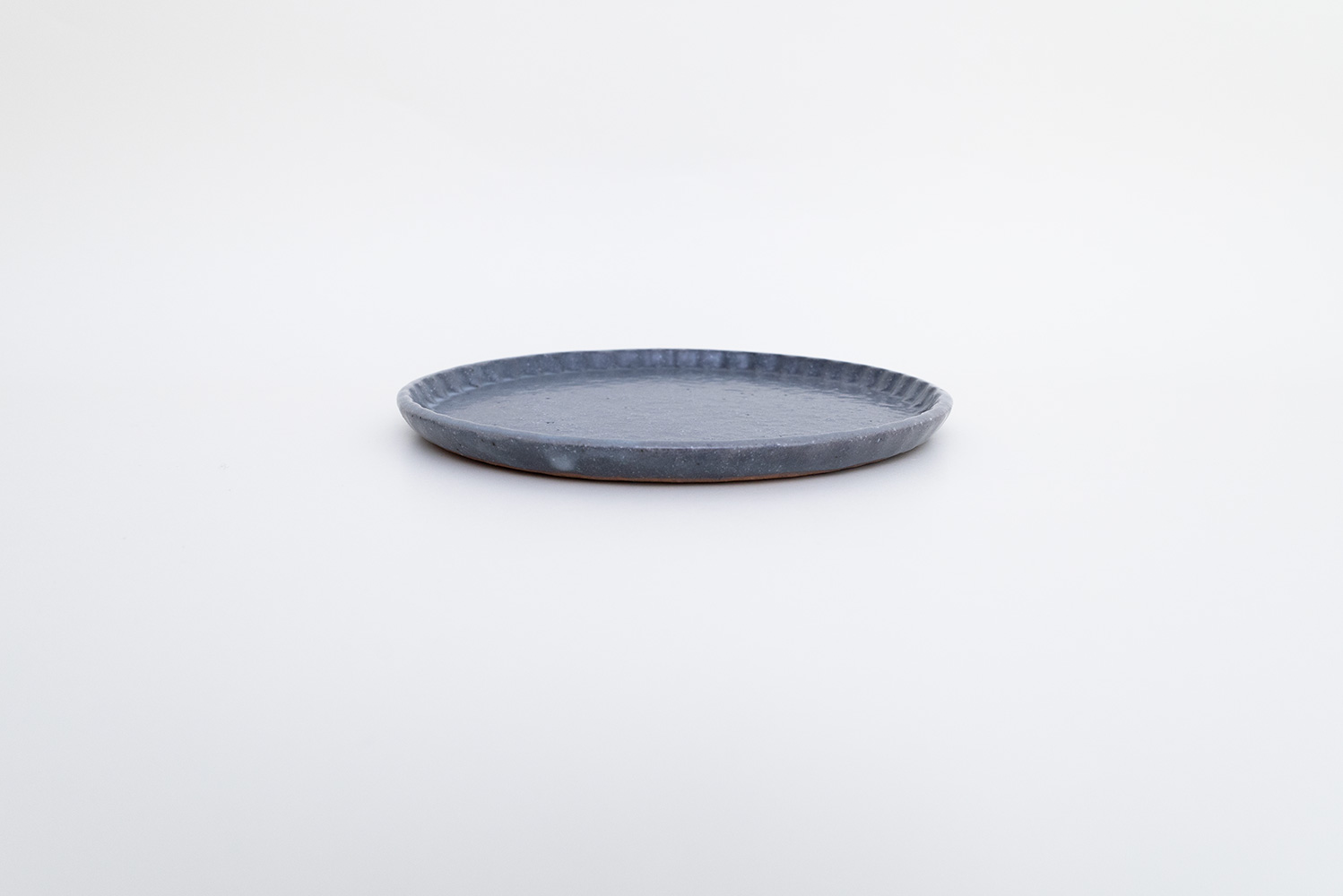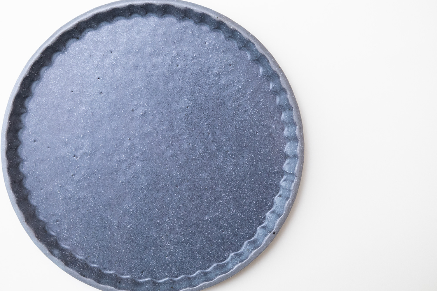 ゆとりあるフラットな形のプレートにフリルのような立ち上がりがあることで、見た目と使いやすさを実現した作品です。サイズはS(約5寸)、M(約7寸)の2サイズがございます。中間色のグレーは白っぽい色にも黒っぽい色にも合わせやすいうえ、ビビットなカラーの食材とも大変相性が良く、色味を問わず幅広くお使いいただけます。