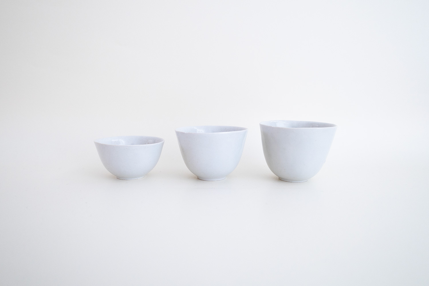 青磁の小さなカップです。限りなく白に近い薄いグレーと、手仕事の微妙な揺らぎが柔らかで優しい印象となっています。大、中、小の3種類がございます。
