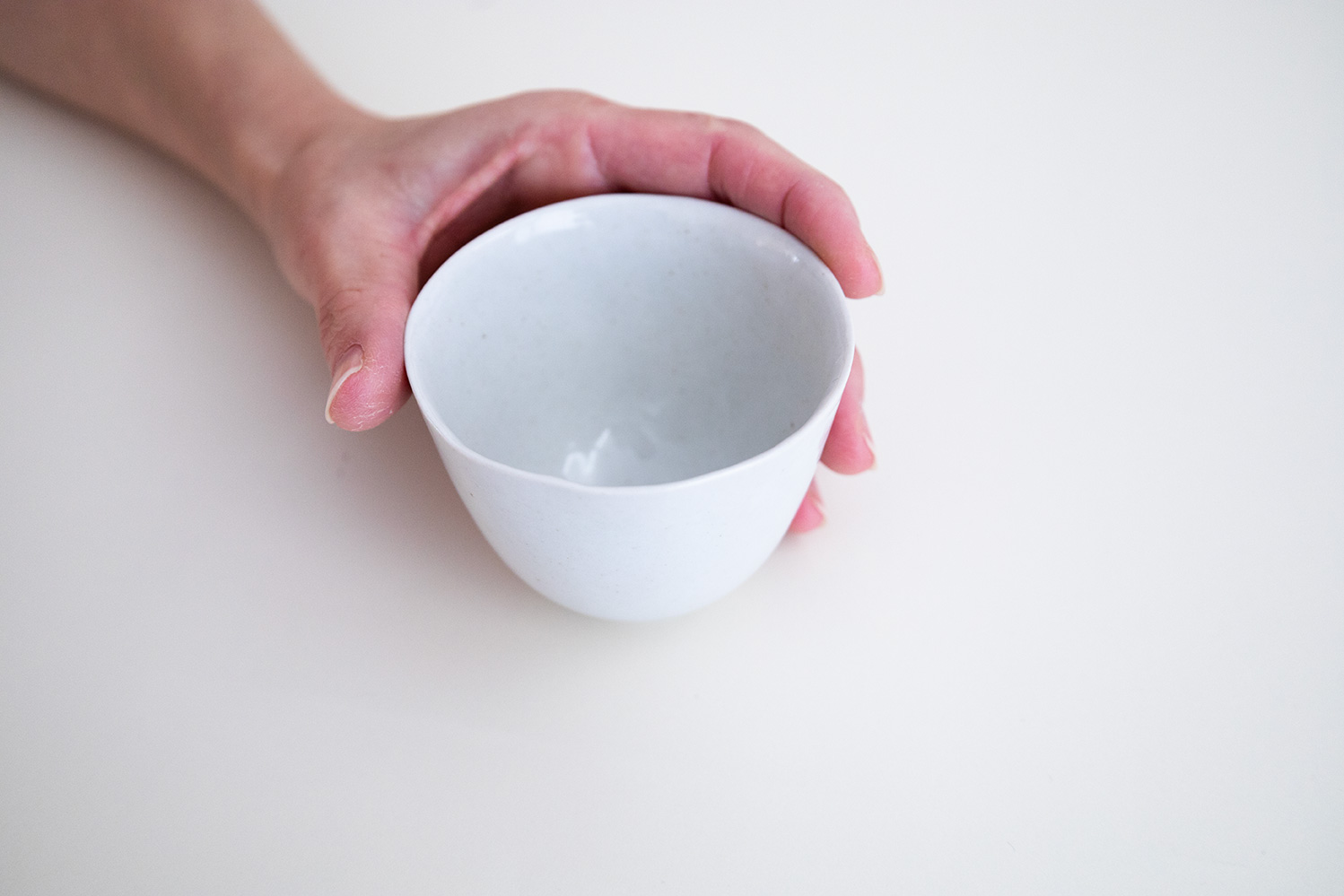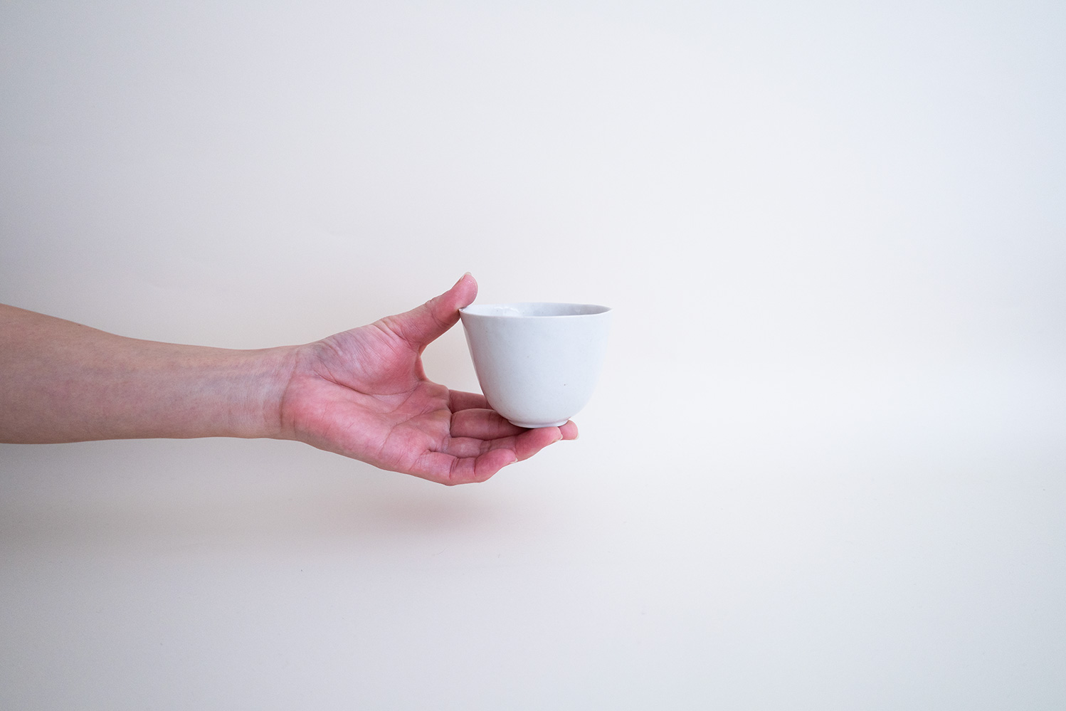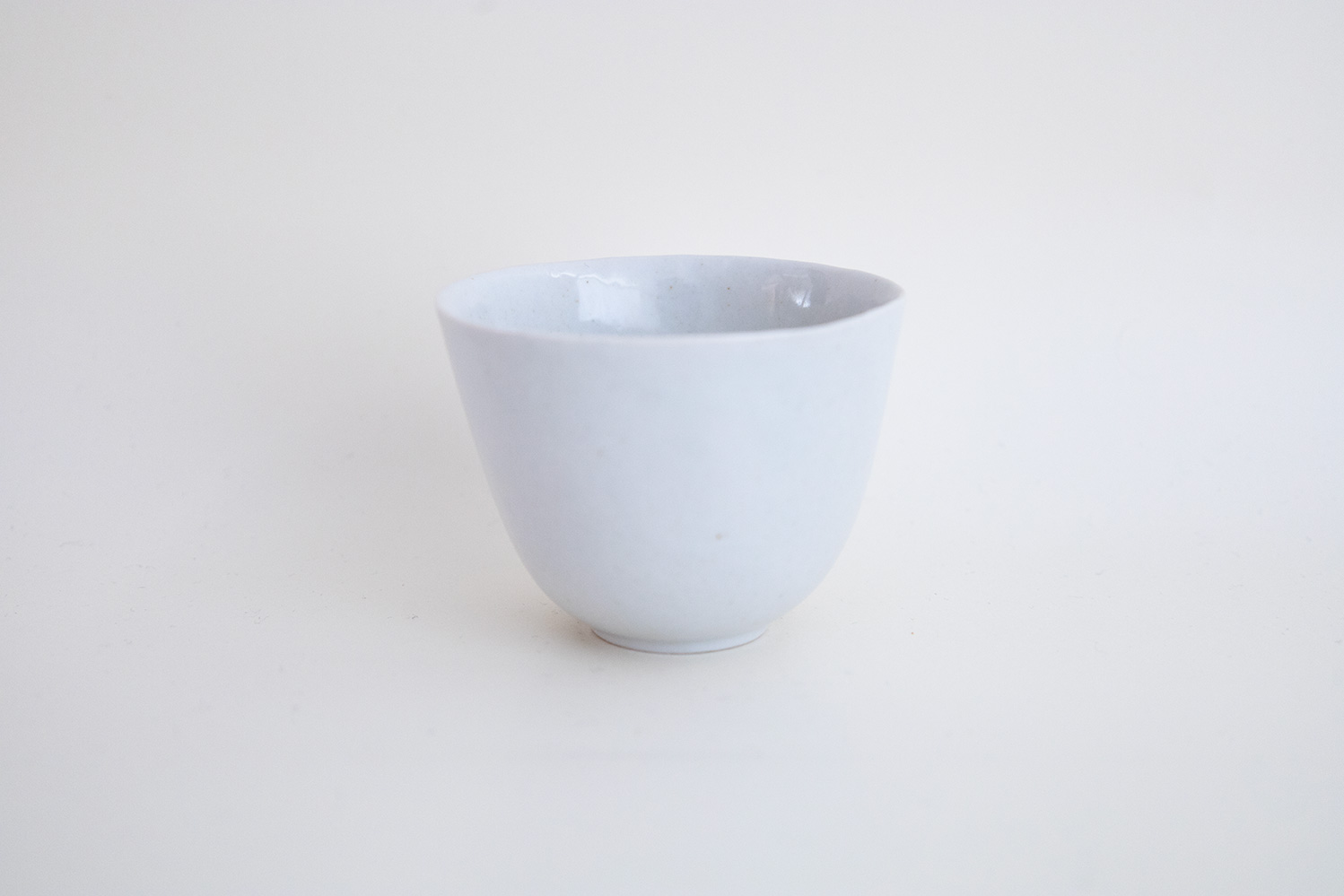 青磁の小さなカップです。限りなく白に近い薄いグレーと、手仕事の微妙な揺らぎが柔らかで優しい印象となっています。大、中、小の3種類がございます。
