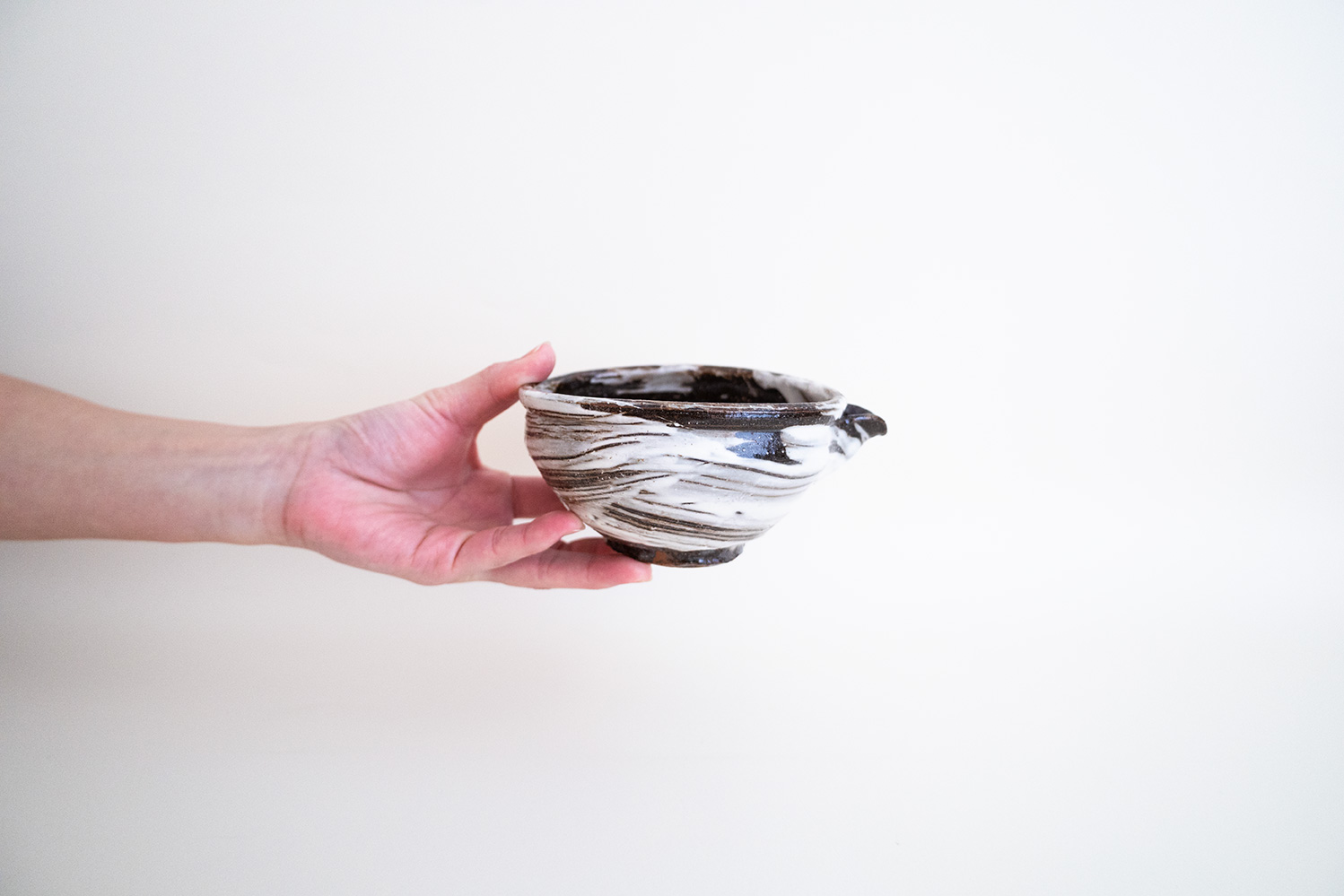 濃淡のハッキリした力強いタッチのダイナミックな刷毛目が目を引く片口です。酒器としてはもちろん、一品を盛り付ける小鉢としても素敵です。