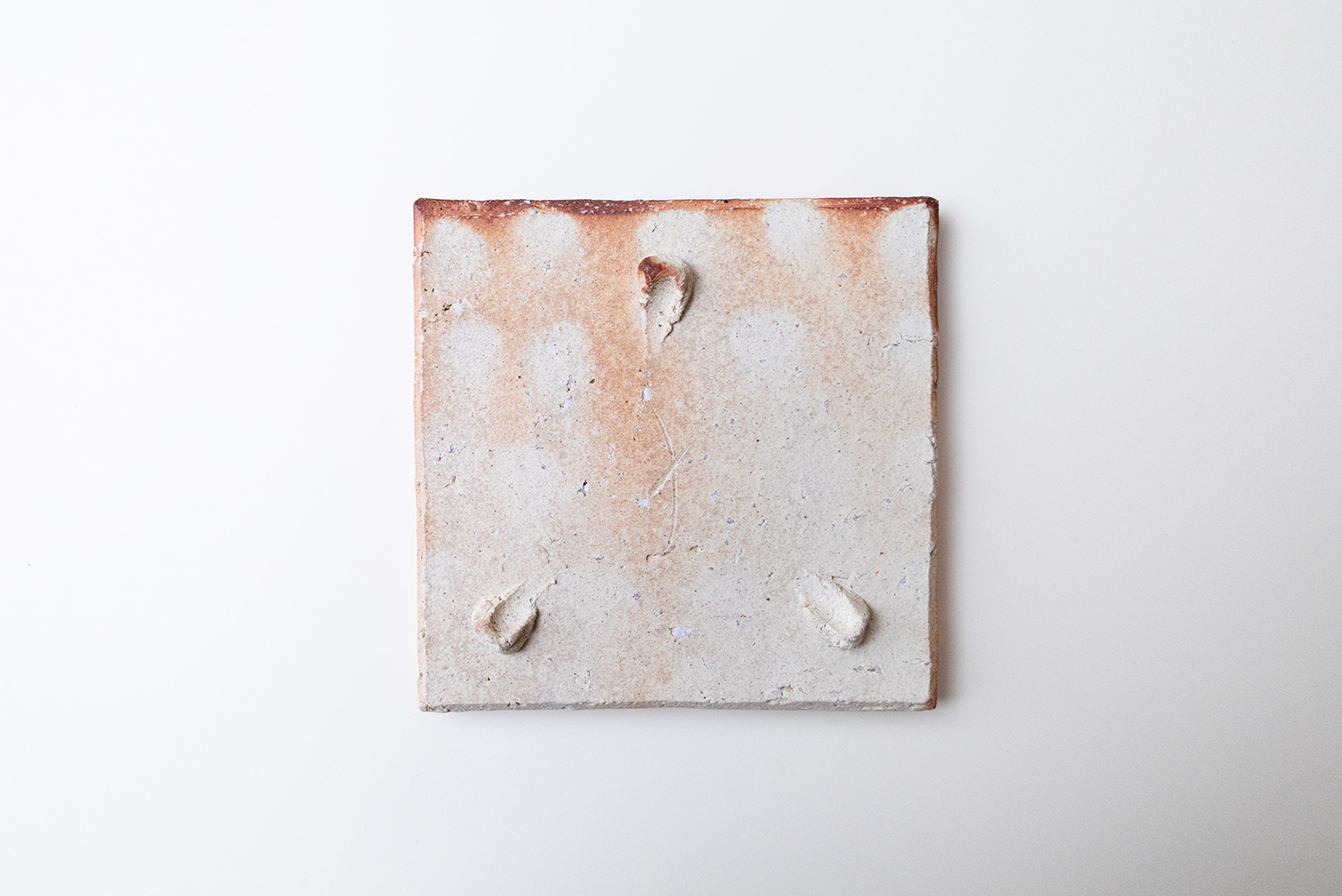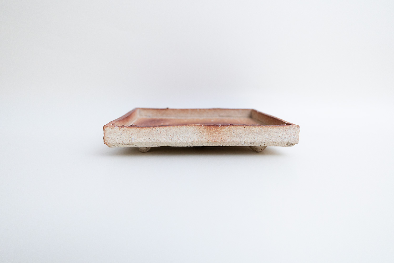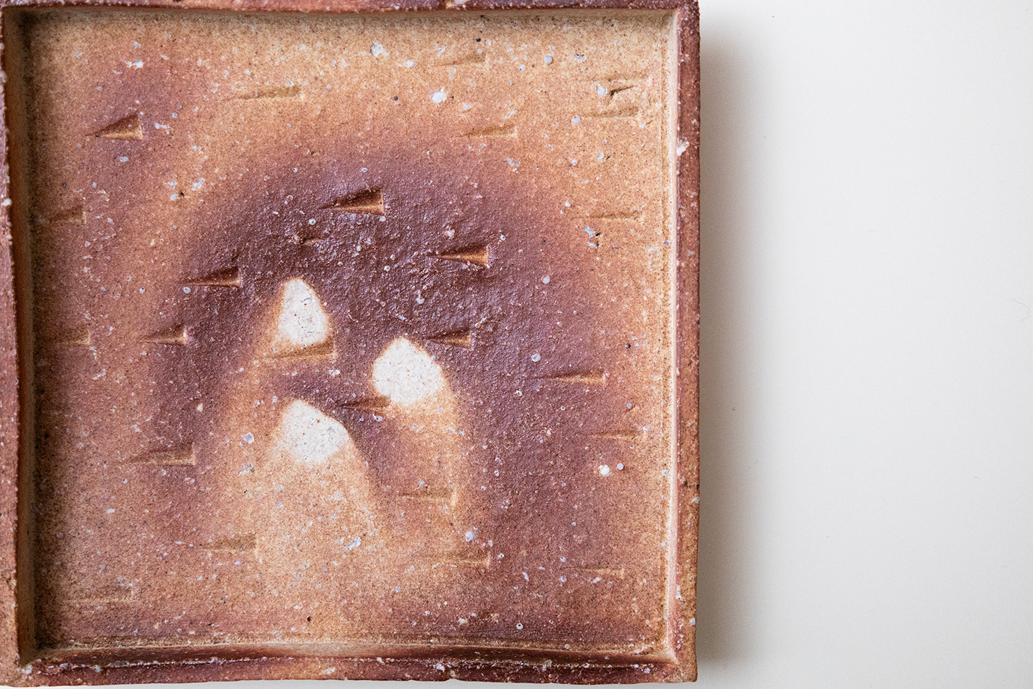 焼き〆の緋色に刻まれた紋様が印象的な角皿です。