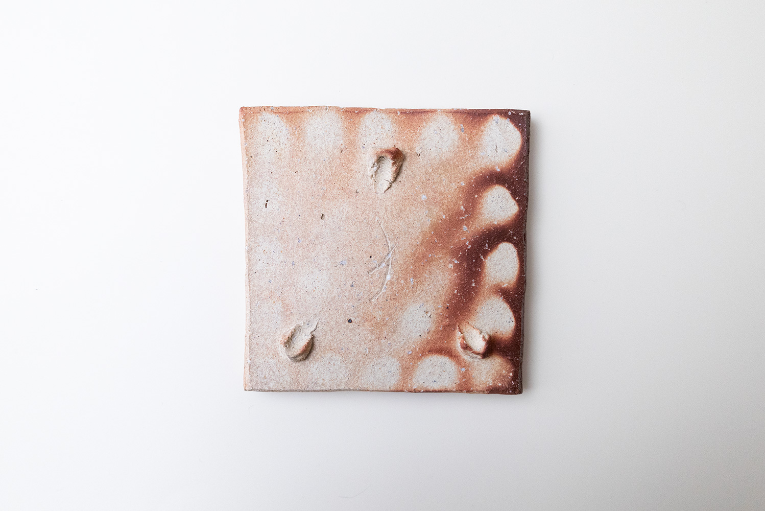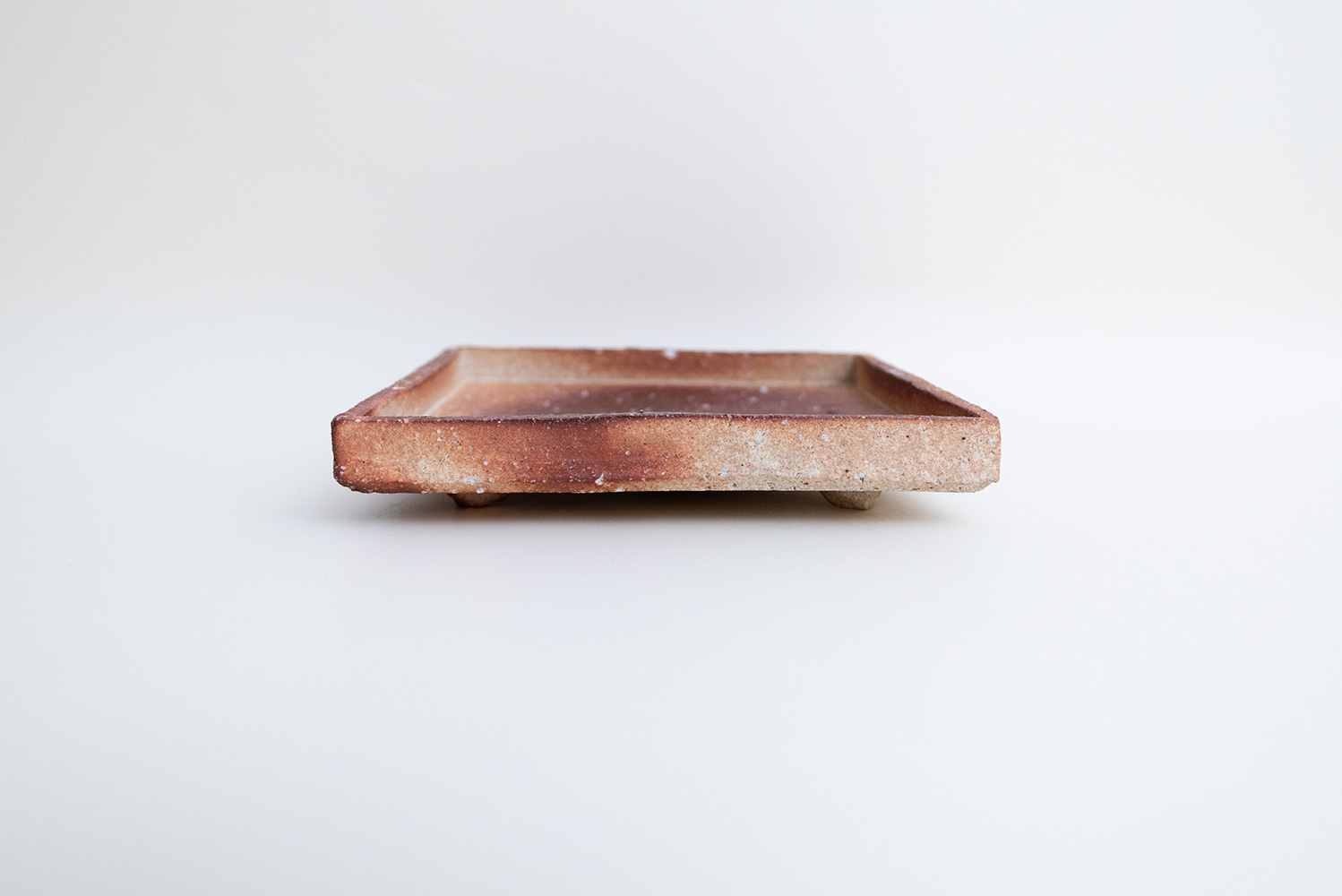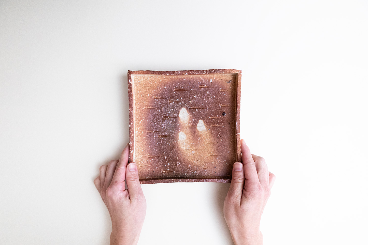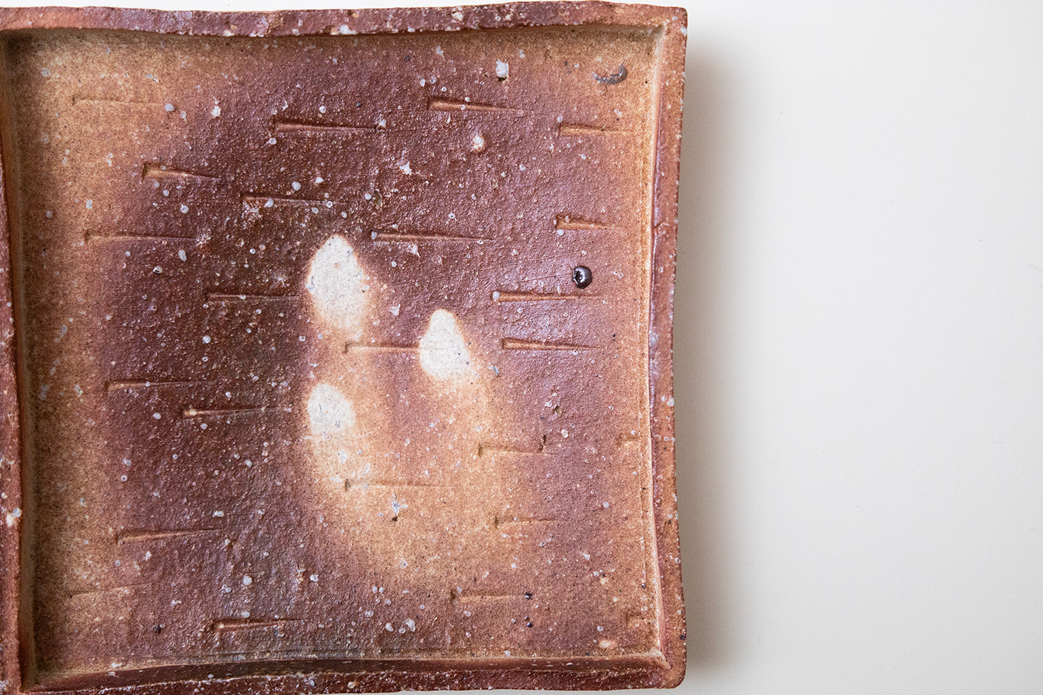 焼き〆の緋色に刻まれた紋様が印象的な角皿です。