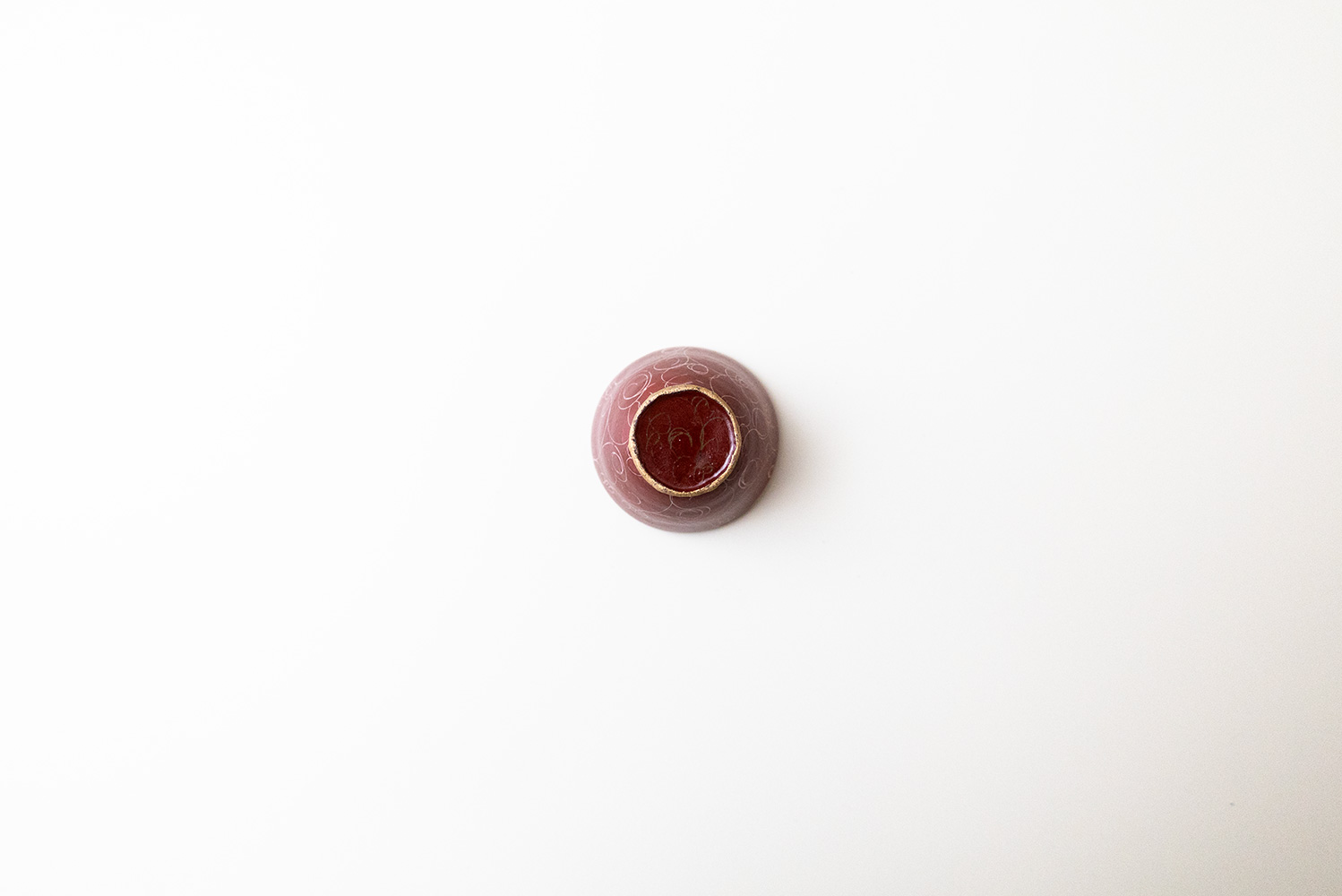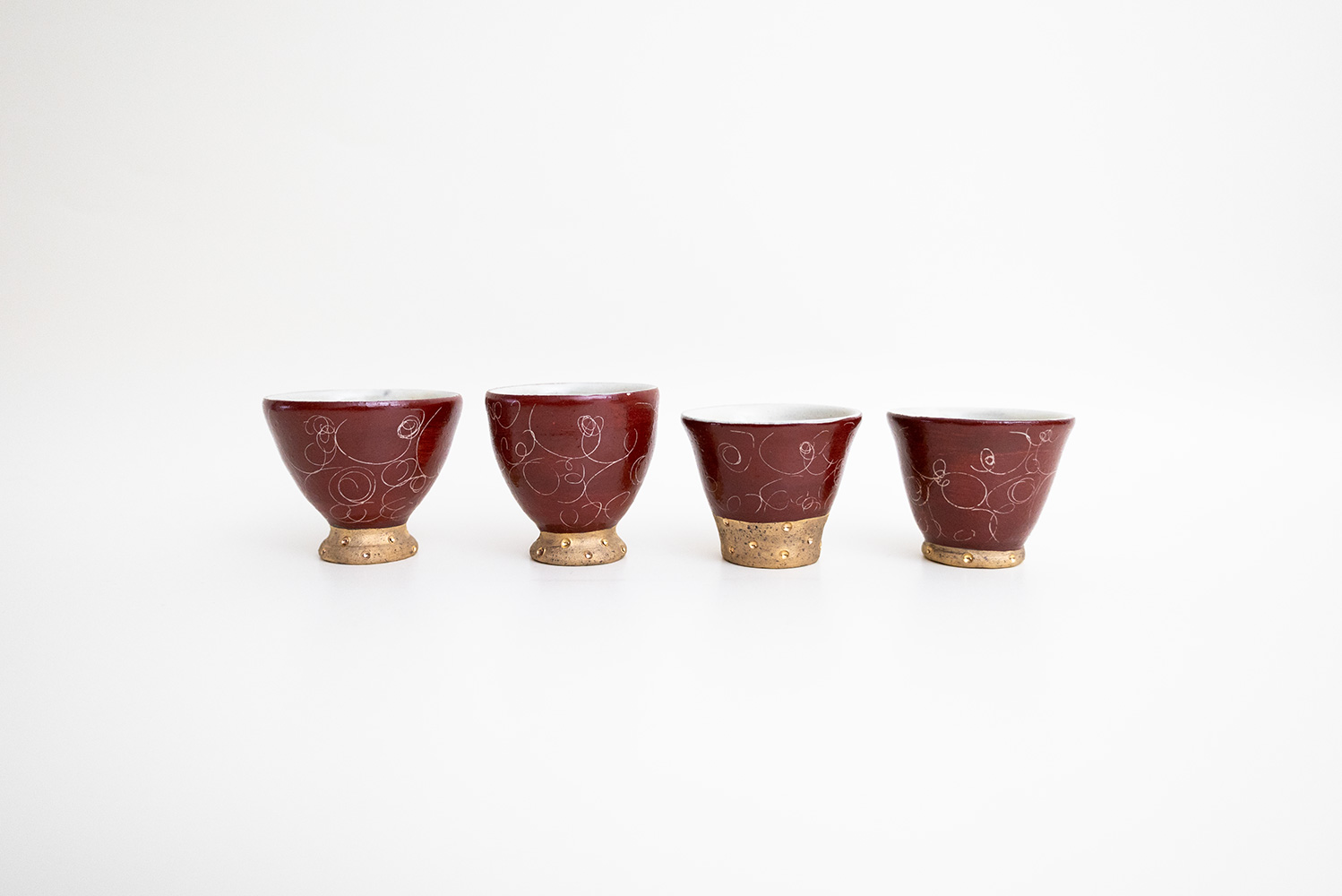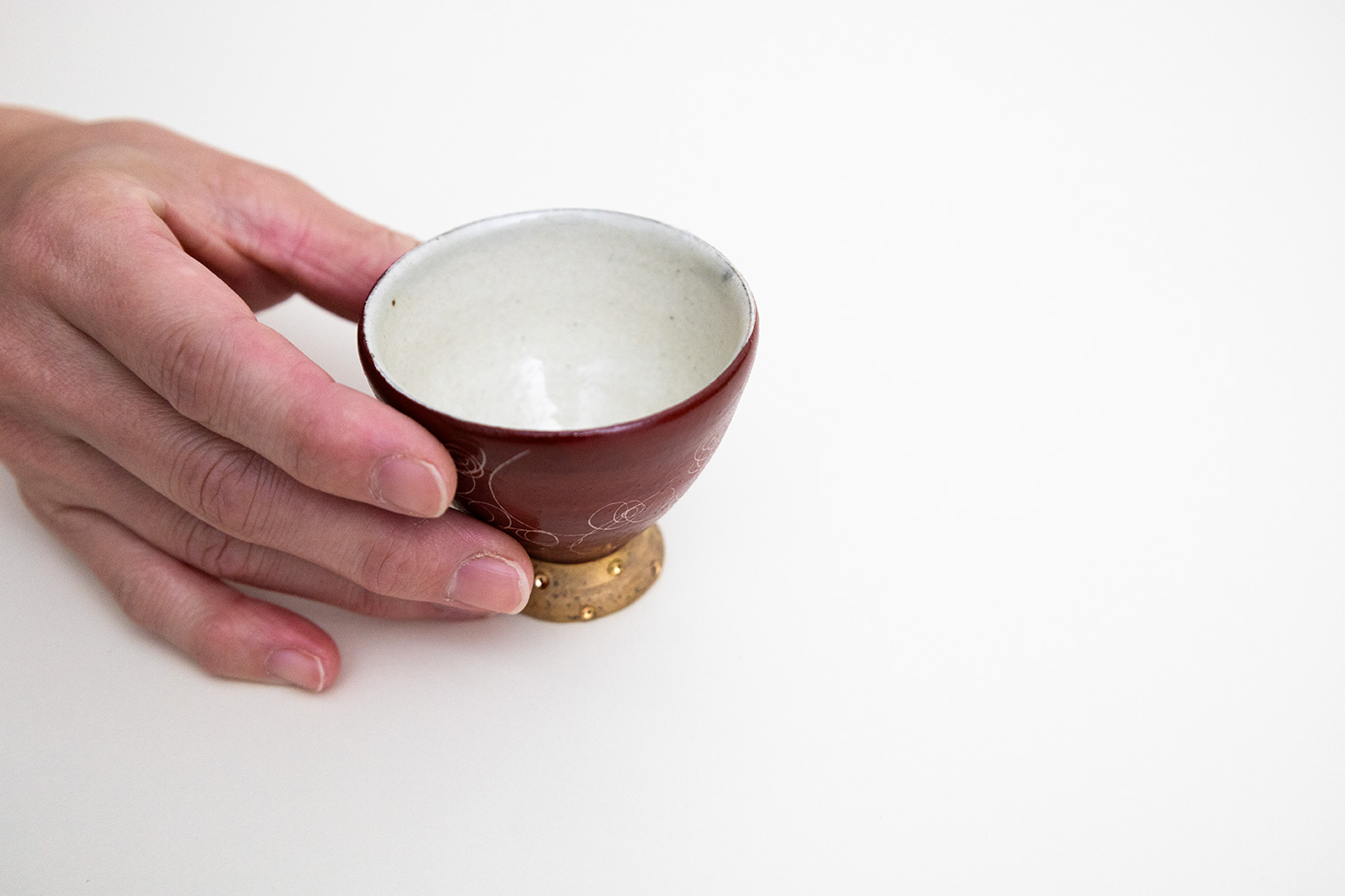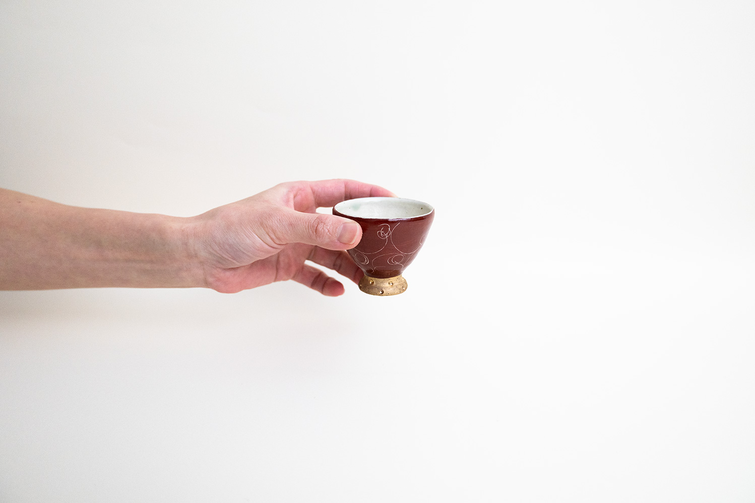 赤色と金色が美しい盃です。ドットの入った金彩部分により上品さと高級感がさらに増しています。底面も赤い釉薬がかけられており、その丁寧な仕事ぶりを感じることができます。掻き落としで描かれる細く繊細なラインが美しい松本さん定番の赤巻シリーズ。見れば見るほどにその線の描き方に魅了されます。