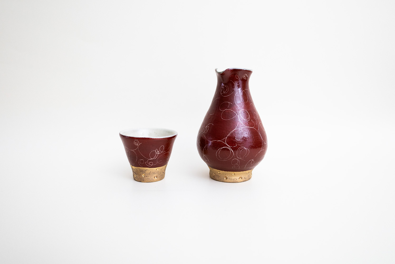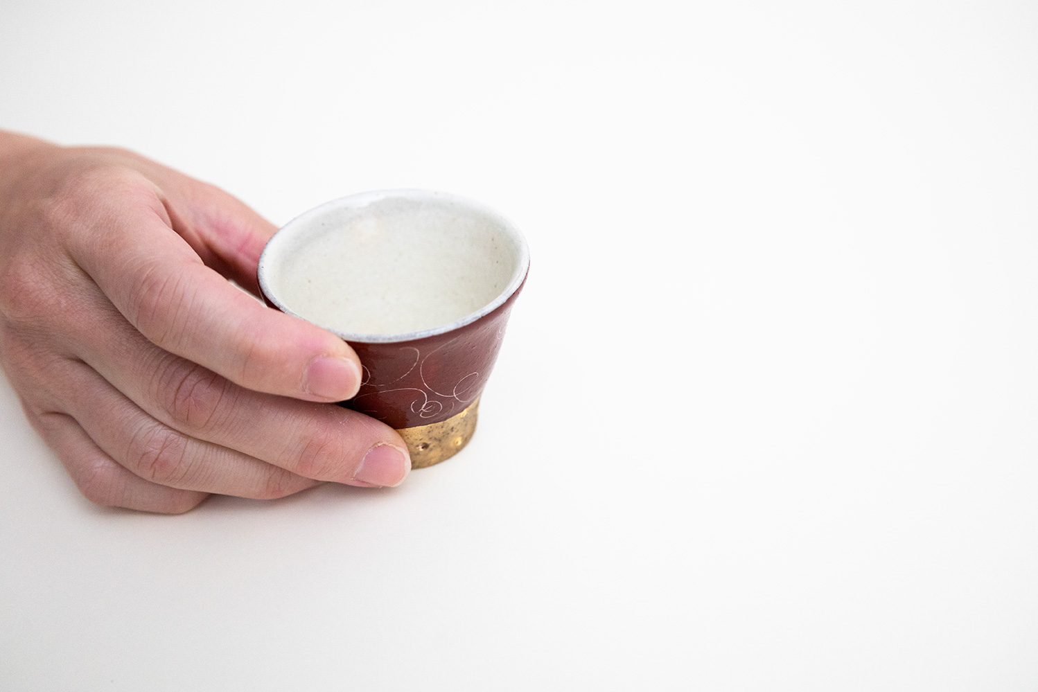 赤色と金色が美しい盃です。ドットの入った金彩部分により上品さと高級感がさらに増しています。底面も赤い釉薬がかけられており、その丁寧な仕事ぶりを感じることができます。掻き落としで描かれる細く繊細なラインが美しい松本さん定番の赤巻シリーズ。見れば見るほどにその線の描き方に魅了されます。