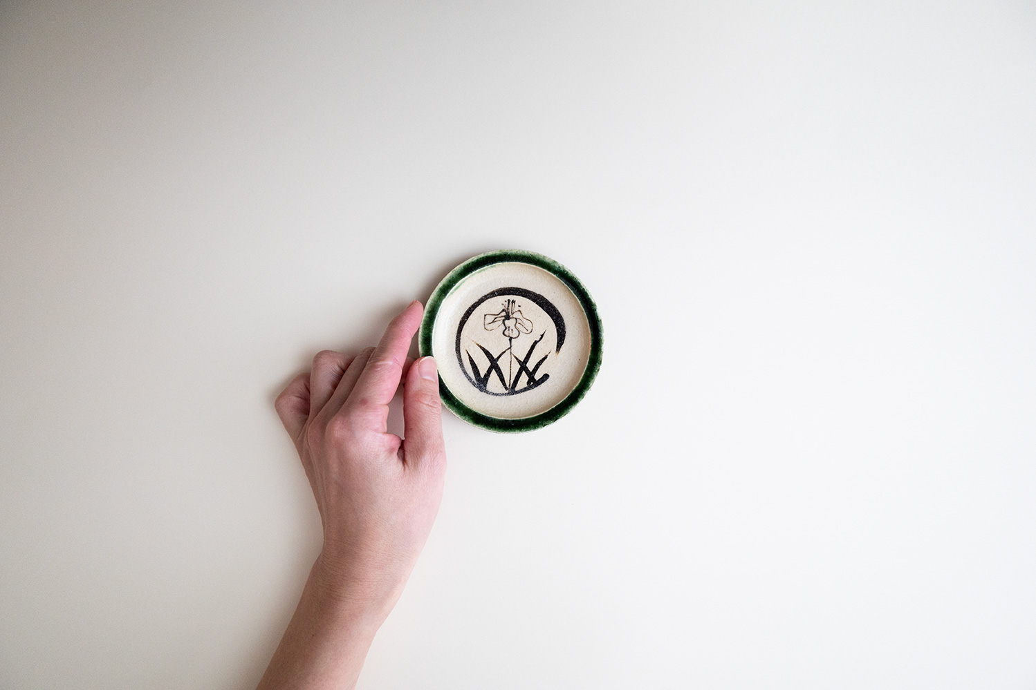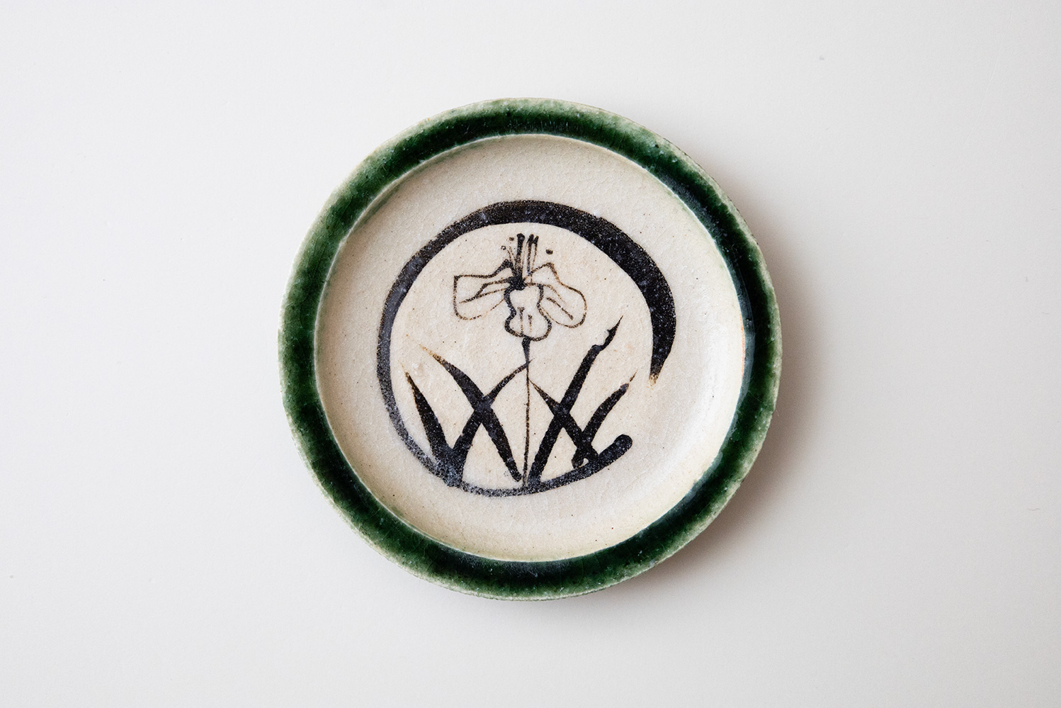 深い緑が美しい織部。一つ一つ丁寧に描かれた澤さんならではの絵柄と古典的な絵柄が見事に調和した豆皿です。